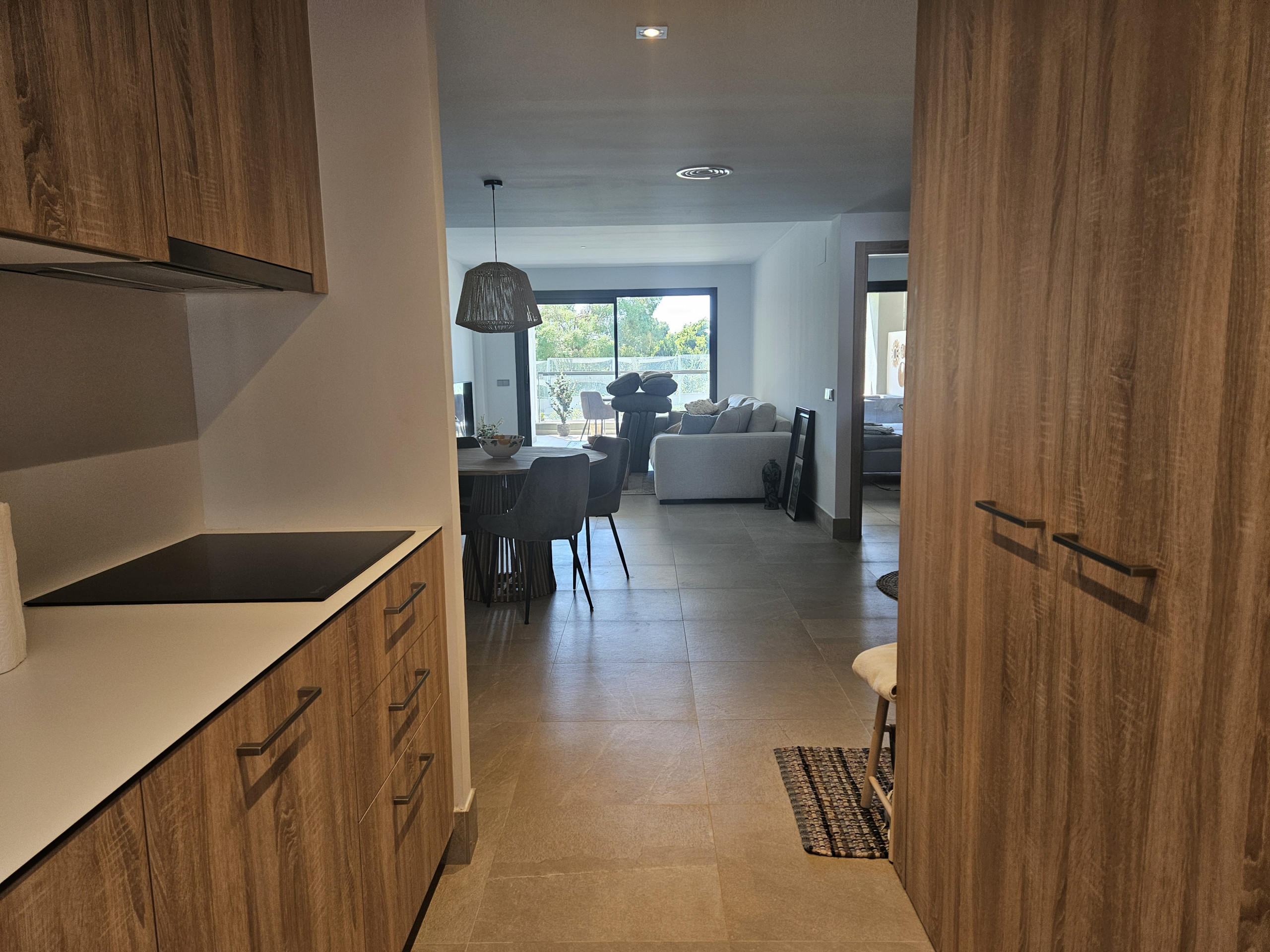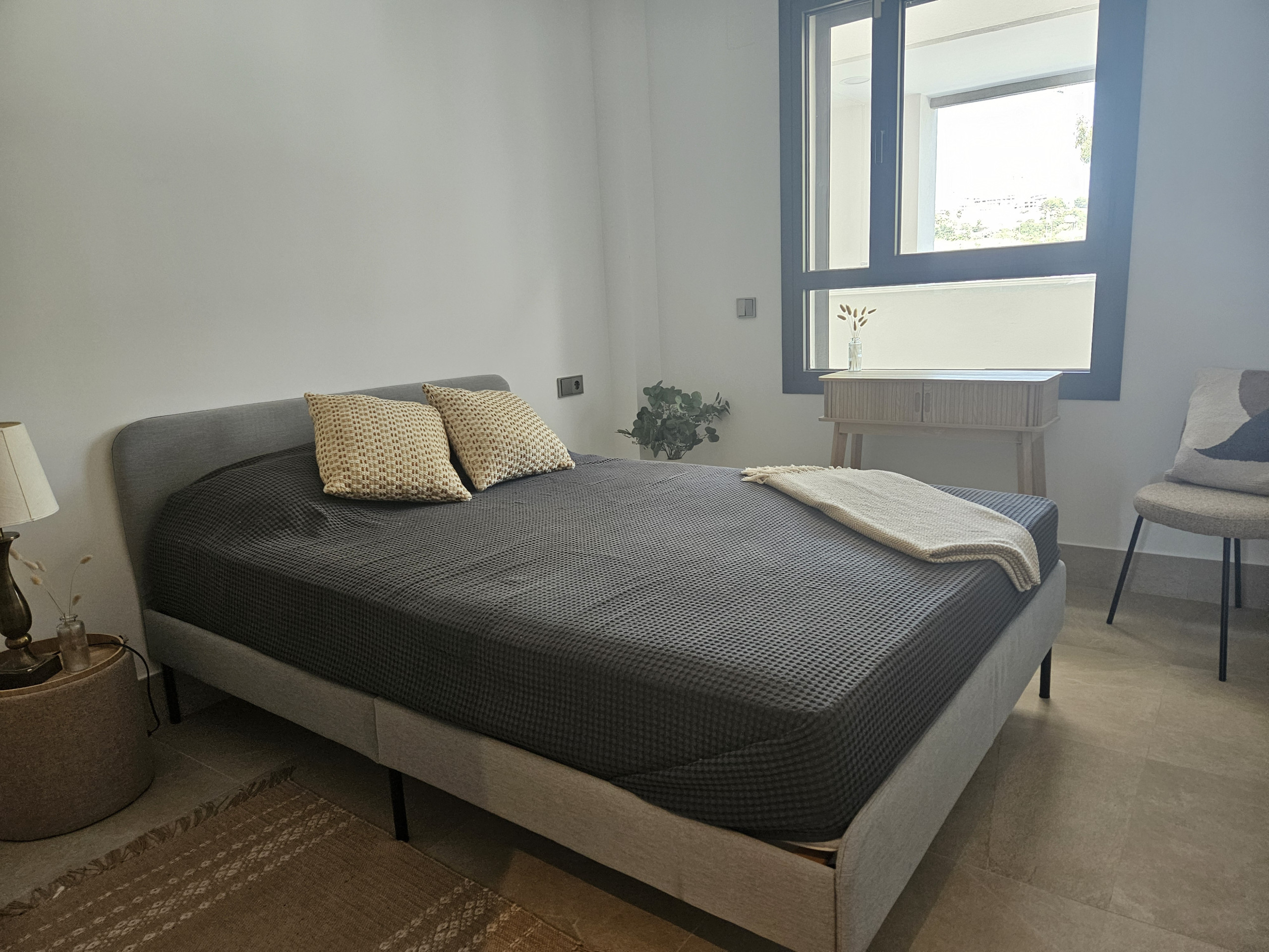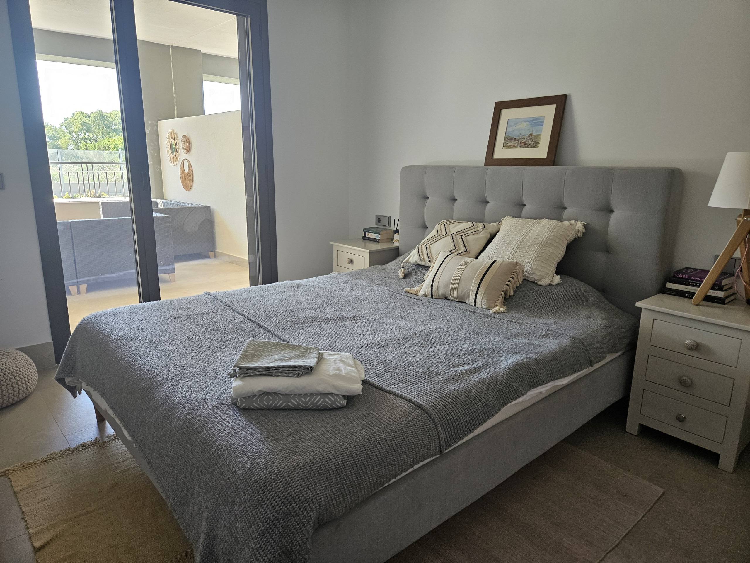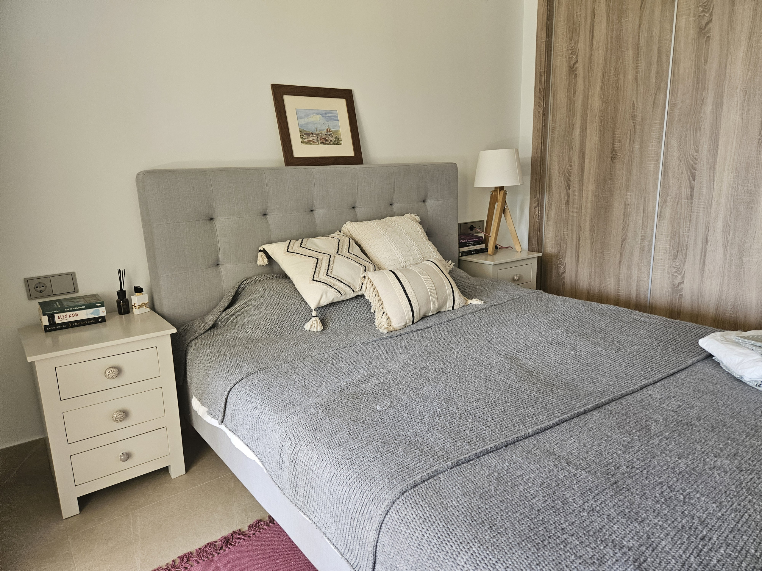 Este apartamento de dos dormitorios está distribuido en un solo nivel en la planta baja y está amueblado con mucho gusto. Entre al apartamento en el amplio espacio de estar de planta abierta. El área de asientos del comedor tiene capacidad para hasta ocho personas. Puede disfrutar del gran sofá en forma de L en el área de estar, junto con el televisor inteligente de 65 pulgadas con Amazon Firestick. Desde el salón puede salir a la terraza, que tiene impresionantes vistas al mar, montañas y campo. Aquí encontrará un sofá de estar, sillas y mesa de café, además de tumbonas.