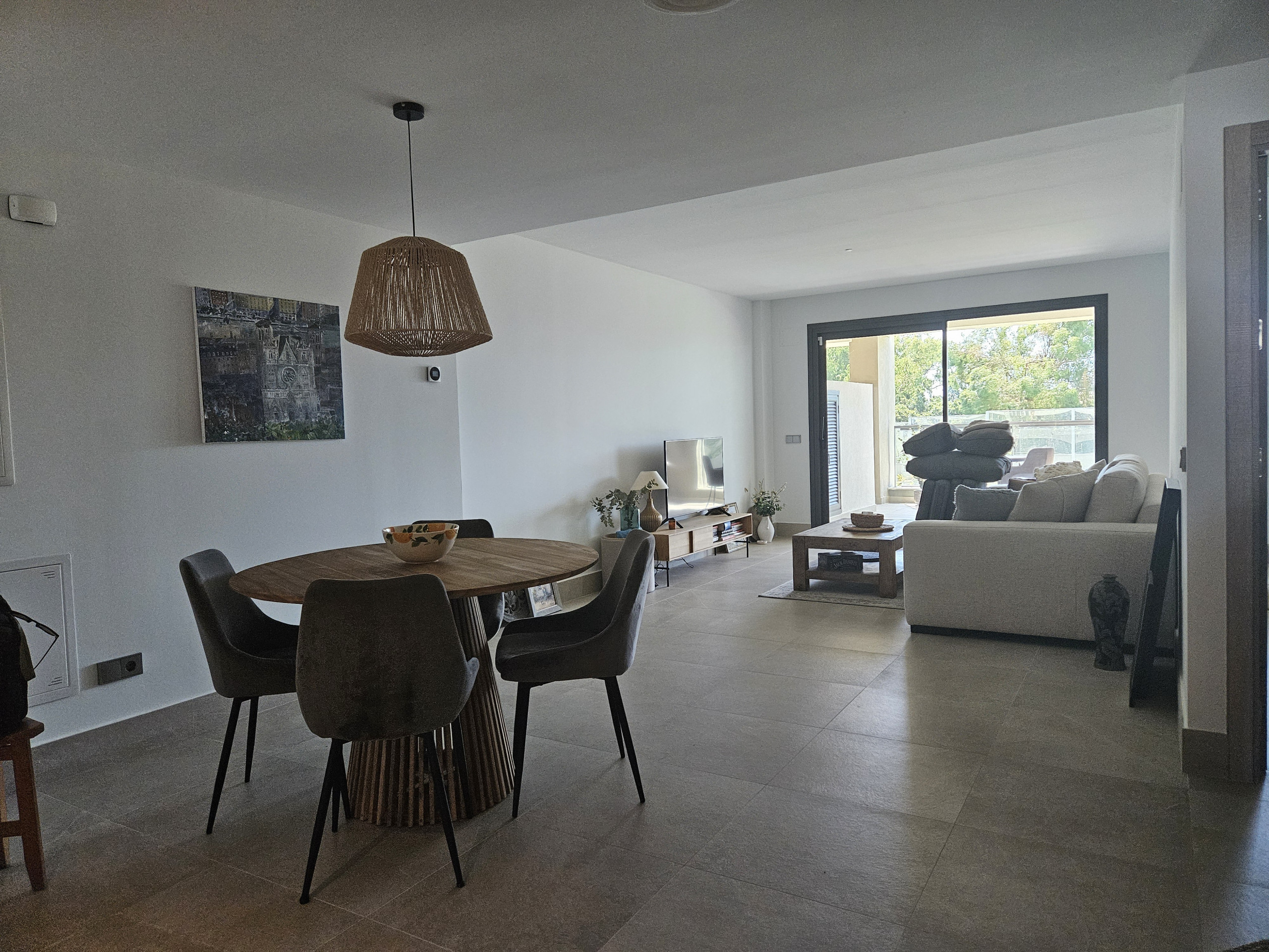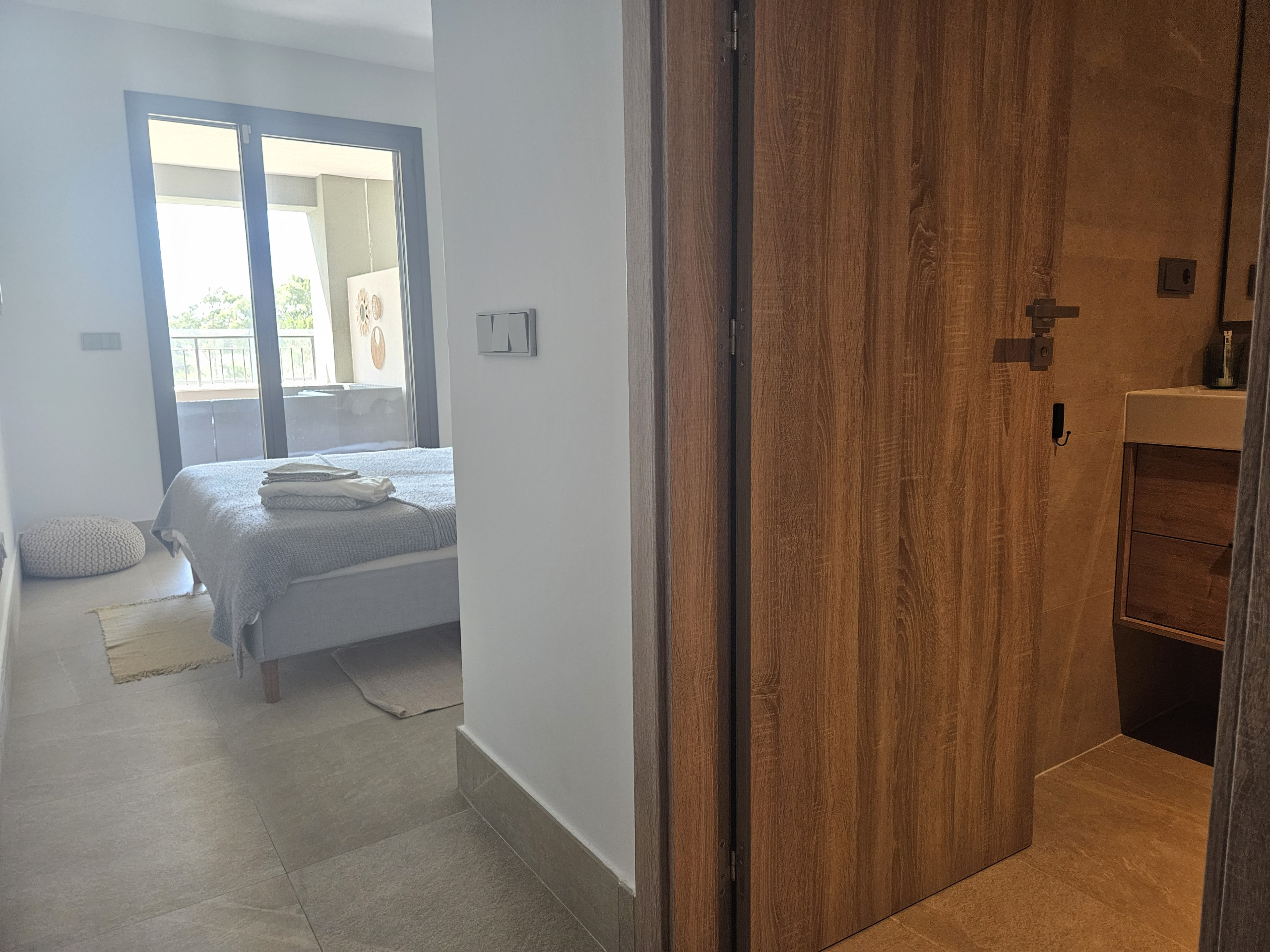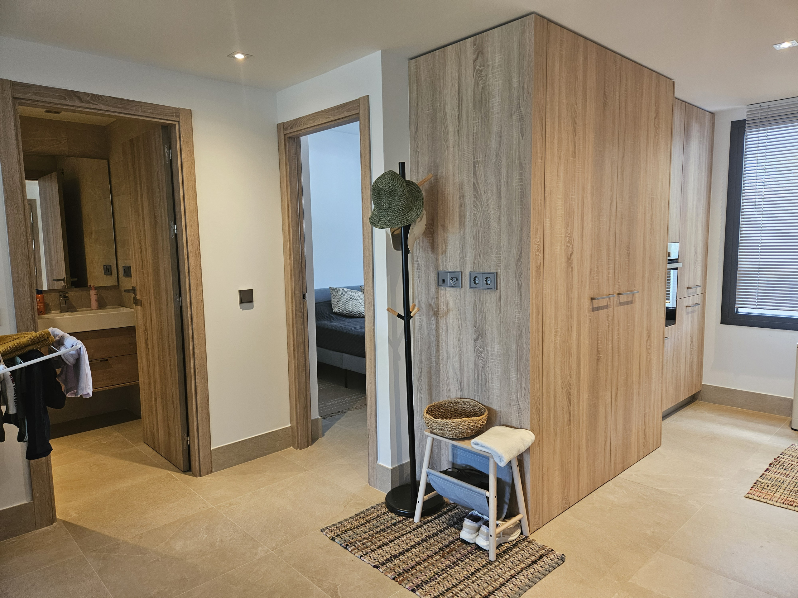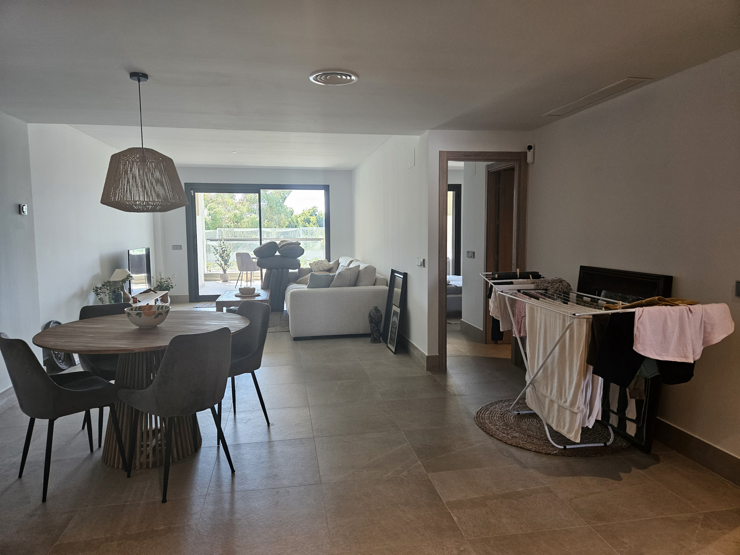 Este apartamento de dos dormitorios está distribuido en un solo nivel en la planta baja y está amueblado con mucho gusto. Entre al apartamento en el amplio espacio de estar de planta abierta. El área de asientos del comedor tiene capacidad para hasta ocho personas. Puede disfrutar del gran sofá en forma de L en el área de estar, junto con el televisor inteligente de 65 pulgadas con Amazon Firestick. Desde el salón puede salir a la terraza, que tiene impresionantes vistas al mar, montañas y campo. Aquí encontrará un sofá de estar, sillas y mesa de café, además de tumbonas.