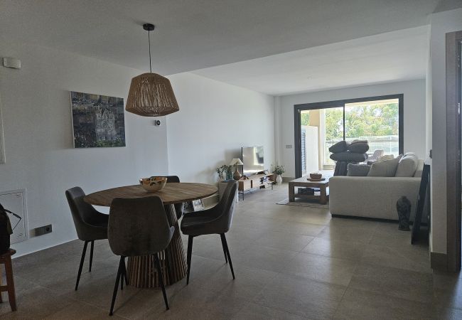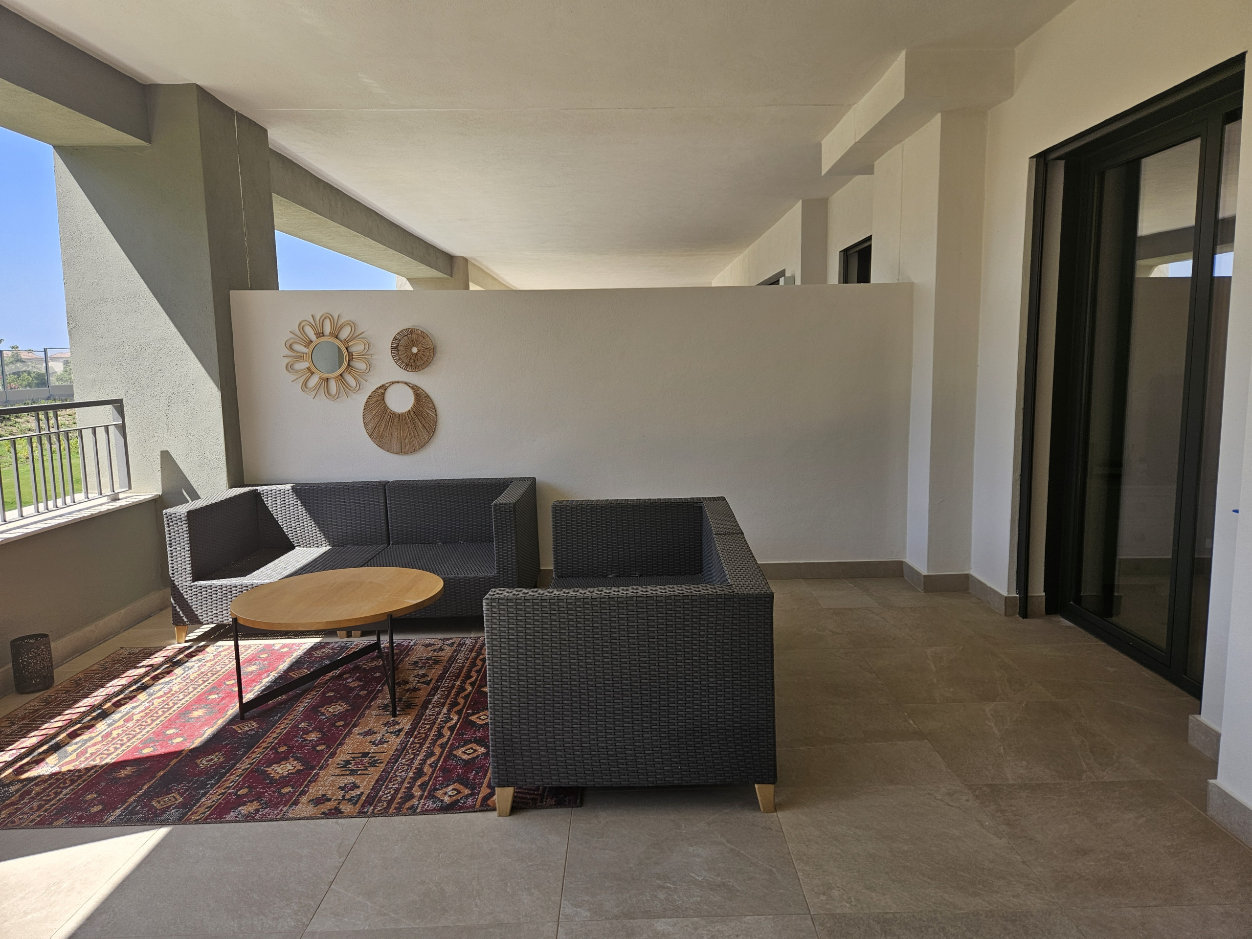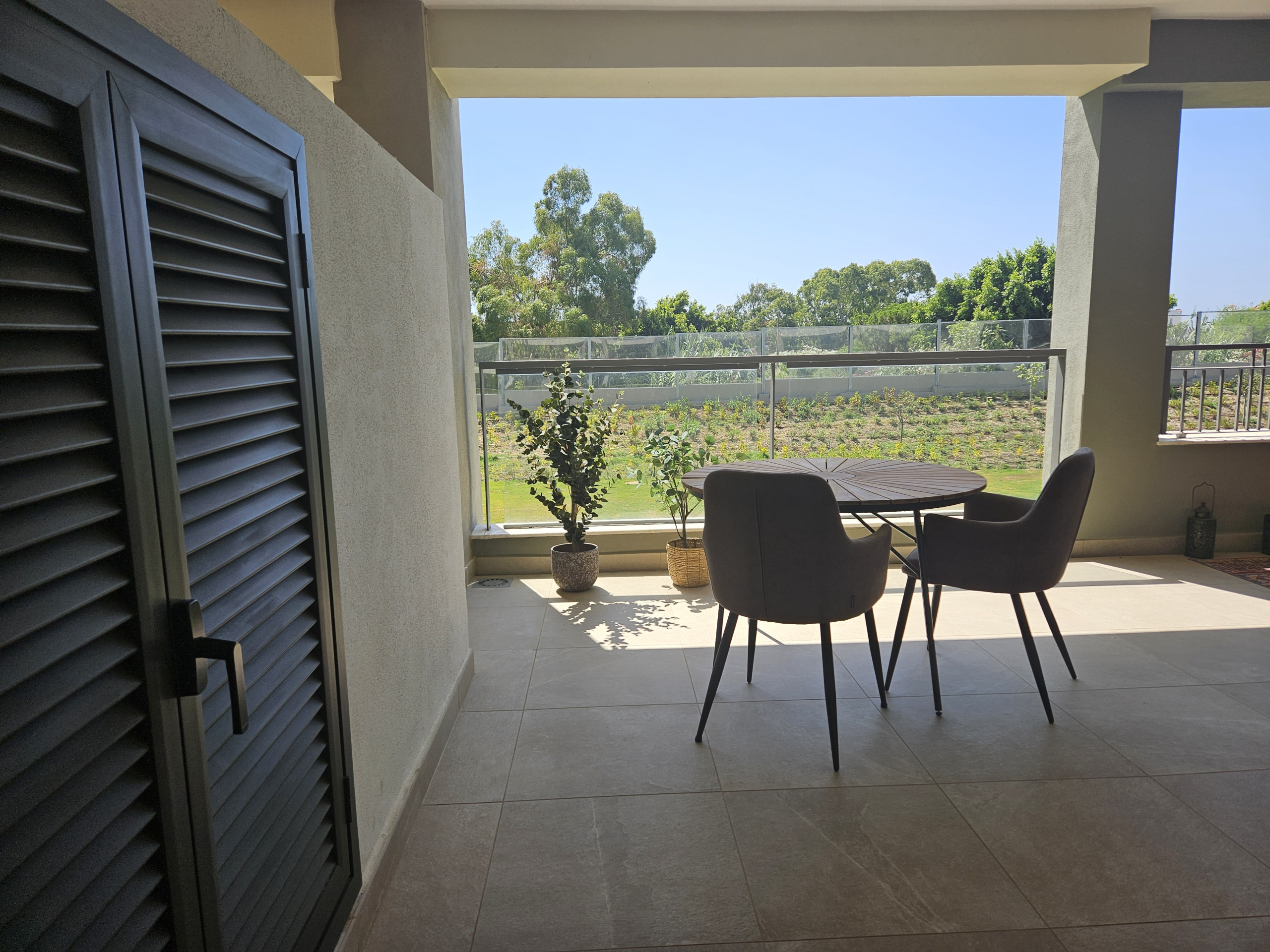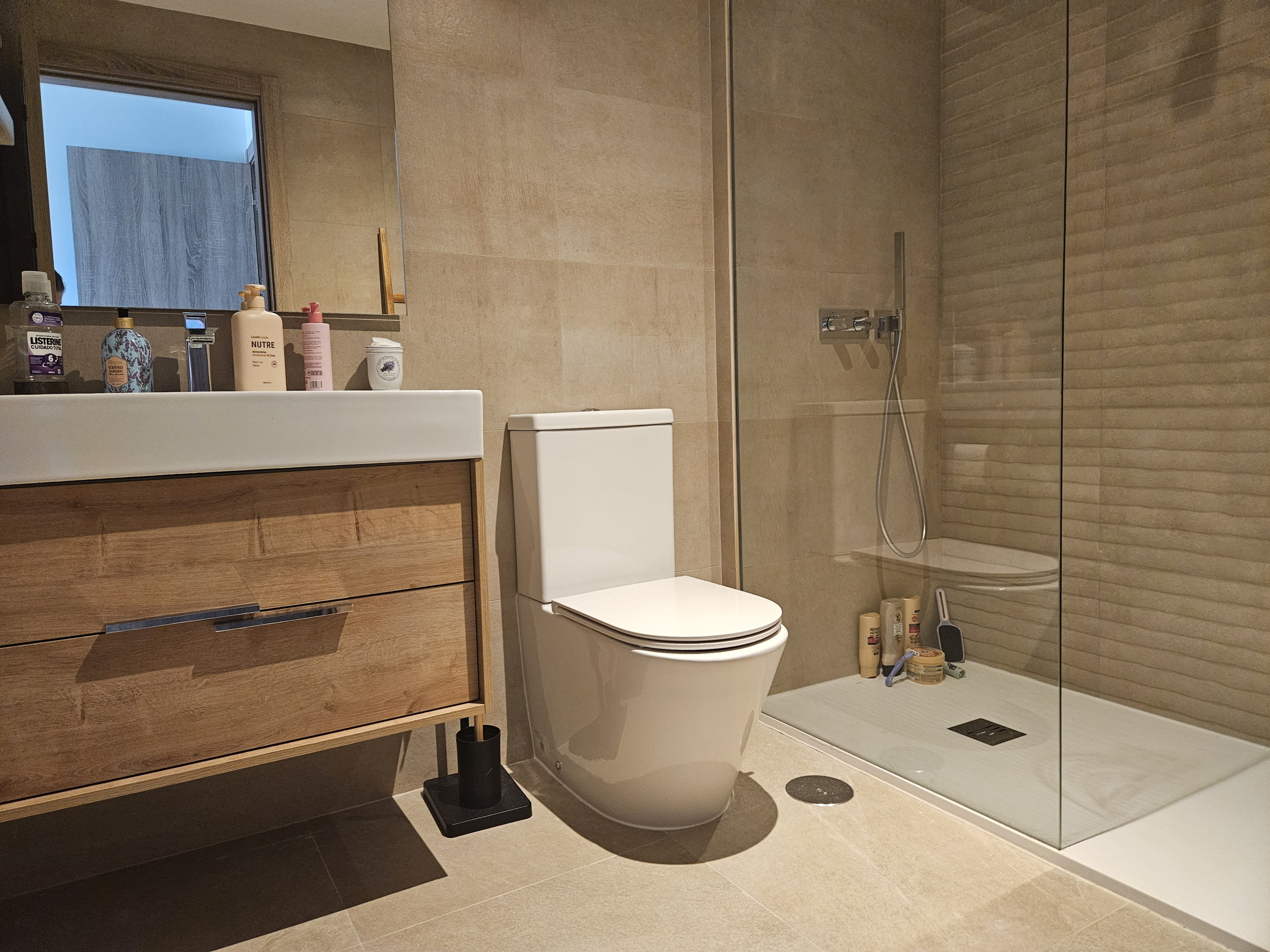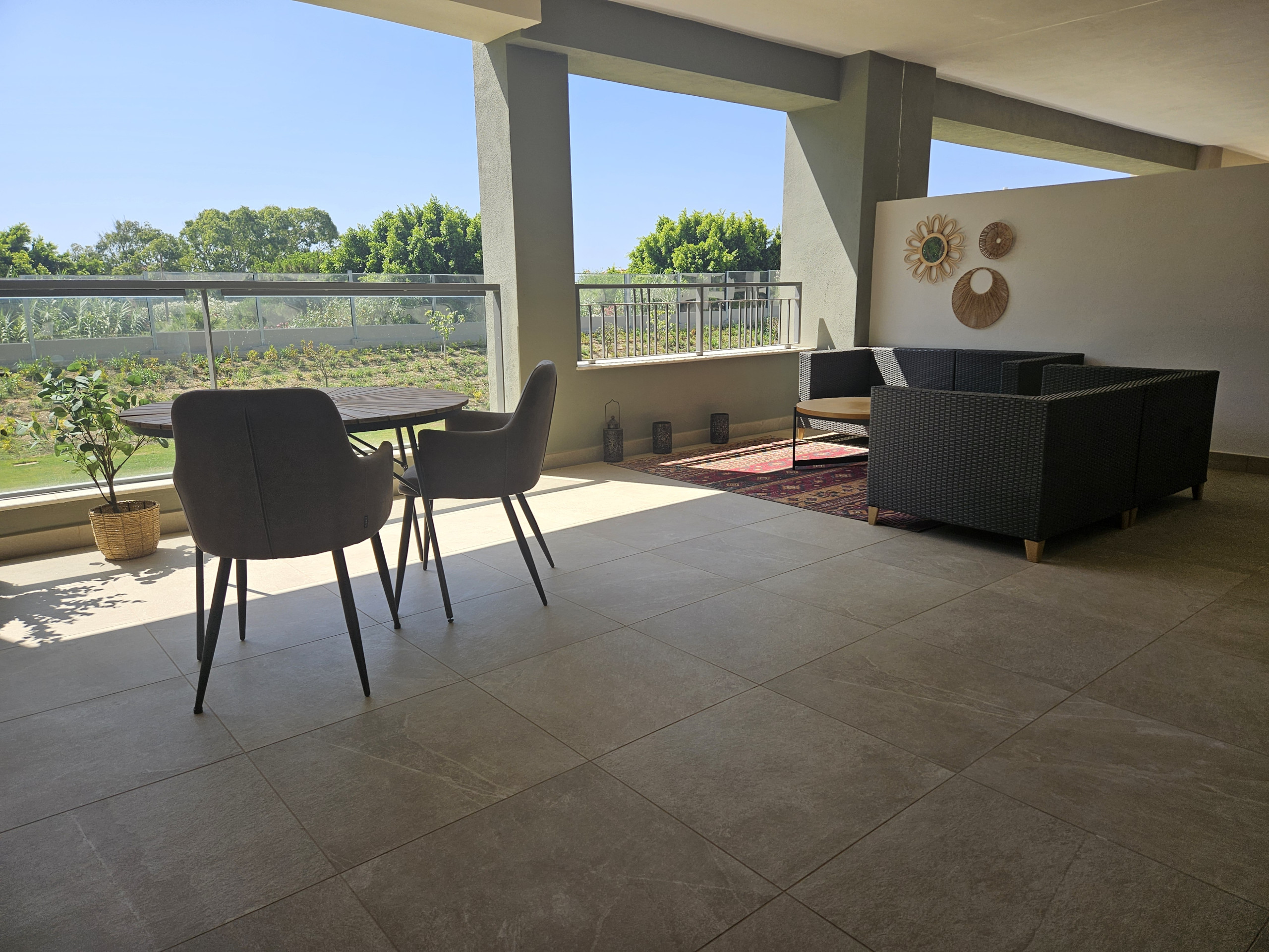 Este apartamento de dos dormitorios está distribuido en un solo nivel en la planta baja y está amueblado con mucho gusto. Entre al apartamento en el amplio espacio de estar de planta abierta. El área de asientos del comedor tiene capacidad para hasta ocho personas. Puede disfrutar del gran sofá en forma de L en el área de estar, junto con el televisor inteligente de 65 pulgadas con Amazon Firestick. Desde el salón puede salir a la terraza, que tiene impresionantes vistas al mar, montañas y campo. Aquí encontrará un sofá de estar, sillas y mesa de café, además de tumbonas.