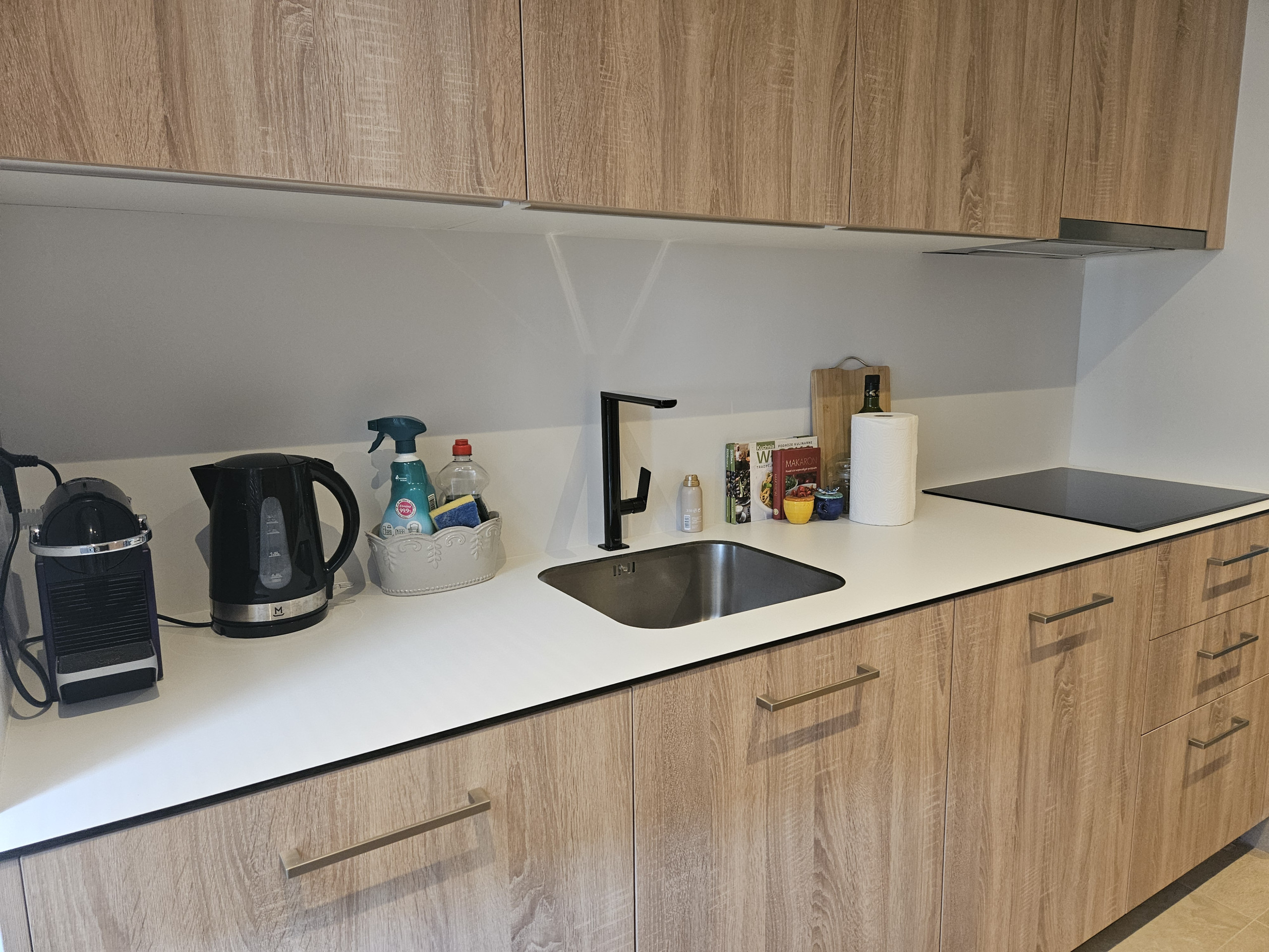 La cocina americana, eléctrica, está equipada con nevera, horno, congelador, lavavajillas, vajilla/cubertería, utensilios/cocina, cafetera y hervidor de agua.