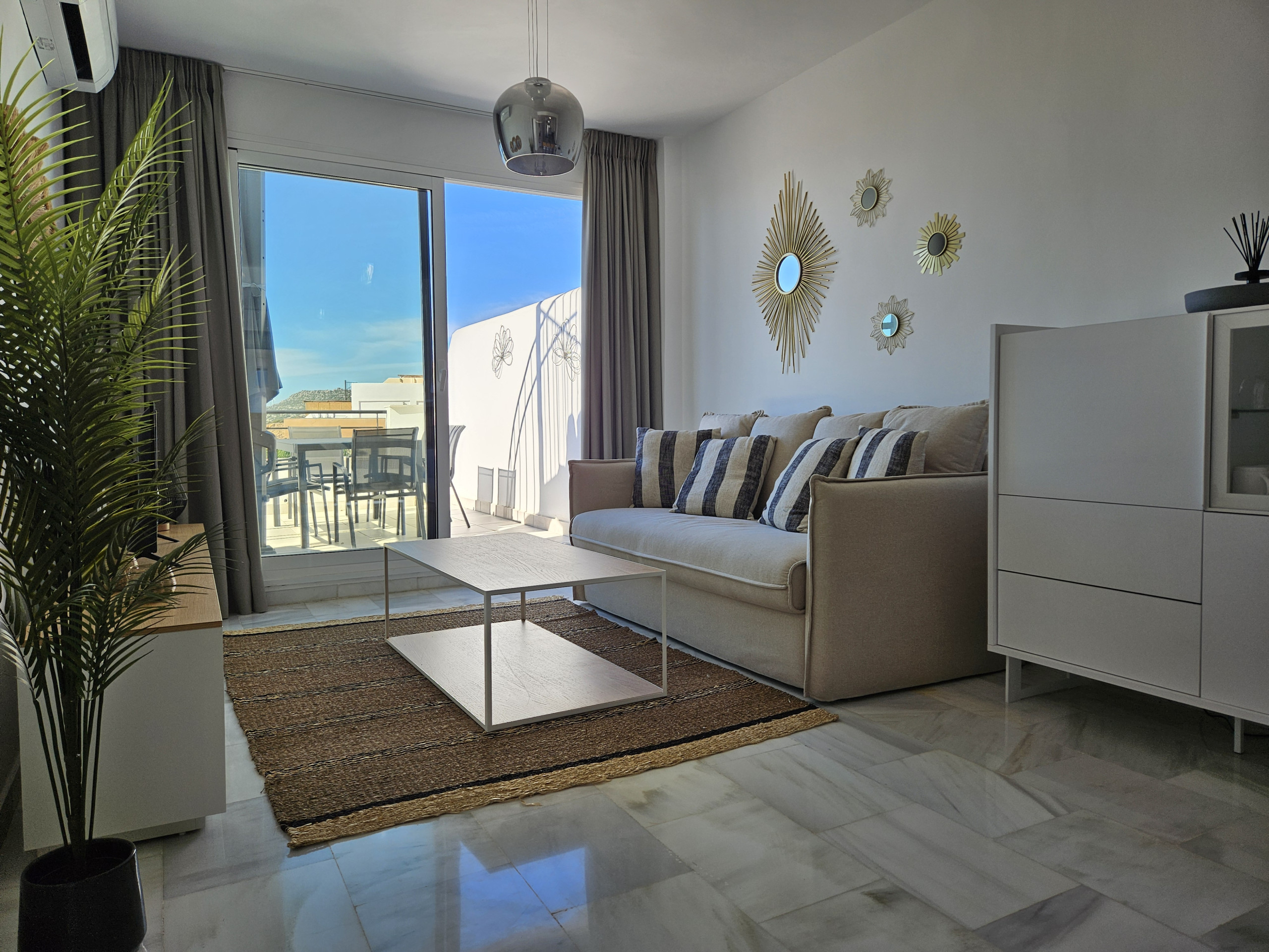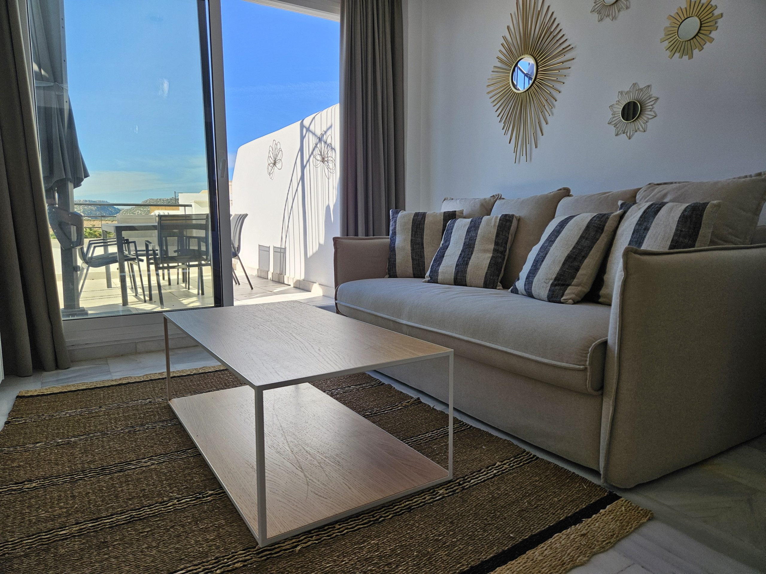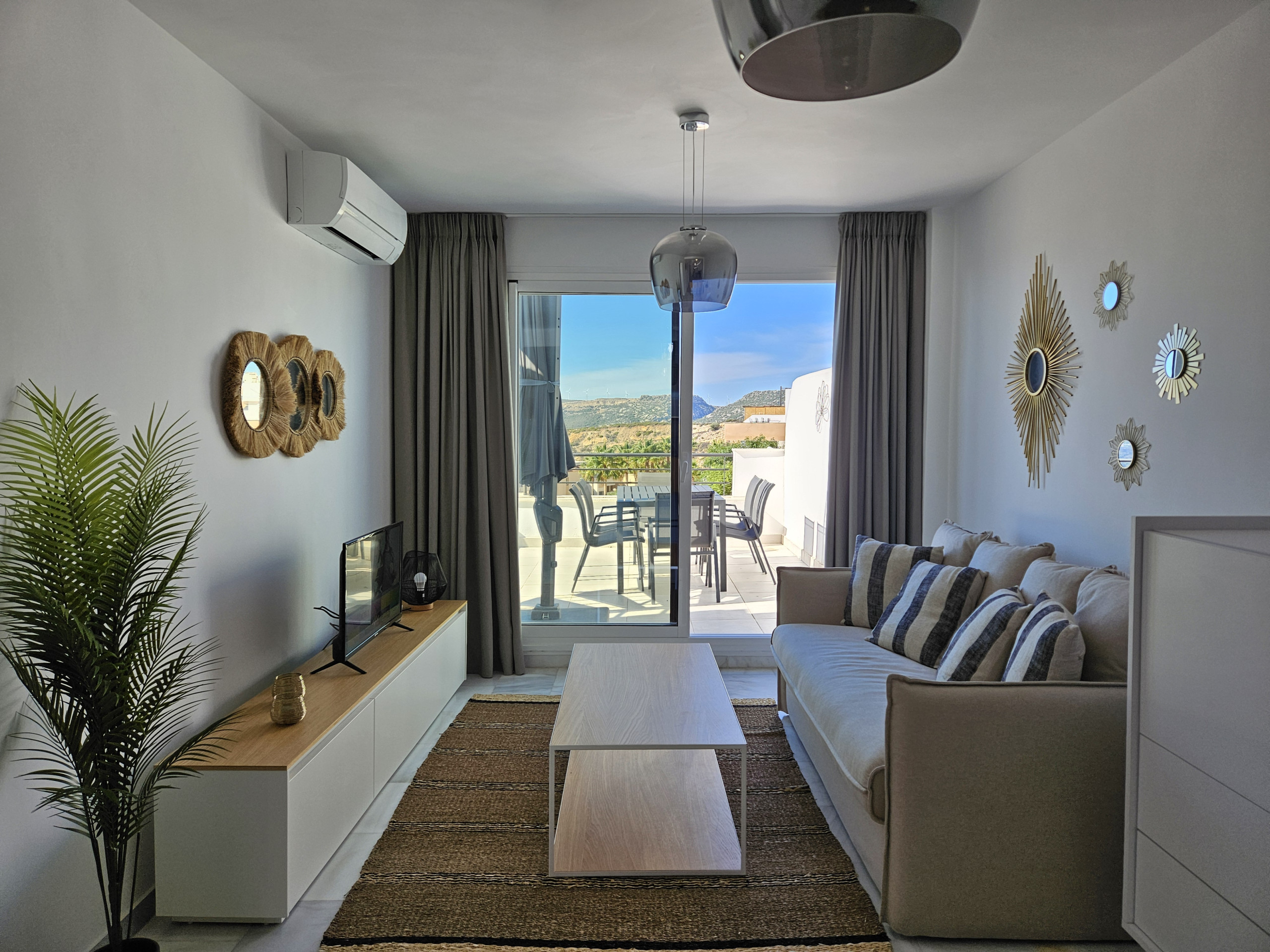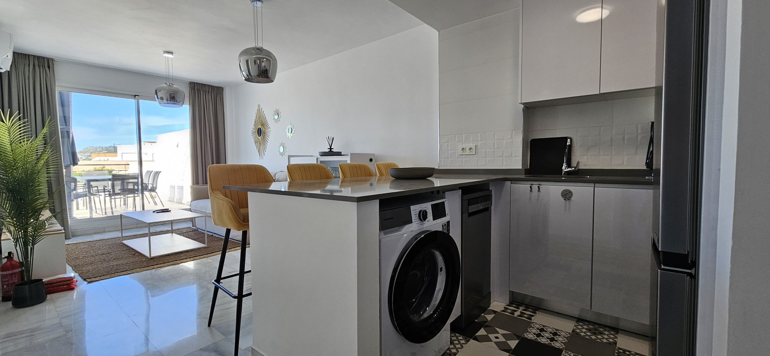 Este apartamento de dos dormitorios está distribuido en un solo nivel en la planta baja y está amueblado con mucho gusto. Entre al apartamento en el amplio espacio de estar de planta abierta. El área de asientos del comedor tiene capacidad para hasta ocho personas. Puede disfrutar del gran sofá en forma de L en el área de estar, junto con el televisor inteligente de 65 pulgadas con Amazon Firestick. Desde el salón puede salir a la terraza, que tiene impresionantes vistas al mar, montañas y campo. Aquí encontrará un sofá de estar, sillas y mesa de café, además de tumbonas.