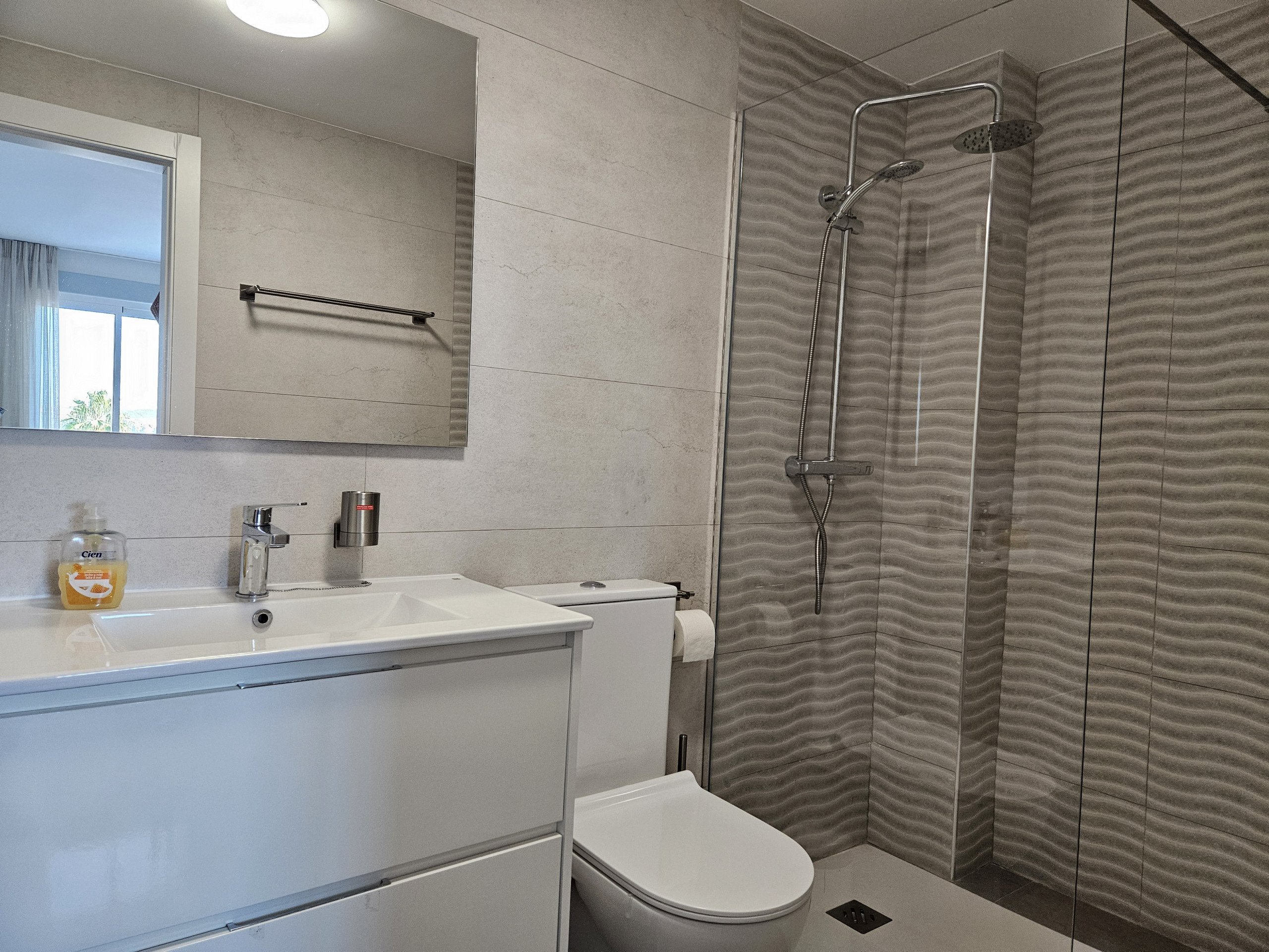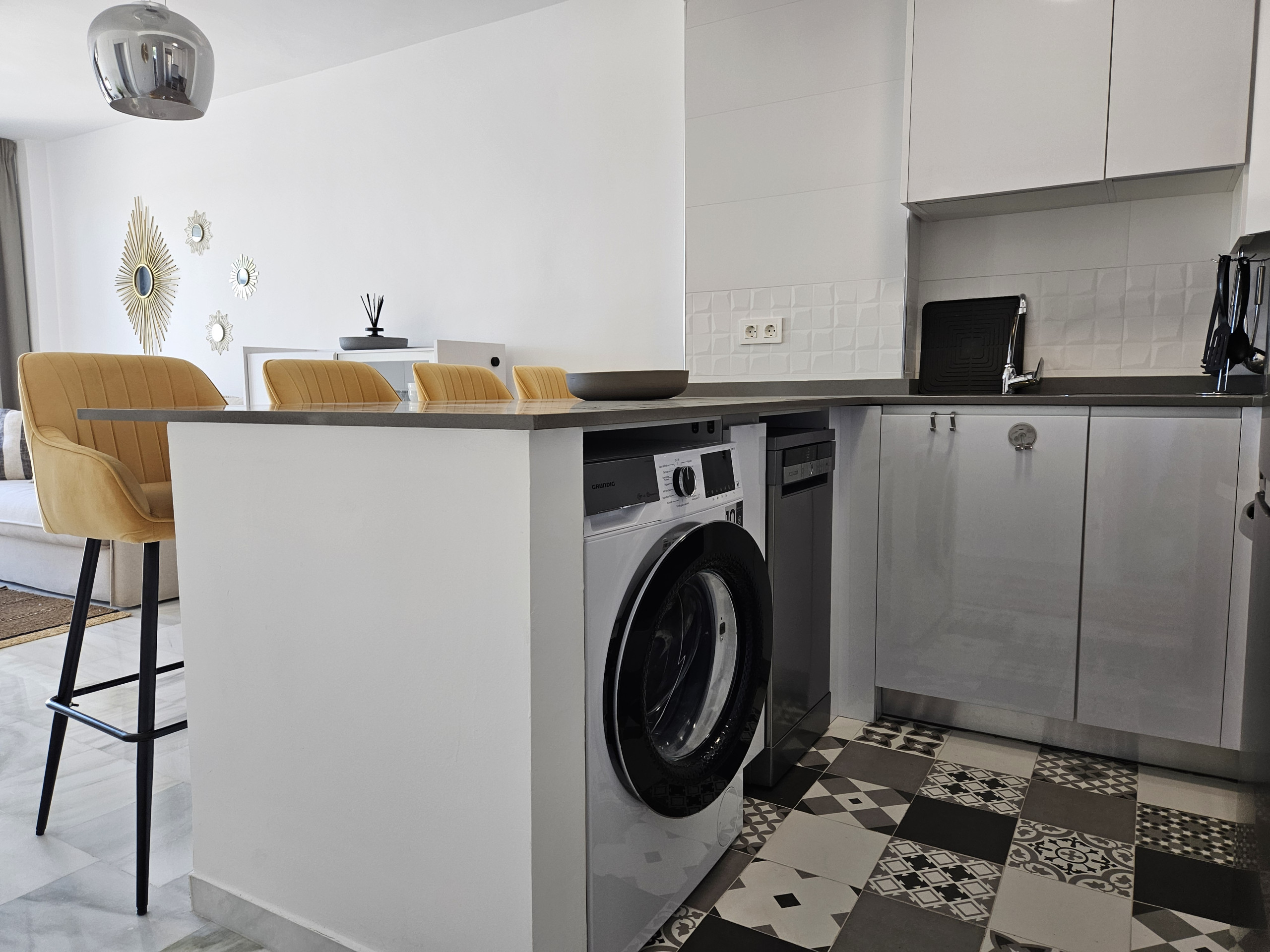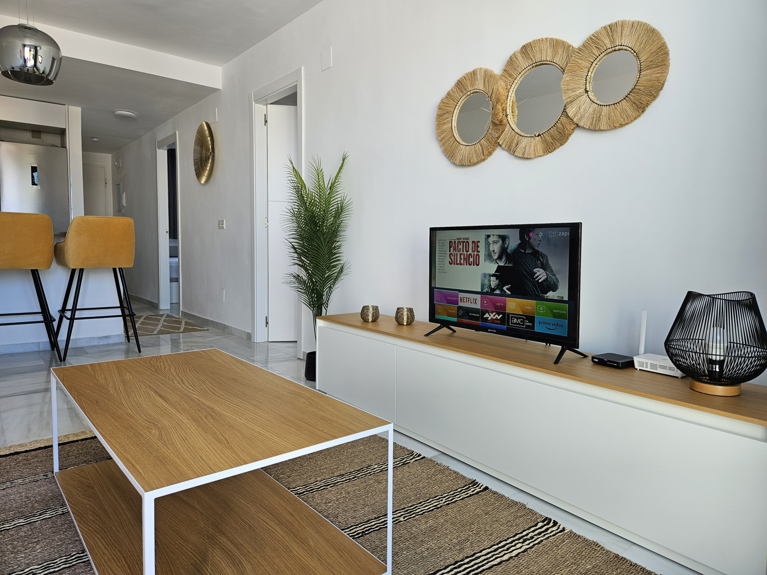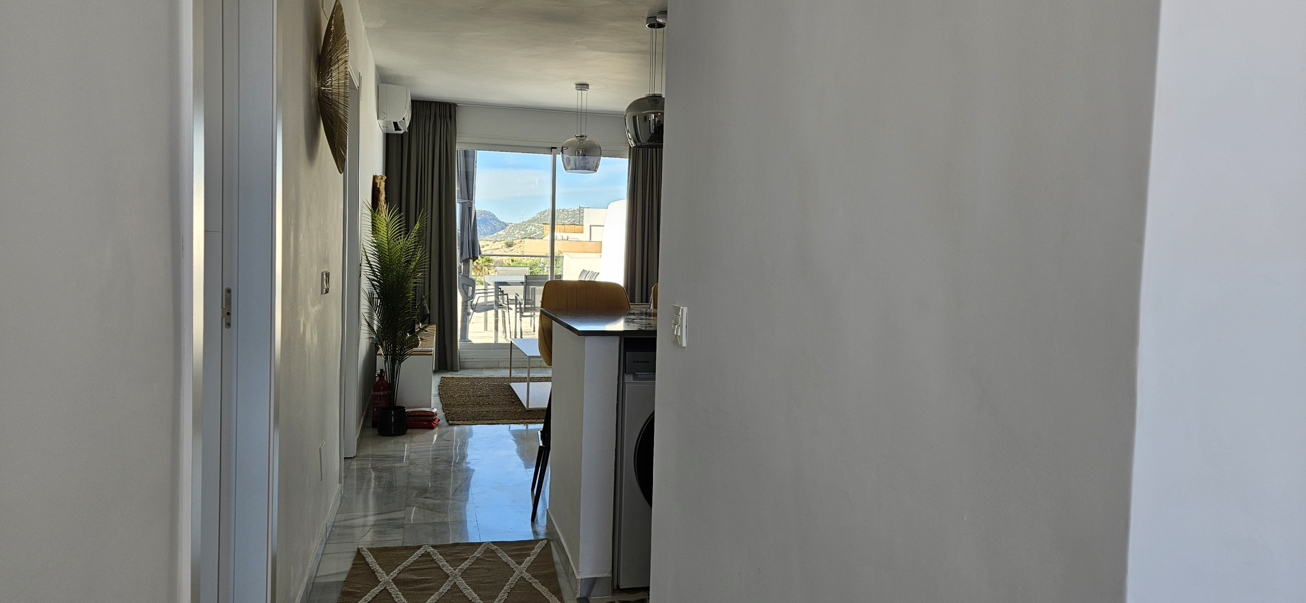 Este apartamento de dos dormitorios está distribuido en un solo nivel en la planta baja y está amueblado con mucho gusto. Entre al apartamento en el amplio espacio de estar de planta abierta. El área de asientos del comedor tiene capacidad para hasta ocho personas. Puede disfrutar del gran sofá en forma de L en el área de estar, junto con el televisor inteligente de 65 pulgadas con Amazon Firestick. Desde el salón puede salir a la terraza, que tiene impresionantes vistas al mar, montañas y campo. Aquí encontrará un sofá de estar, sillas y mesa de café, además de tumbonas.