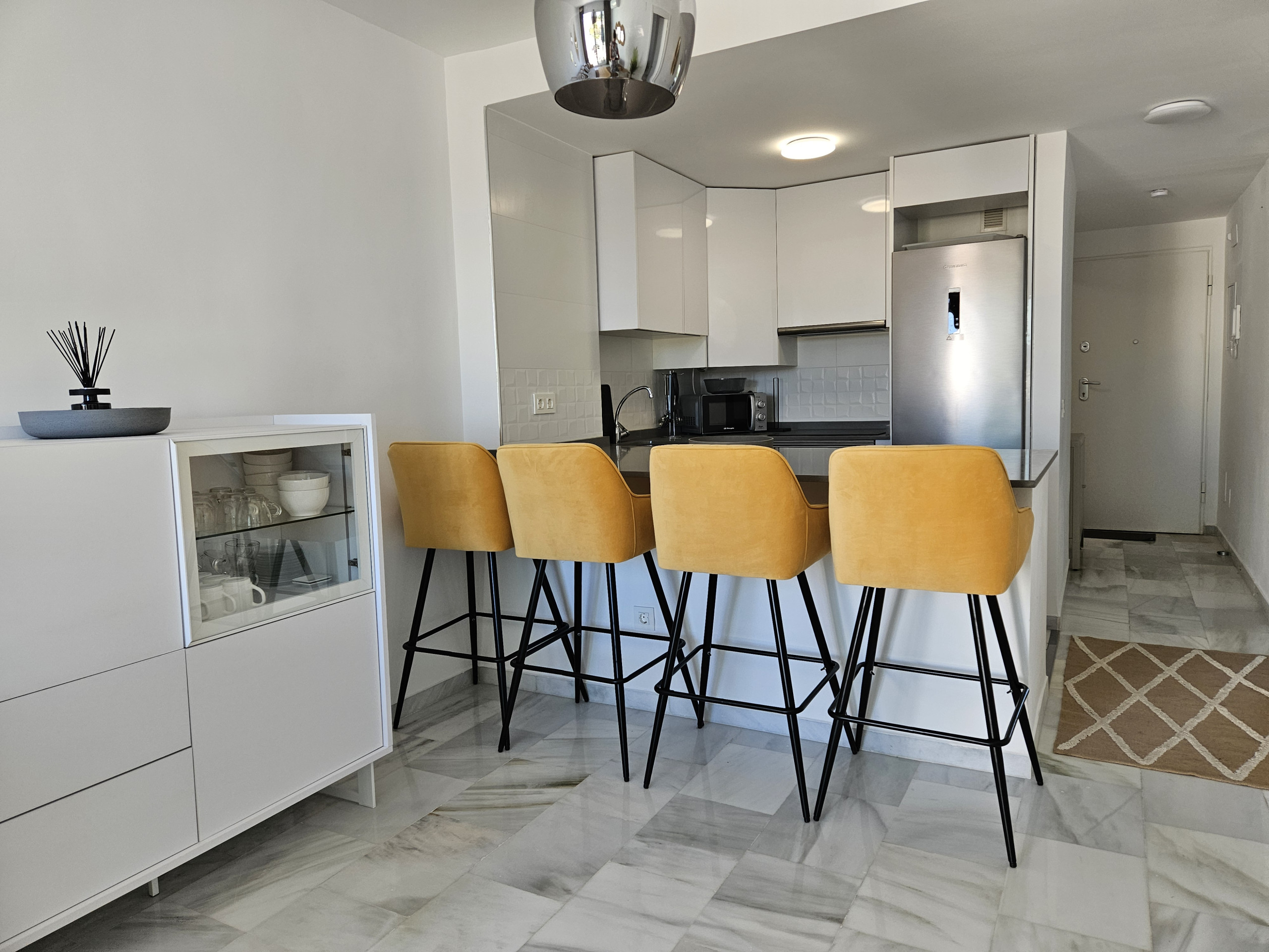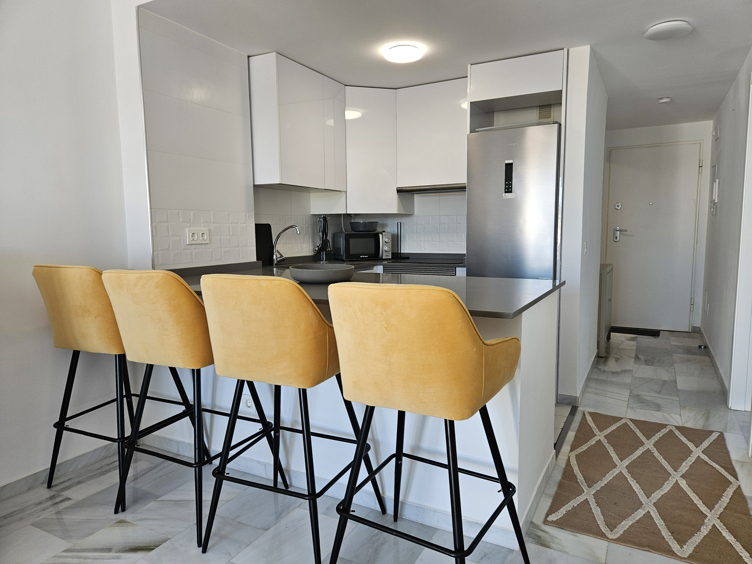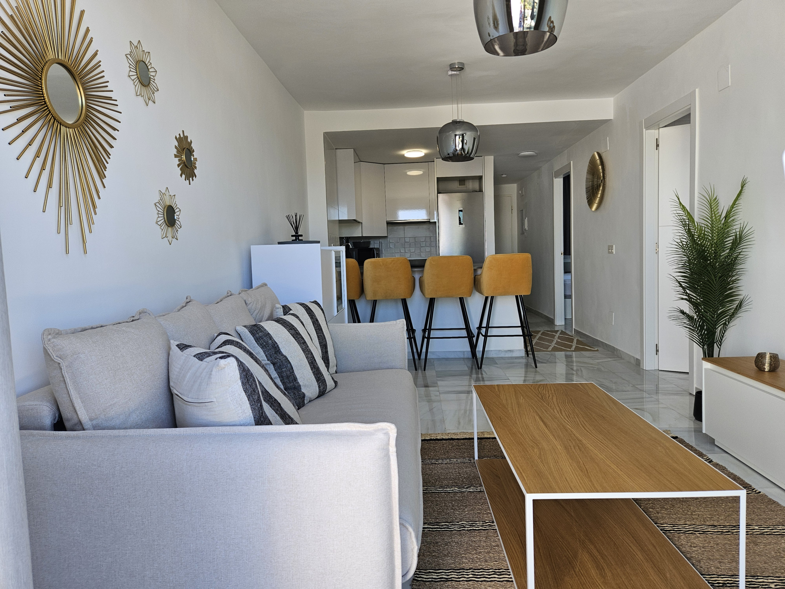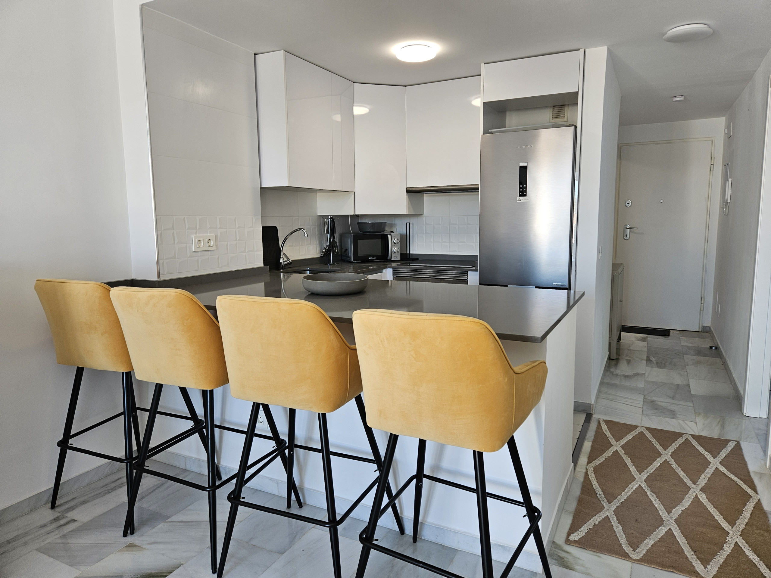 El interior de la propiedad incluye un salón y un área de comedor de buen tamaño, con sofá cama de cuero color crema, televisión de pantalla plana grande y acceso a la terraza principal. Hay una cocina moderna totalmente equipada y el dormitorio tiene una cama doble, con armarios empotrados y un baño completo con ducha grande, secador de pelo y planchas de pelo. La propiedad se beneficia de aire acondicionado frío y caliente en todo el espacio y WiFi gratuito. Dos plazas de aparcamiento en el garaje subterráneo seguro y se admiten mascotas.