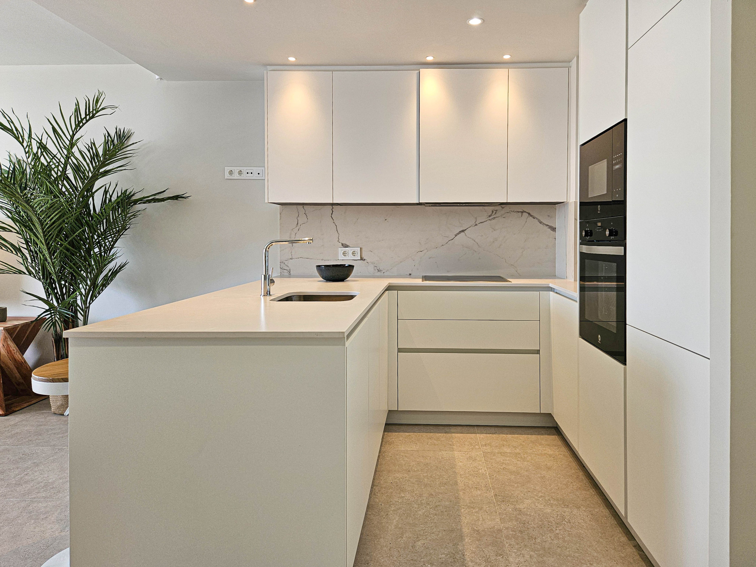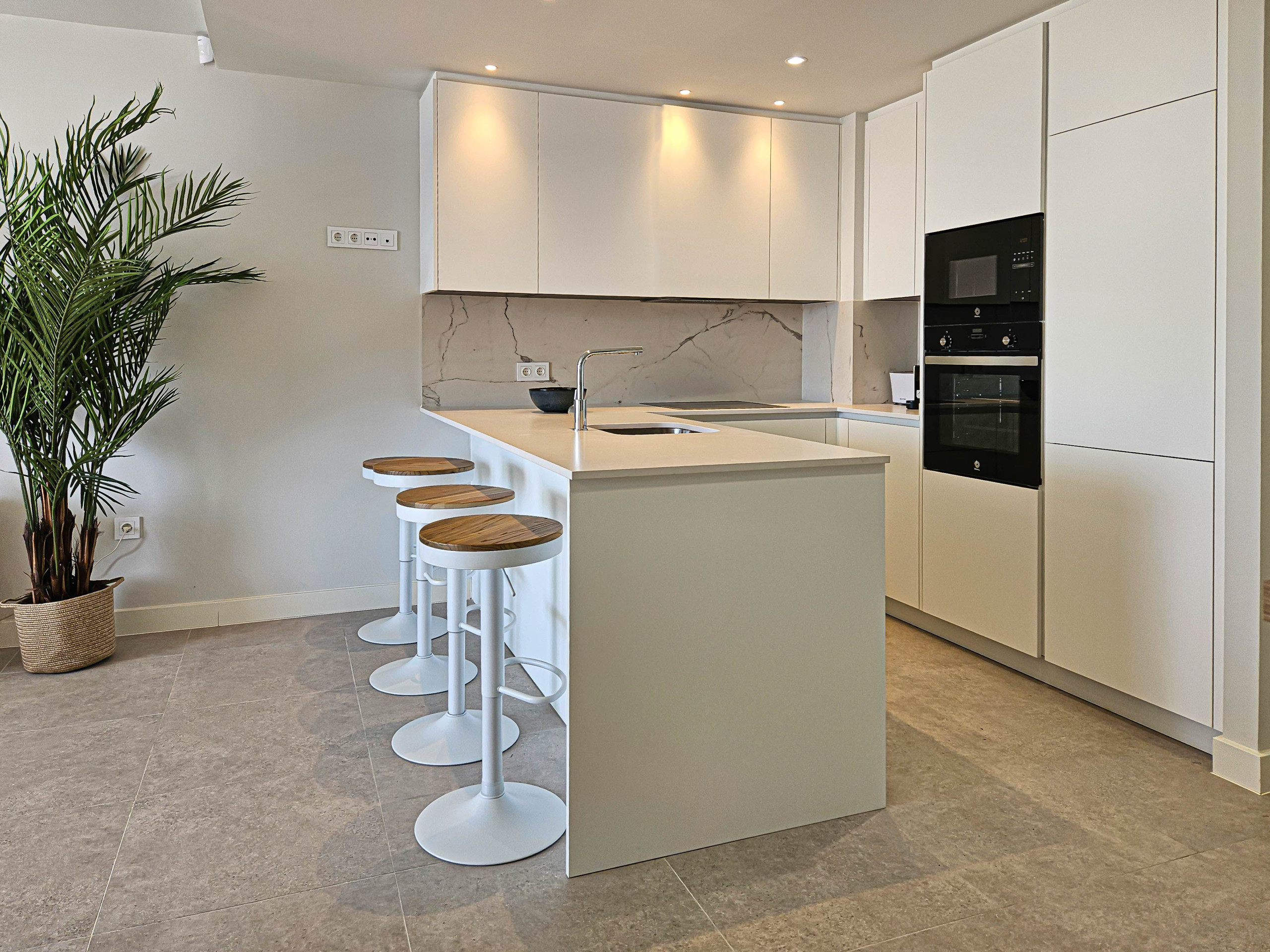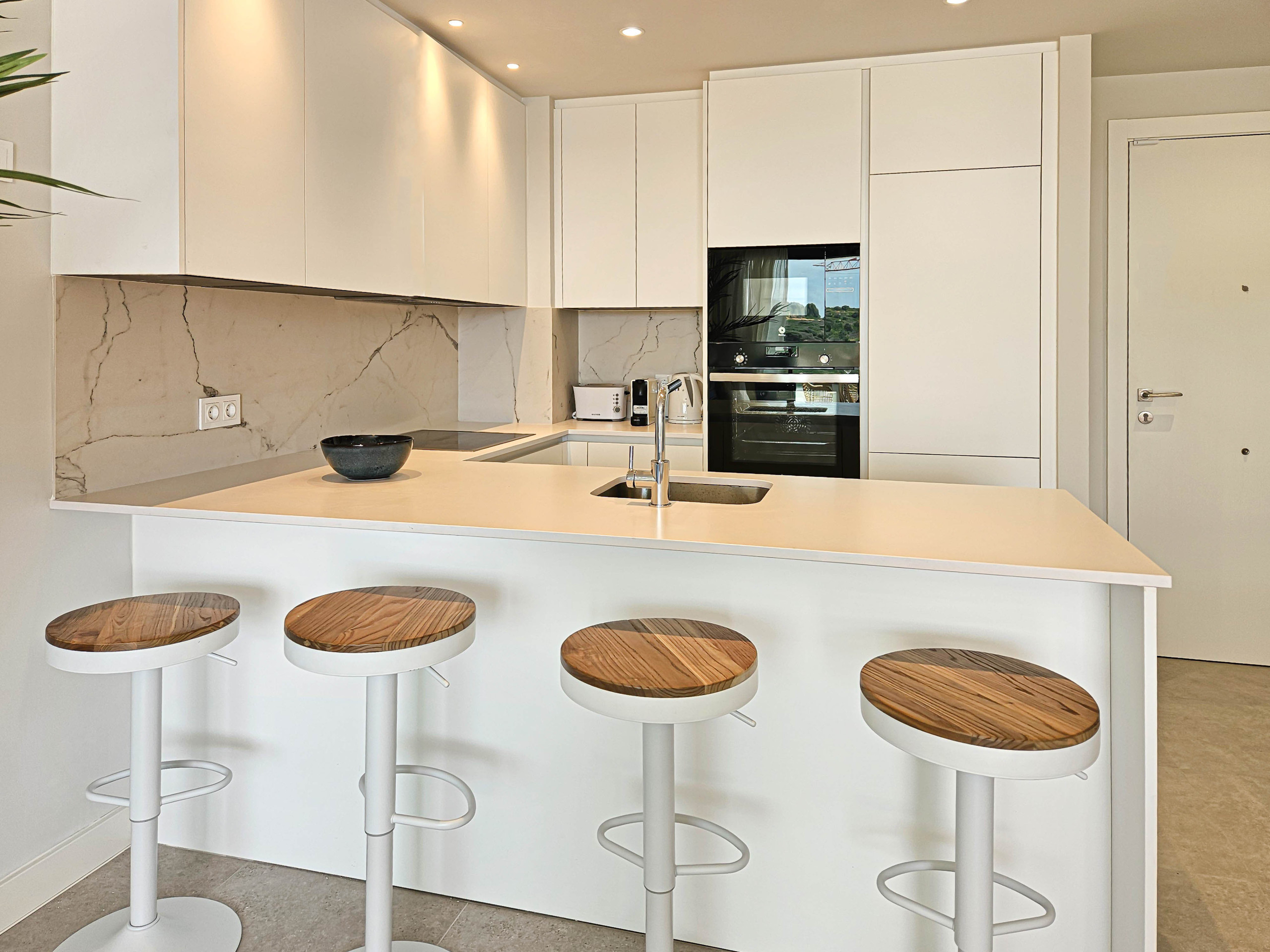 Este apartamento amueblado con gusto está ubicado en la tercera planta con acceso por ascensor y está distribuido en dos niveles. El espacio de estar de planta abierta ofrece una cocina bien equipada con una isla de cocina y una barra de desayuno con taburetes. Hay un área de comedor y el salón está amueblado con un sofá en forma de L, dos pufs y un televisor inteligente de 55 pulgadas. Desde el espacio de estar se accede a la terraza inferior, donde se pueden disfrutar las áreas de comedor y salón, una barbacoa de gas y vistas al mar. Suba por la escalera de caracol a la espaciosa terraza en la azotea, donde tiene la opción de asientos de salón, con camas de puf y sillas. También hay una pérgola con toldo eléctrico en la terraza inferior y otra pérgola en la terraza de la azotea, para ofrecer un respiro del sol en los días más calurosos.