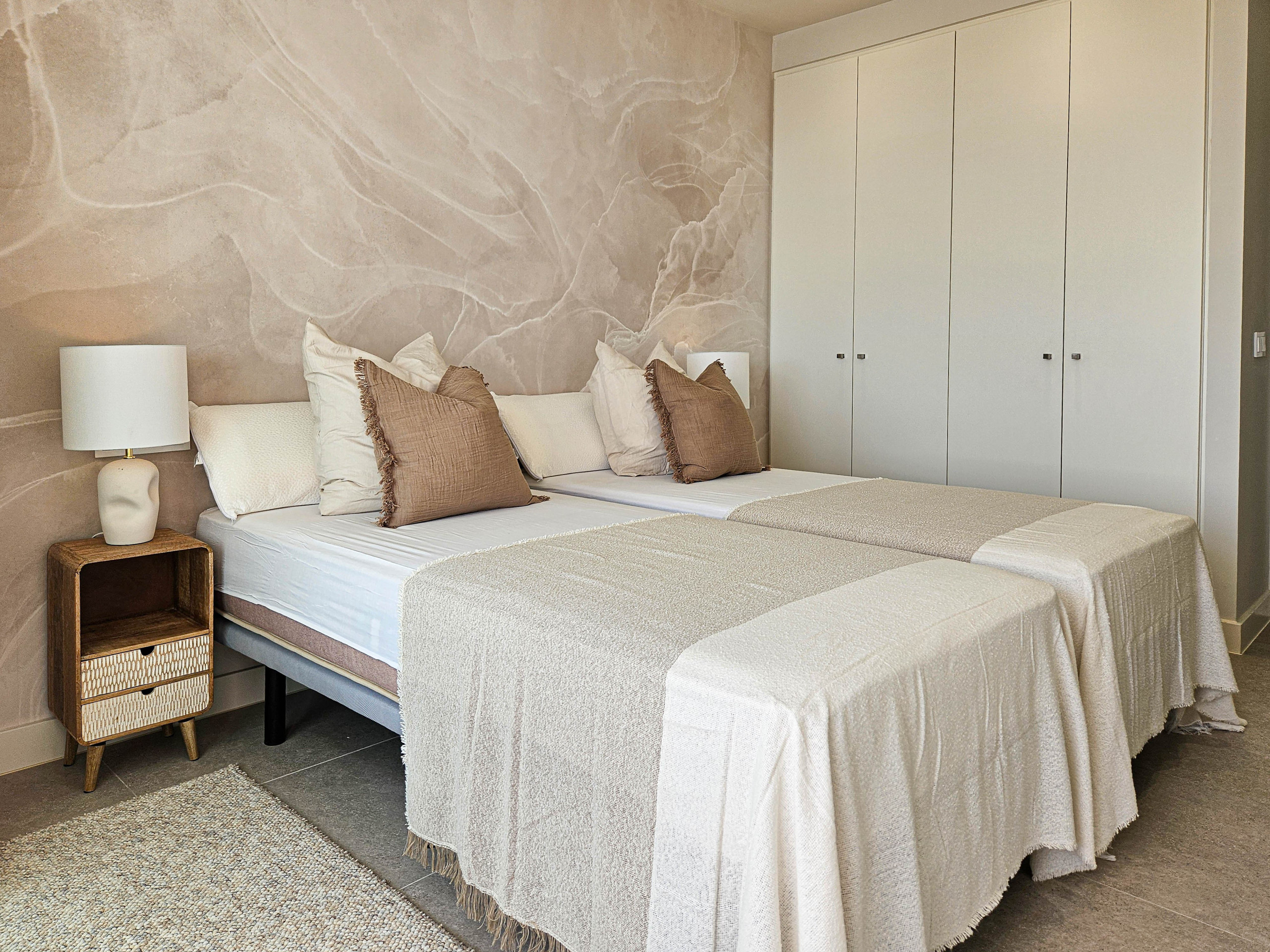 El dormitorio principal se beneficia de una cama de matrimonio super king, armarios empotrados y tiene acceso directo a la terraza. También hay un cuarto de baño en suite equipado con una ducha de paseo y lavabos dobles. El dormitorio de invitados está amueblado con camas gemelas y armarios empotrados. Hay acceso a un cuarto de baño de invitados equipado con una ducha de paseo.