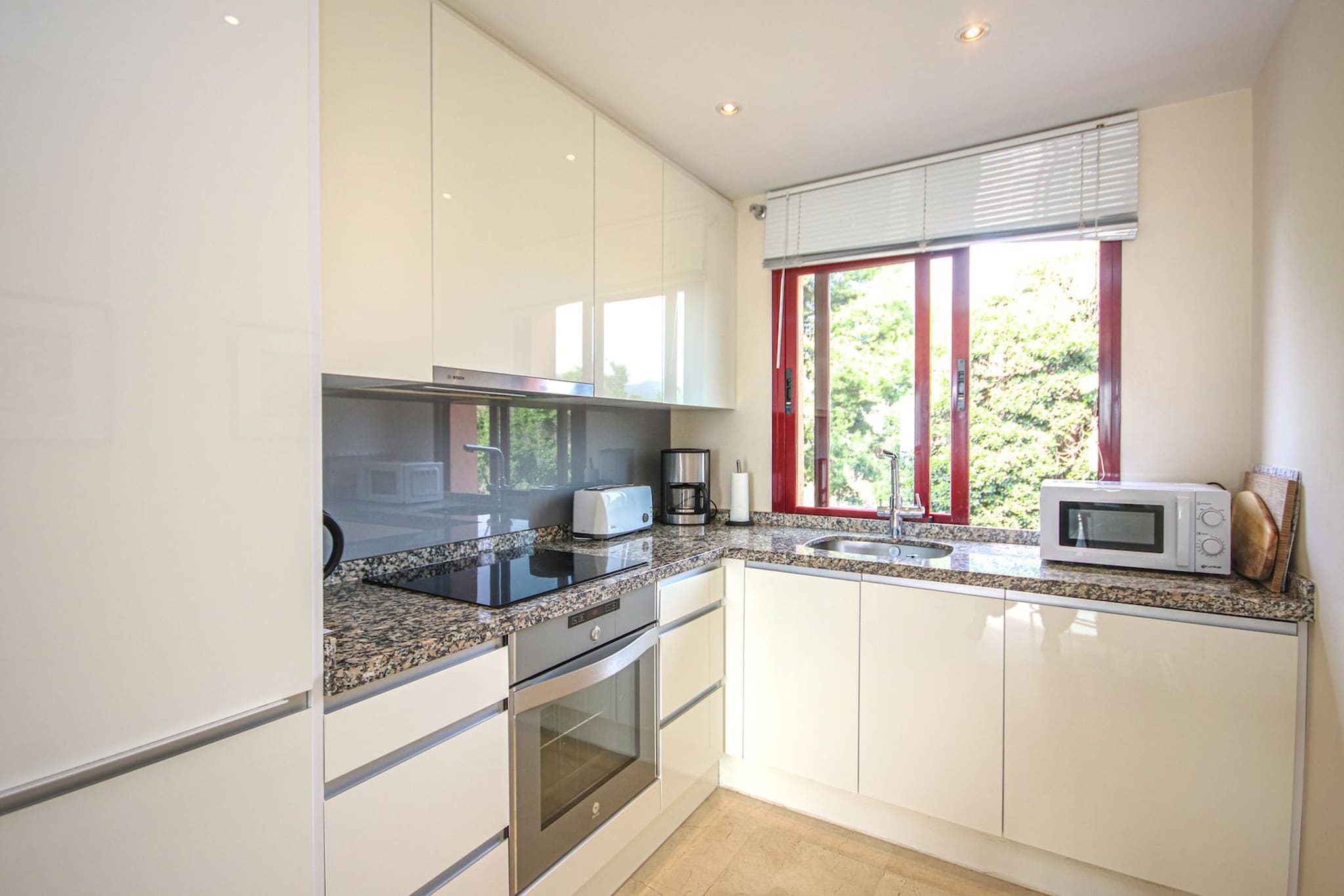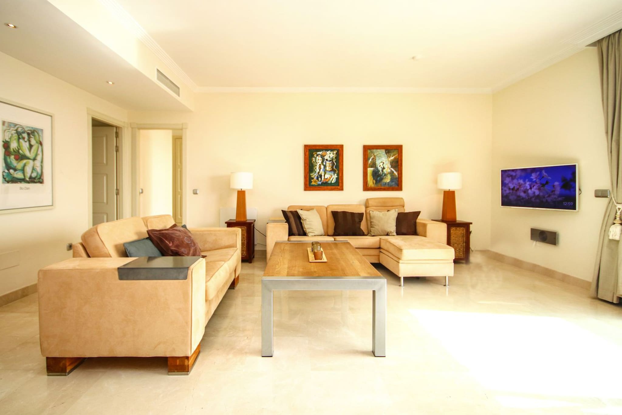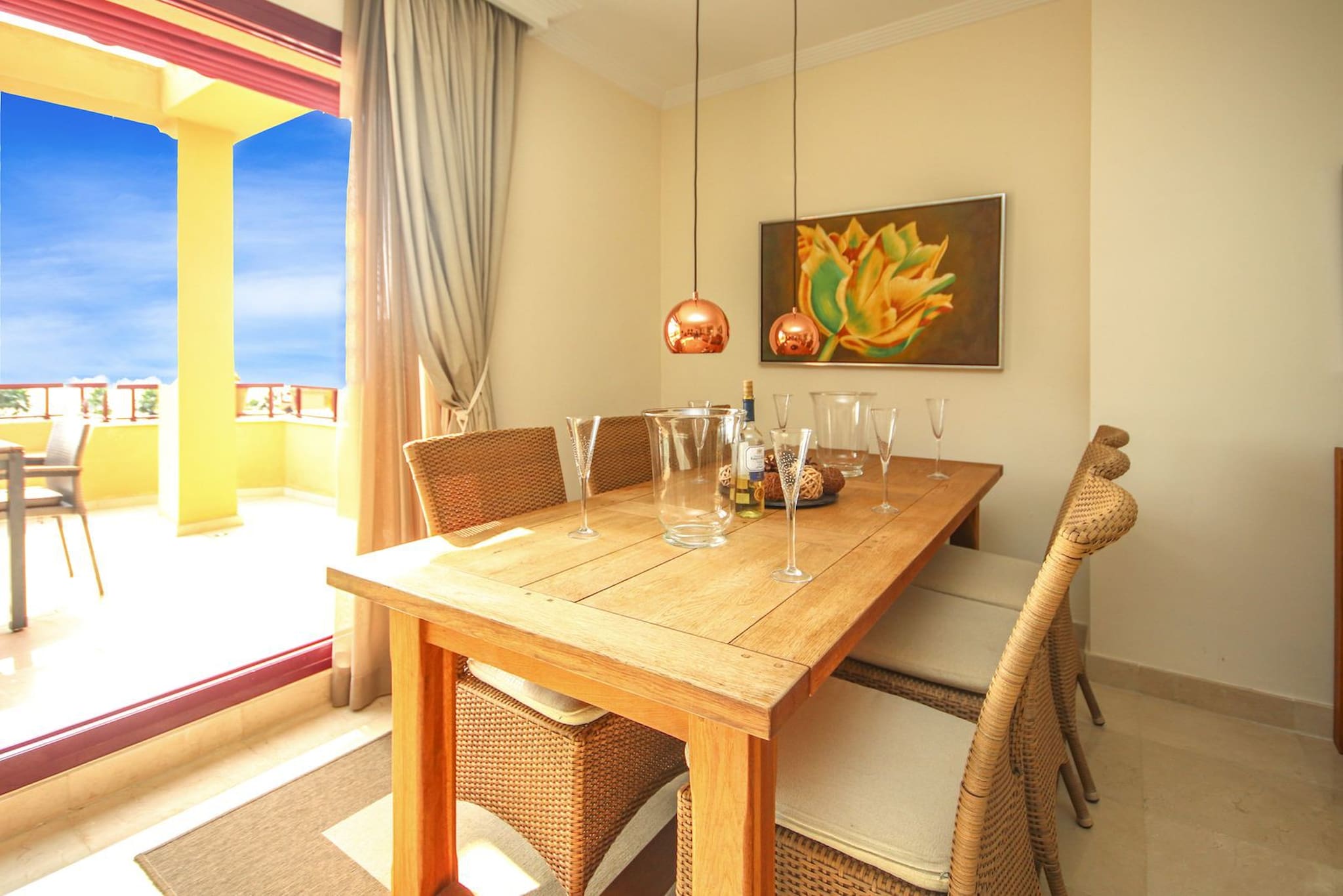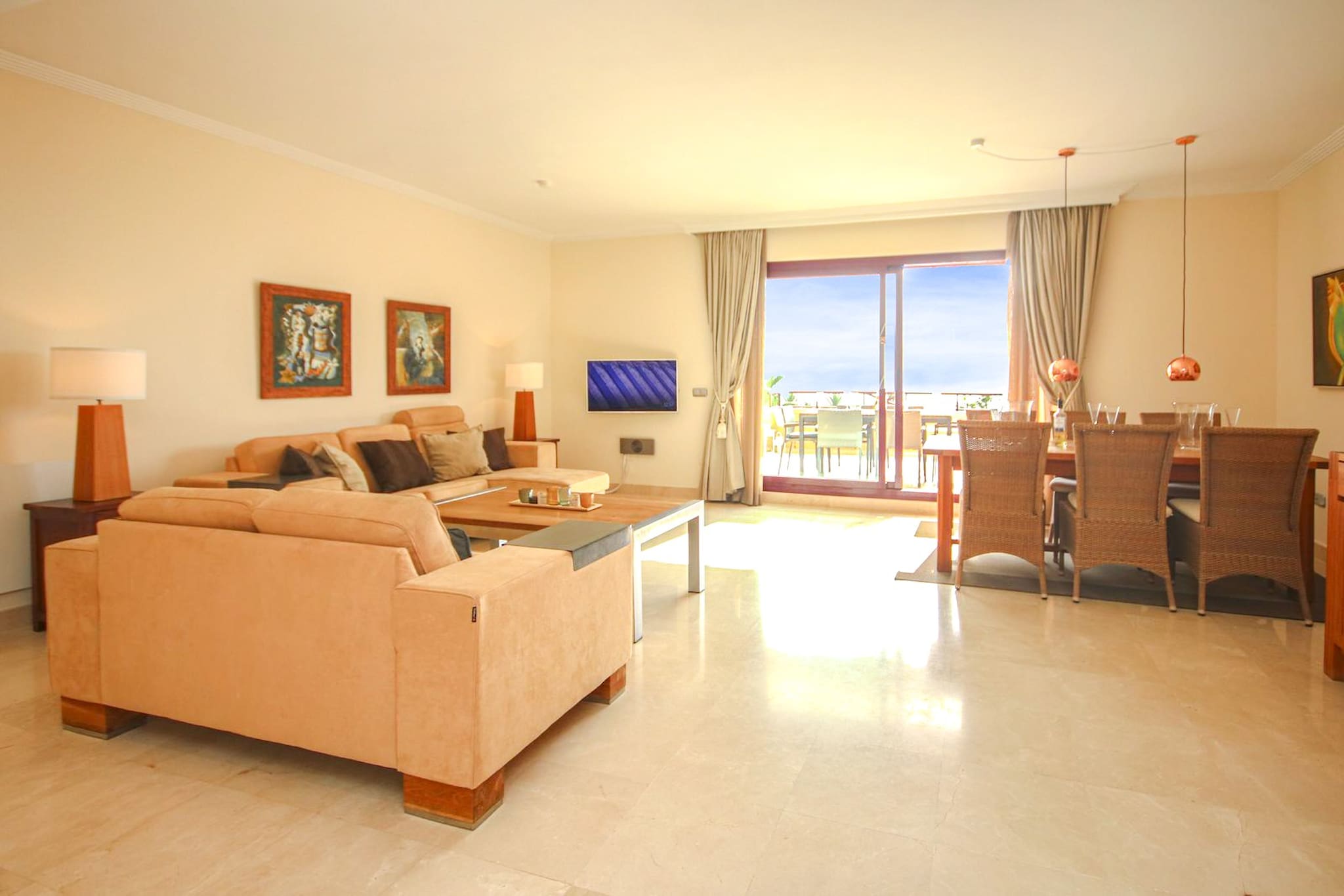 El apartamento está distribuido en un solo nivel y ofrece un espacio de estar diáfano. Entre al apartamento hacia la zona de cocina, que está completamente equipada y ofrece agua filtrada del grifo y una sala de servicio independiente. La espaciosa zona de salón/comedor ofrece asientos para 6 personas y 2 sofás cómodos. Acceda a la terraza desde la zona de salón y podrá encontrar un área de comedor adicional para 6 personas, tumbonas, una barbacoa de gas y unas vistas impresionantes del mar y la zona de la piscina.