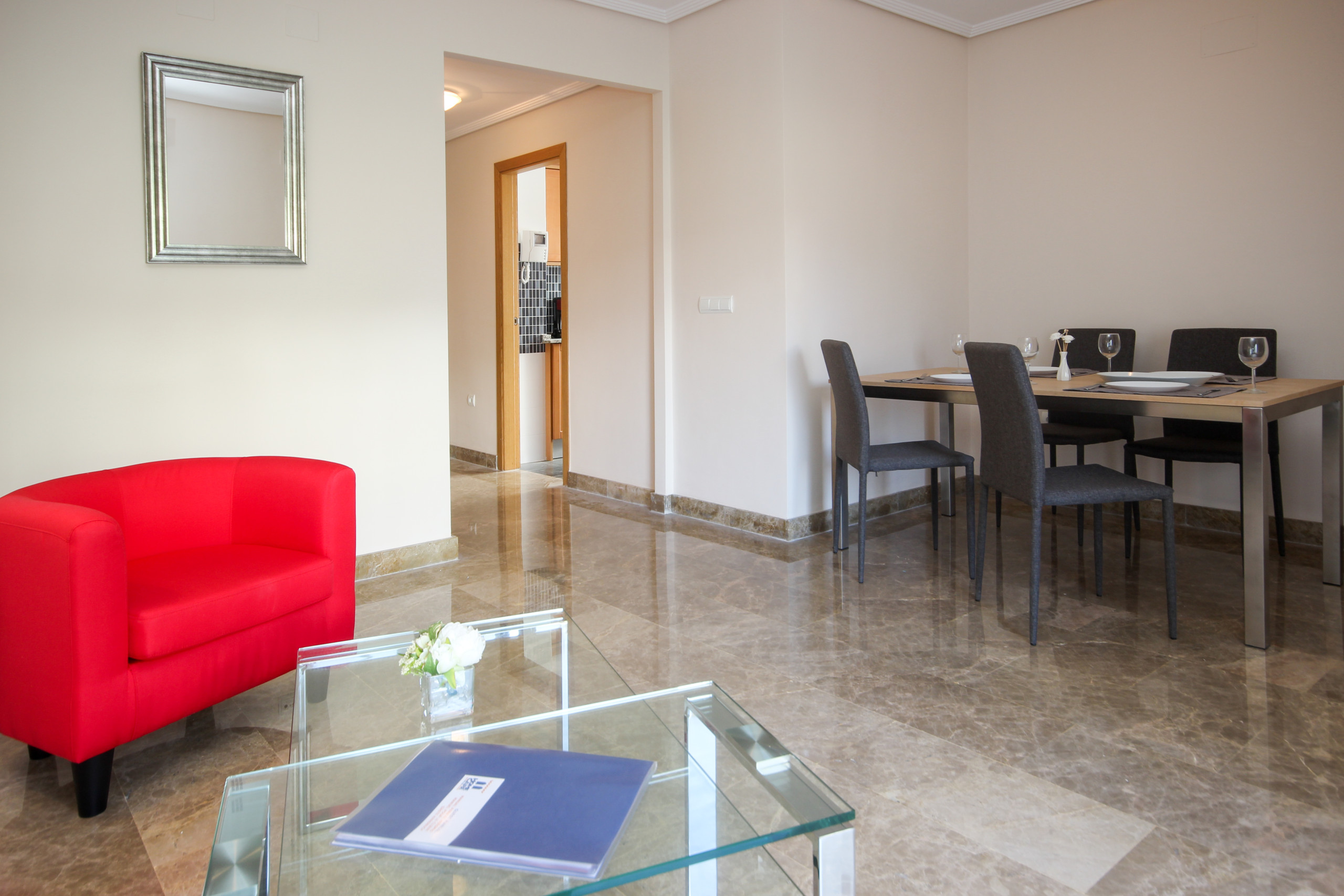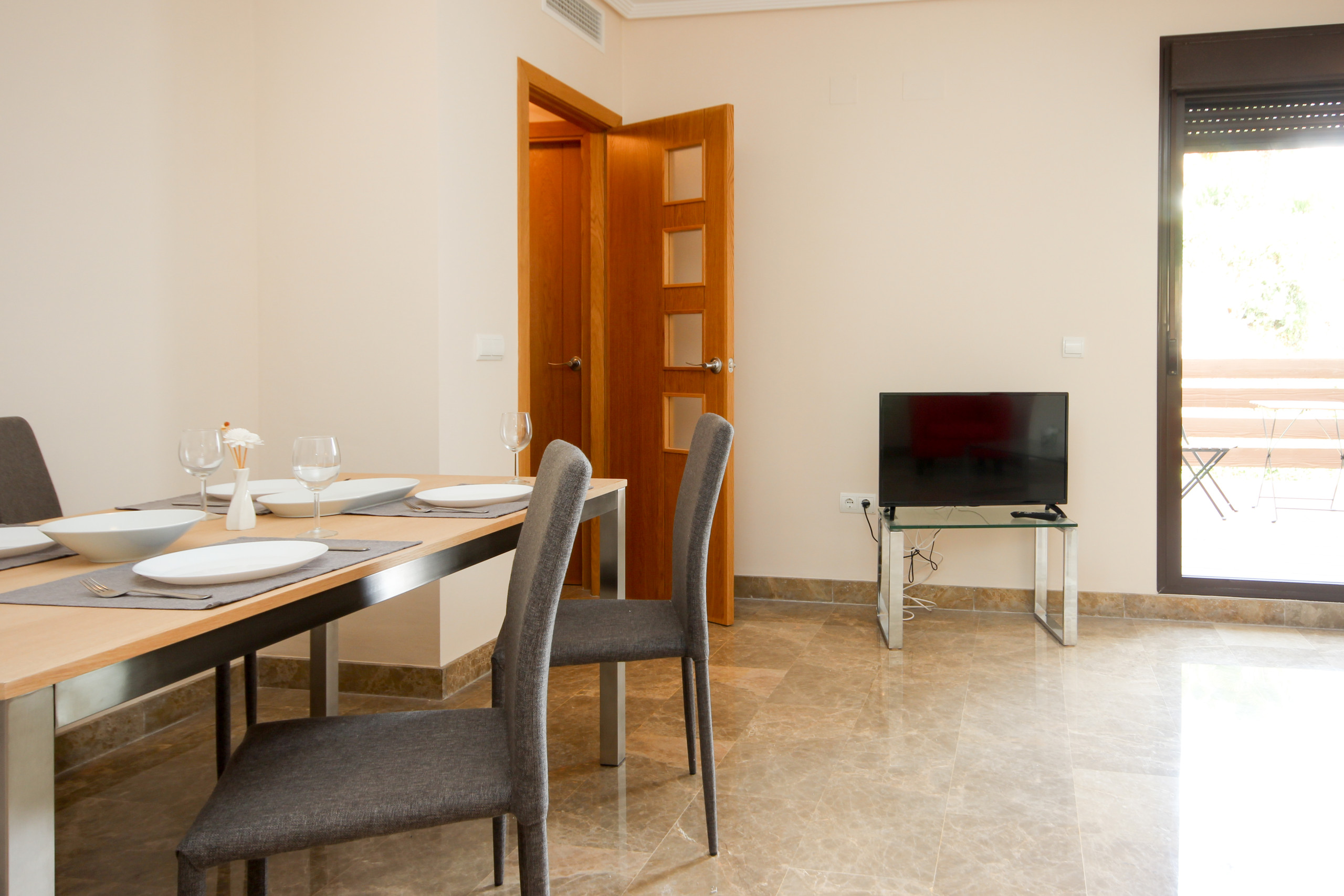 El apartamento está ubicado en la tercera planta y consta de un salón-comedor amueblado con 2 sofás, mesa de comedor y sillas, y un televisor. El acceso a la terraza del salón orientada al sur y a la terraza en la azotea se realiza a través del salón. La cocina, compacta y moderna, está completamente equipada.