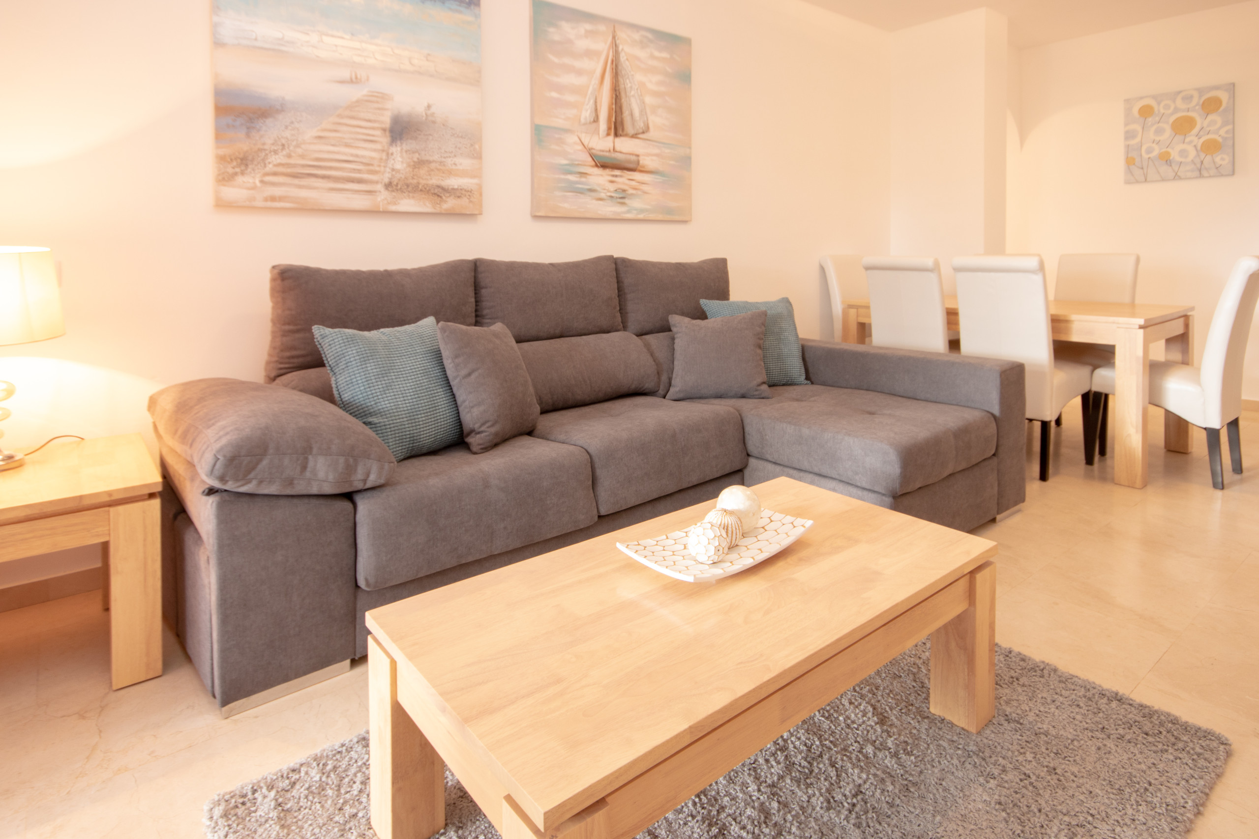 Este apartamento decorado con buen gusto, situado en la tercera planta, consta de un salón-comedor amueblado con un sofá, mesa de comedor y sillas, y televisión. El apartamento tiene WiFi gratuito. El salón conduce directamente a la terraza cubierta, orientada al sureste, que ofrece vistas panorámicas al mar. La terraza está amueblada con mesa de comedor y sillas para cenas al aire libre. La cocina moderna y completamente equipada está dotada de lavadora.