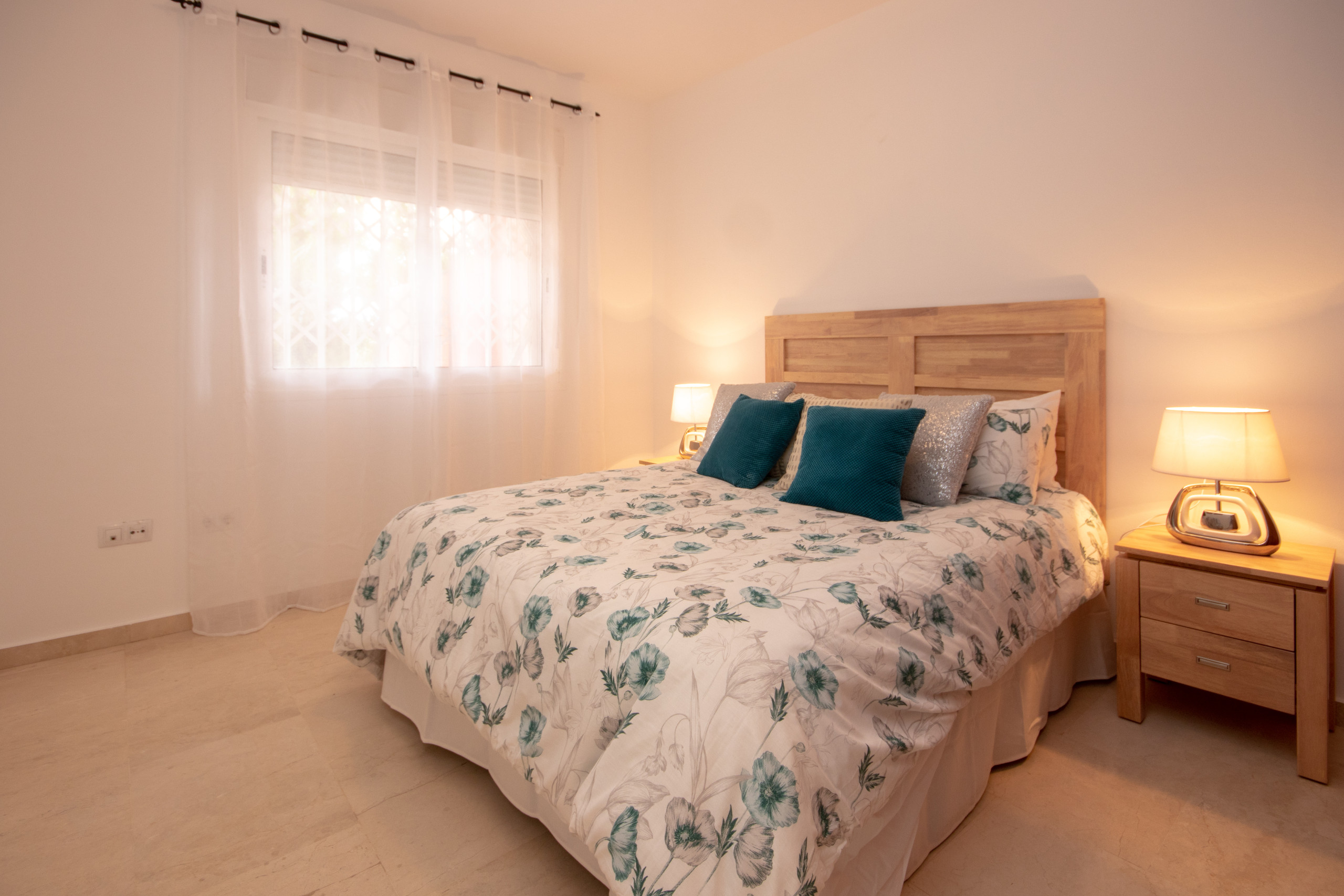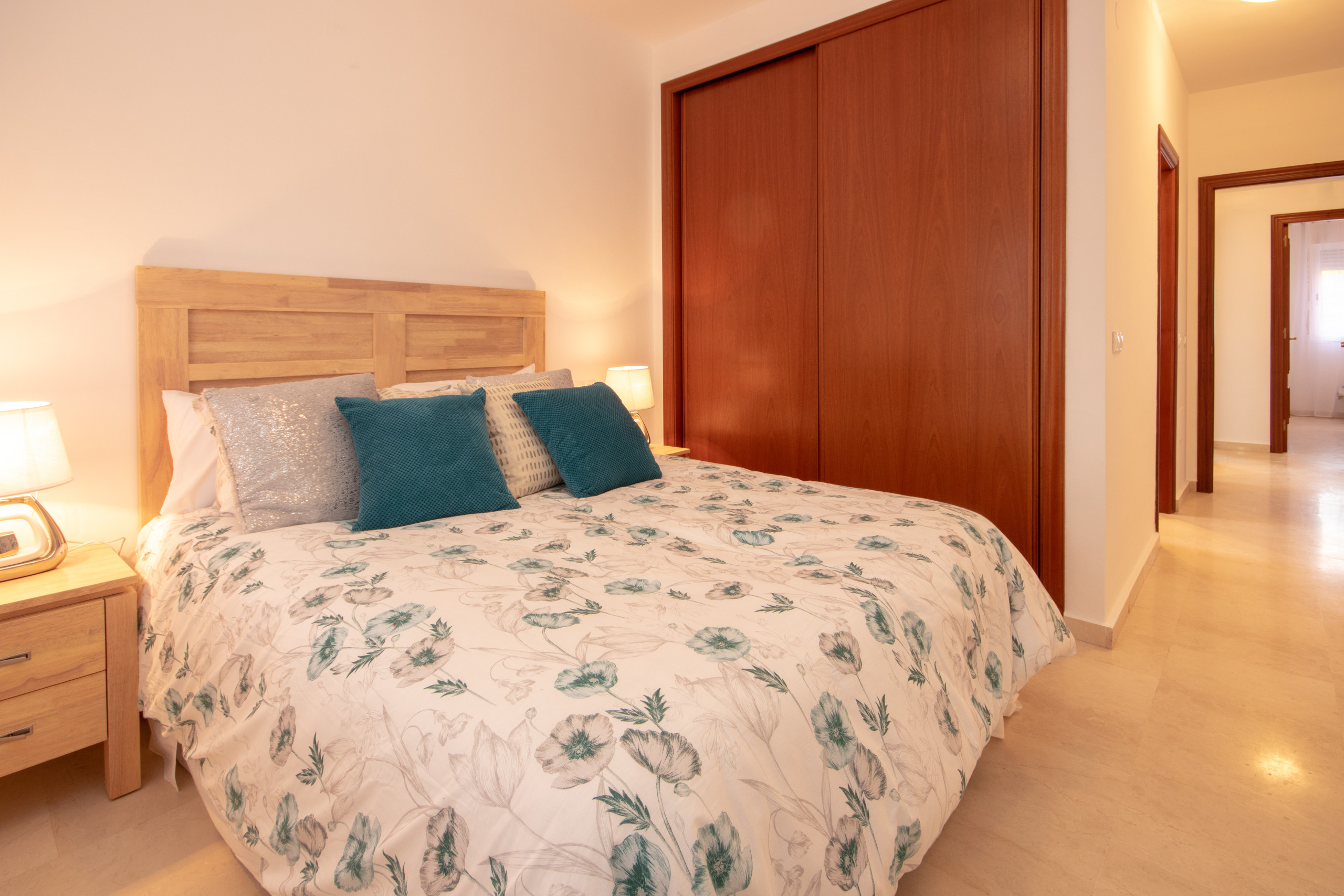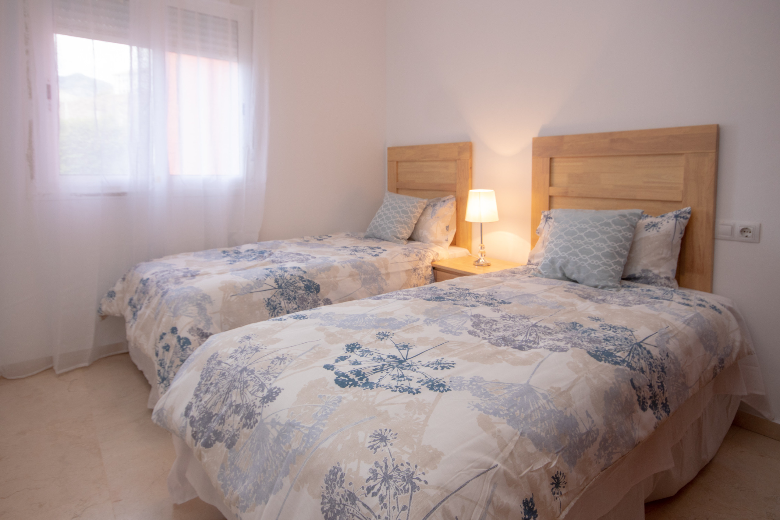 El dormitorio principal está amueblado con una cama de matrimonio y cuenta con un cuarto de baño completo en suite. El segundo dormitorio está equipado con 2 camas individuales. Ambos dormitorios tienen armarios empotrados y aire acondicionado. También hay un segundo cuarto de baño con cabina de ducha. Por favor, tenga en cuenta que este apartamento no permite fumar ni mascotas.