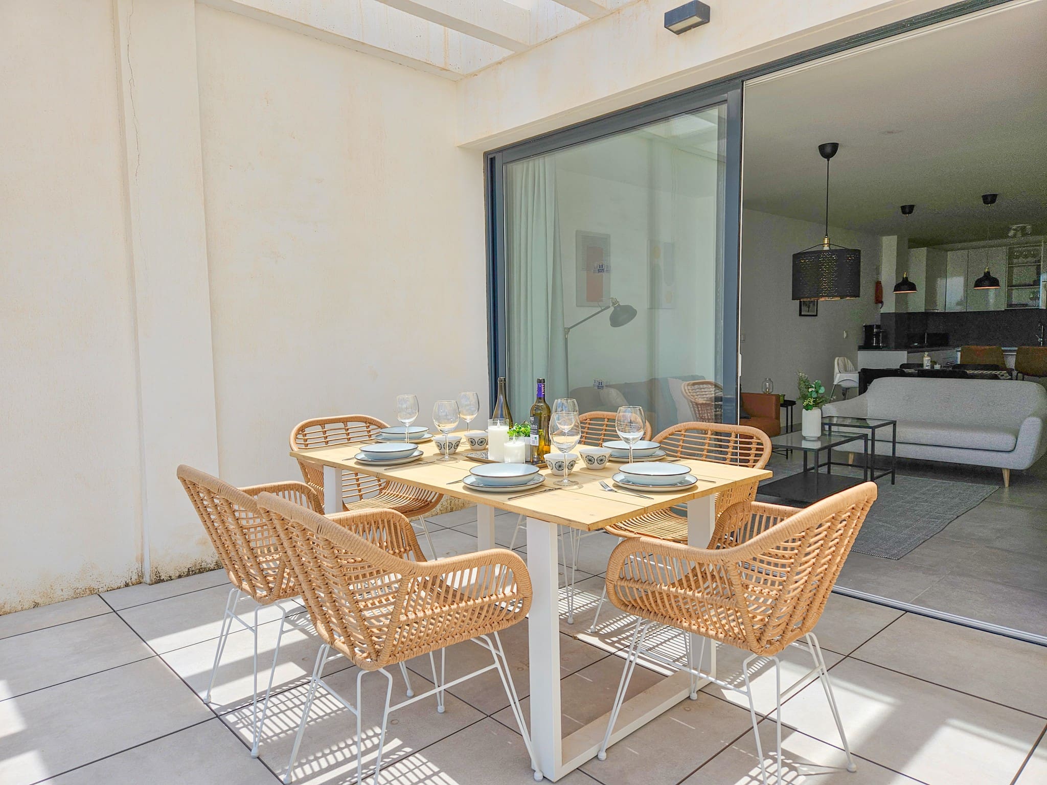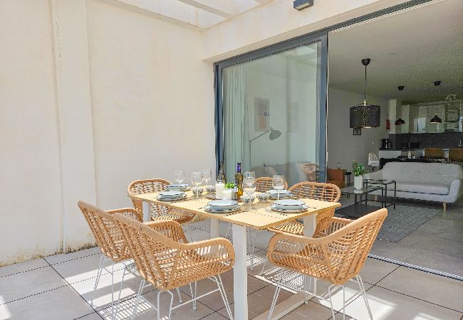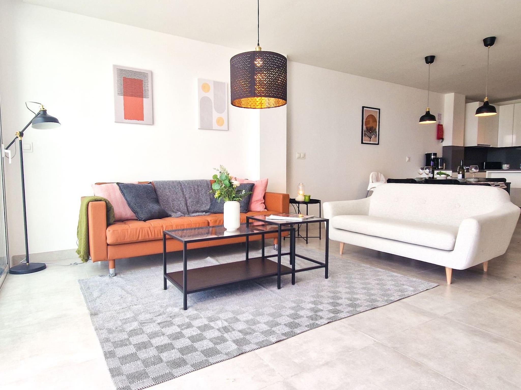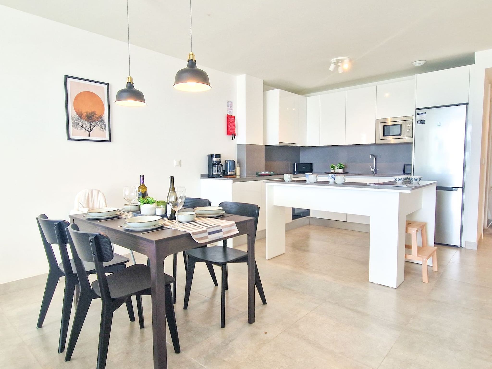 Al entrar en el apartamento hay un salón de planta abierta con zona de comedor para hasta seis personas, una isla de barra de desayuno con taburetes y una cocina totalmente equipada. El salón tiene un gran sofá en forma de L, que se abre para convertirse en un cómodo sofá-cama doble, ofreciendo la opción de dormir seis personas. El salón da acceso a la terraza, que cuenta con una zona de estar y otra área de comedor para seis personas, con vistas a la piscina y al jardín.