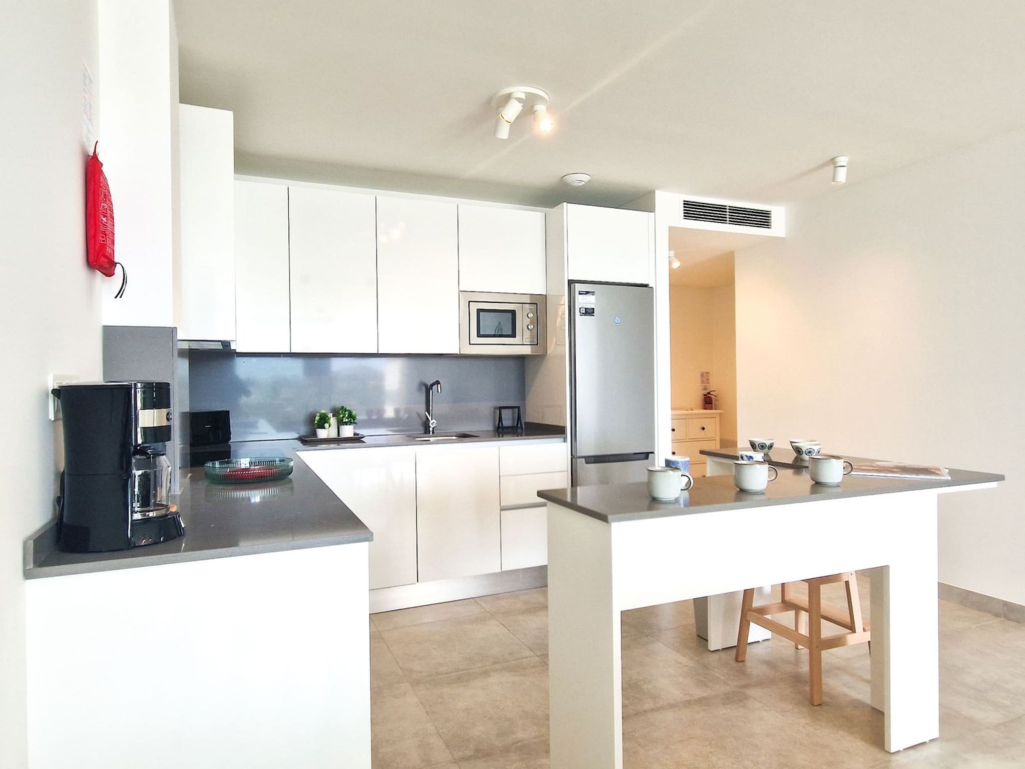 La cocina americana, eléctrica, está equipada con nevera, microondas, horno, congelador, lavavajillas, vajilla/cubertería, utensilios/cocina, cafetera, tostadora, hervidor de agua y fogones.