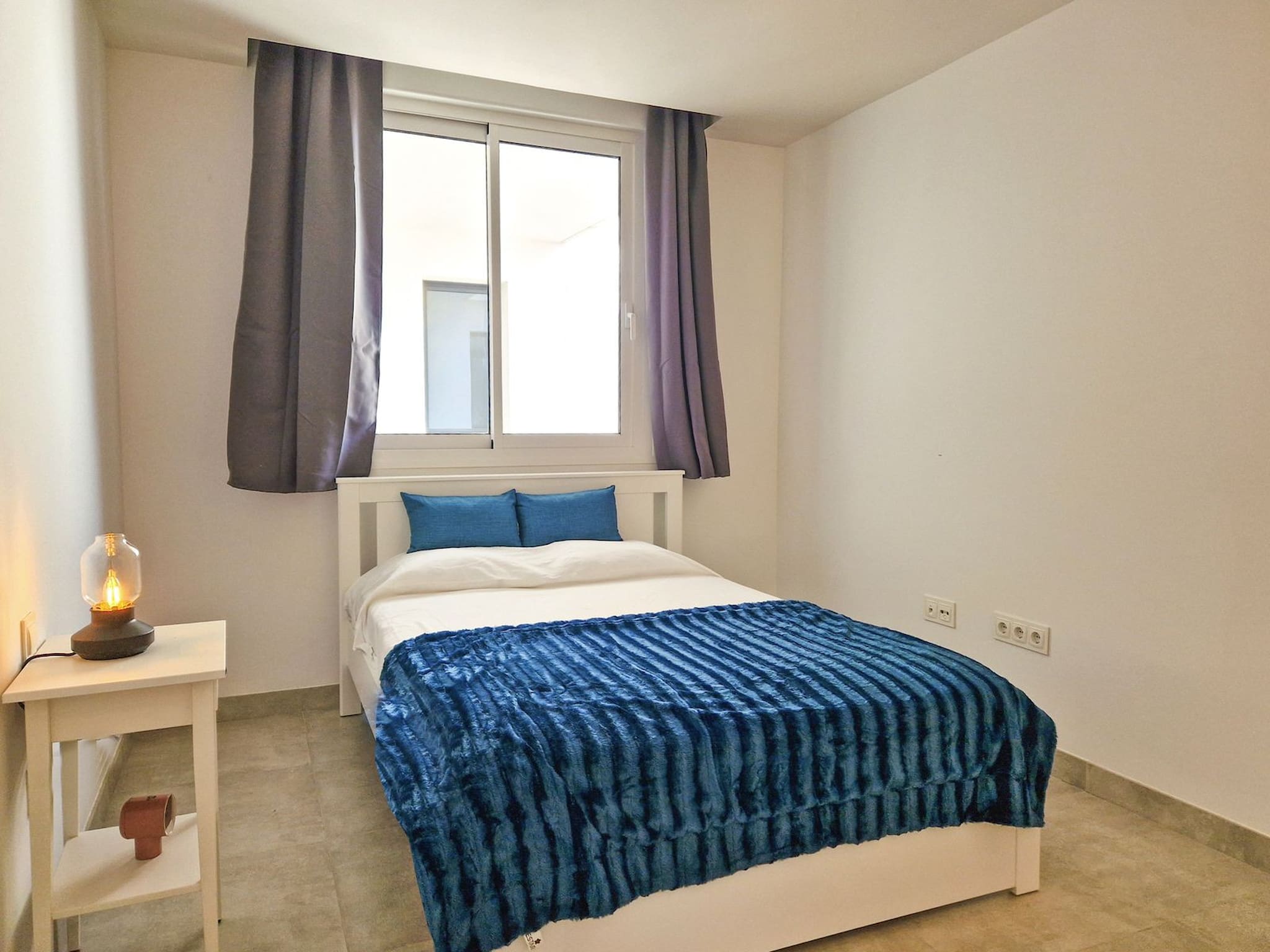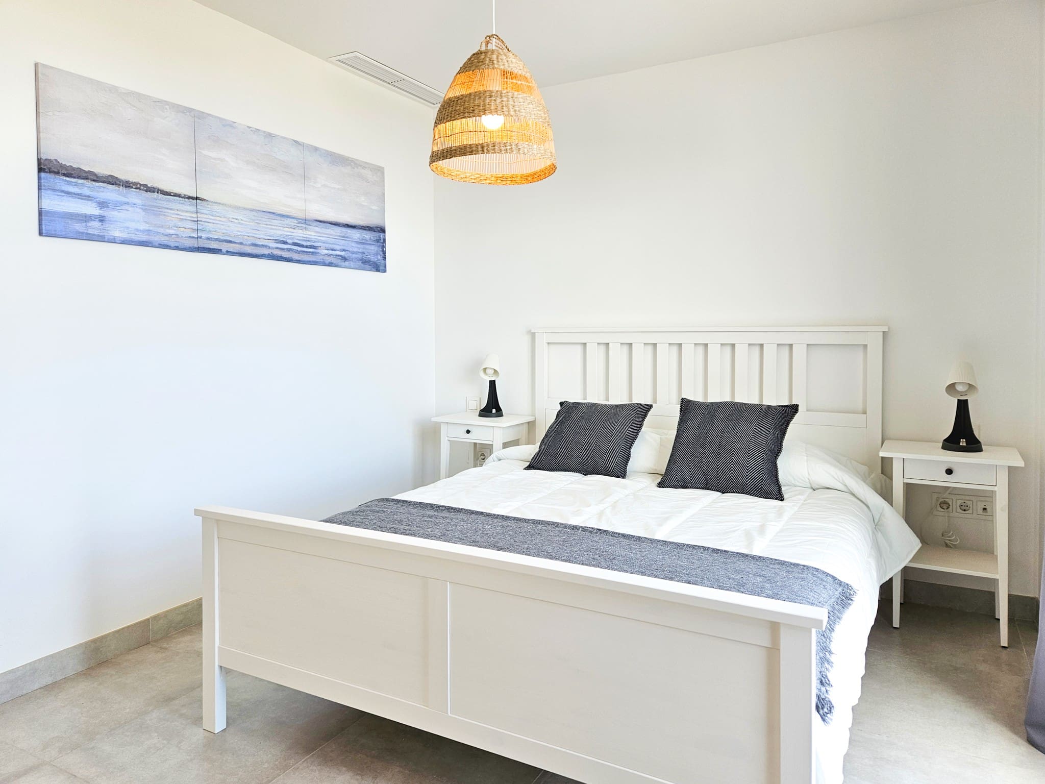 Desde el salón se accede a los dormitorios, ambos con acceso a la terraza. El dormitorio principal tiene una cama de matrimonio extragrande, armarios empotrados y un cuarto de baño en suite con bañera y ducha. El segundo dormitorio también tiene una cama de matrimonio extragrande, armarios empotrados y hace uso de un aseo de invitados independiente.