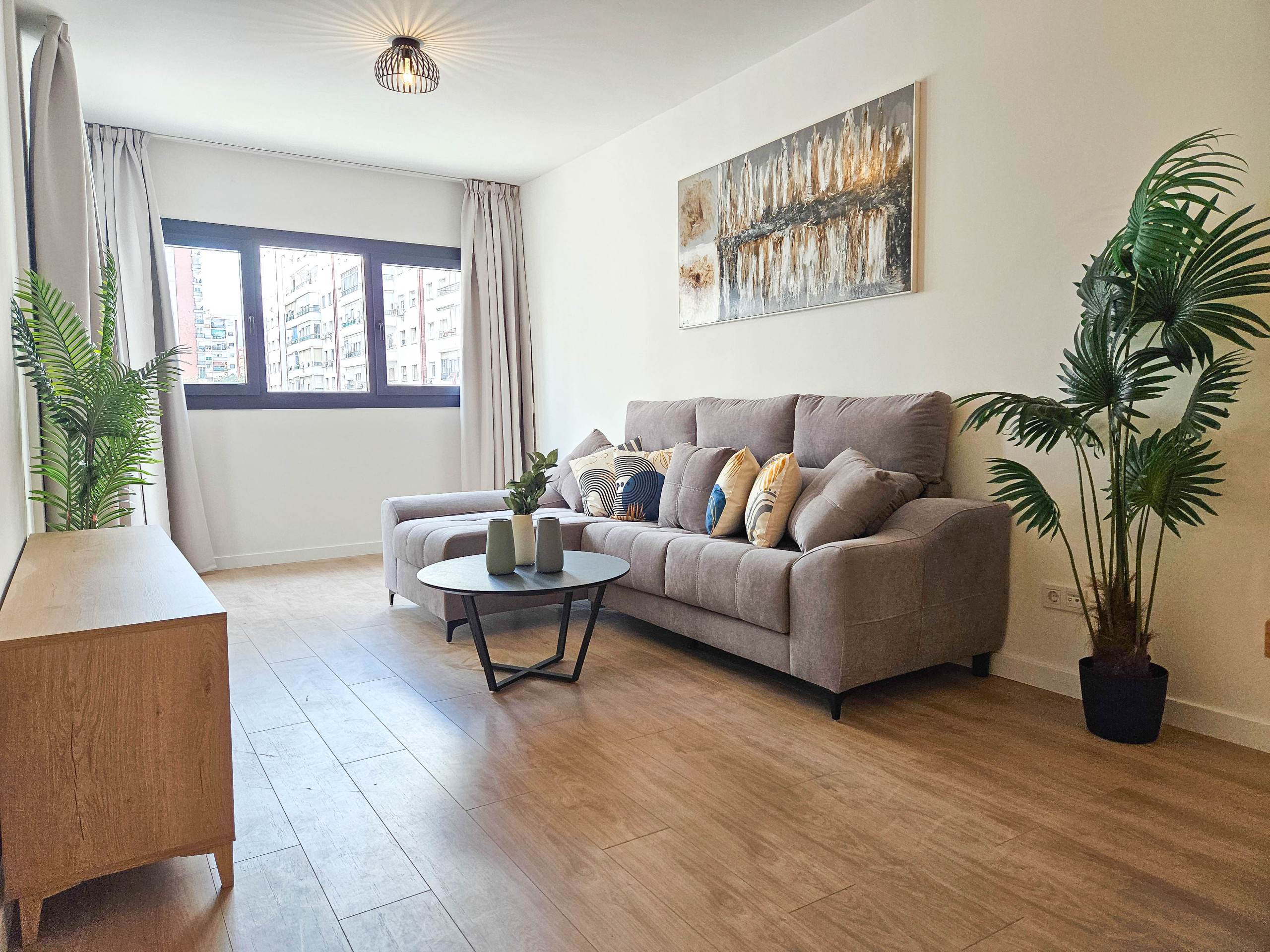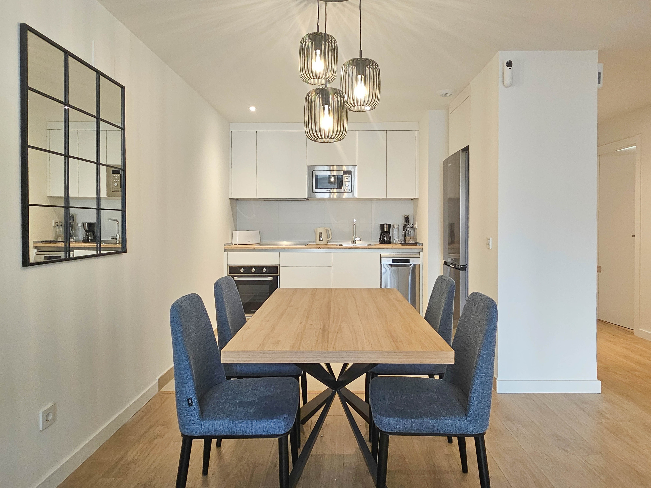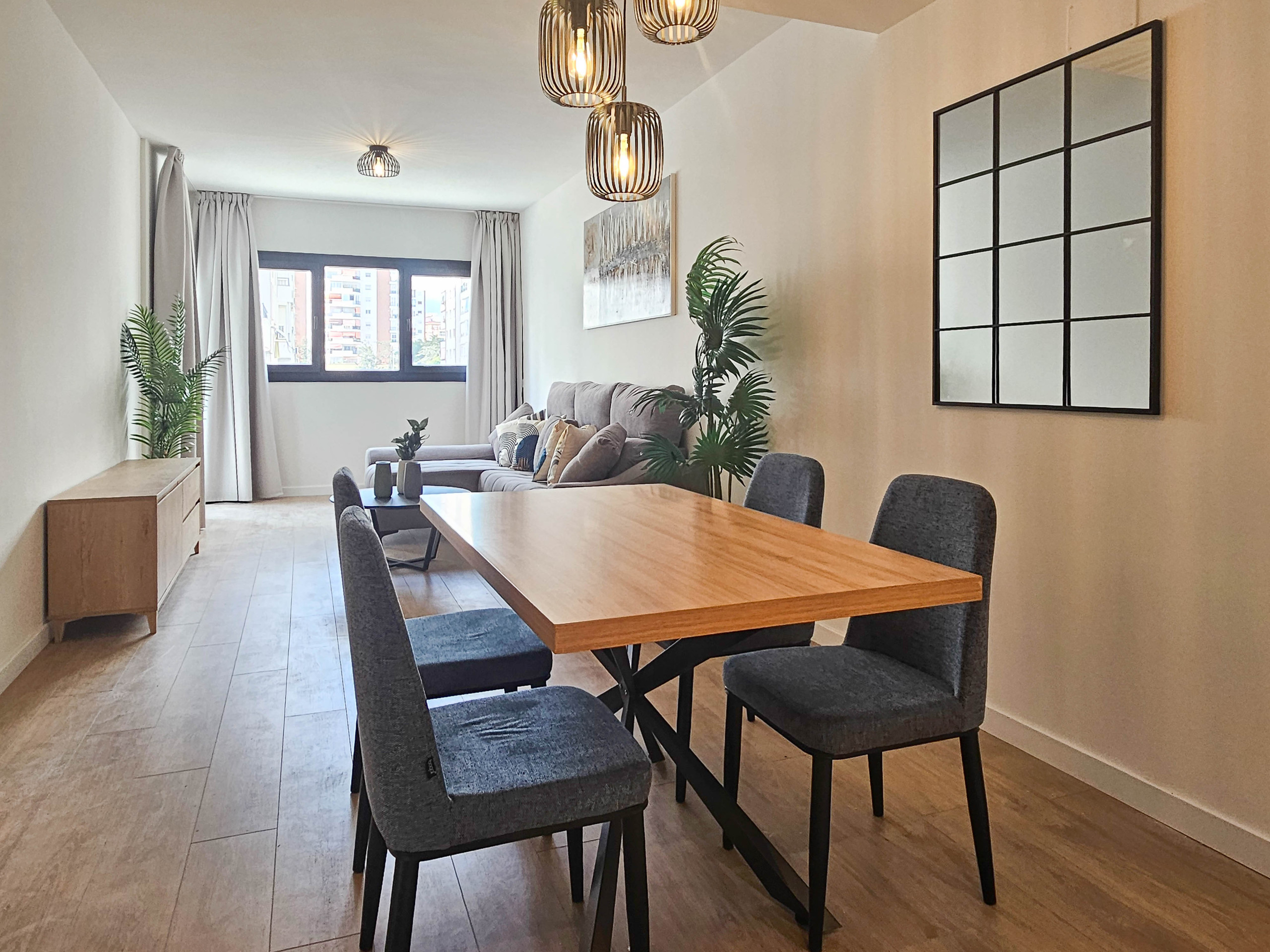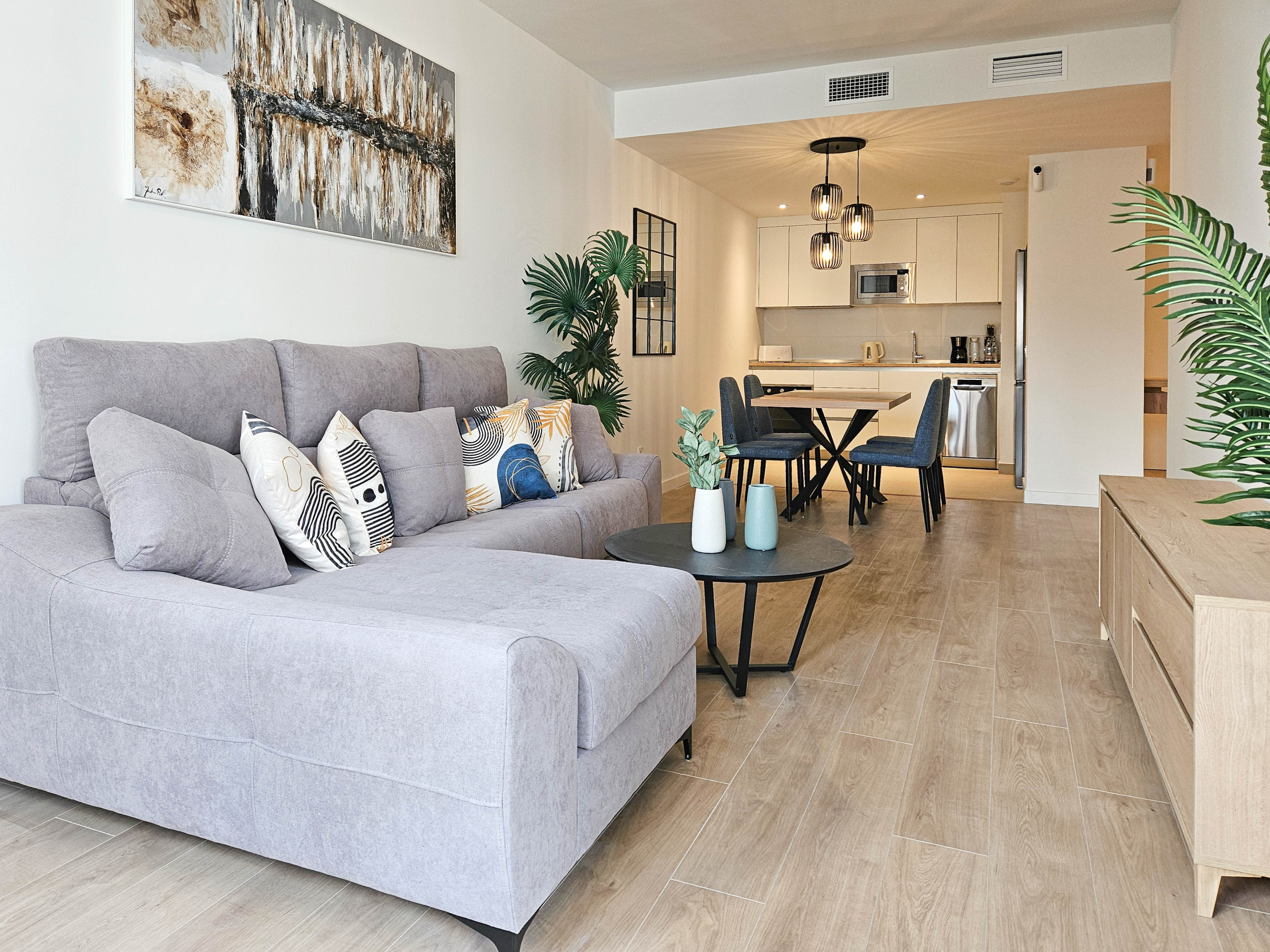 El apartamento está ubicado en la primera planta y se accede por escaleras. En su interior, el espacio está distribuido en un solo nivel con una zona de estar de planta abierta que incluye aire acondicionado, dos sofás, un televisor inteligente de 43 pulgadas, una mesa de comedor con sillas y una cocina bien equipada.
