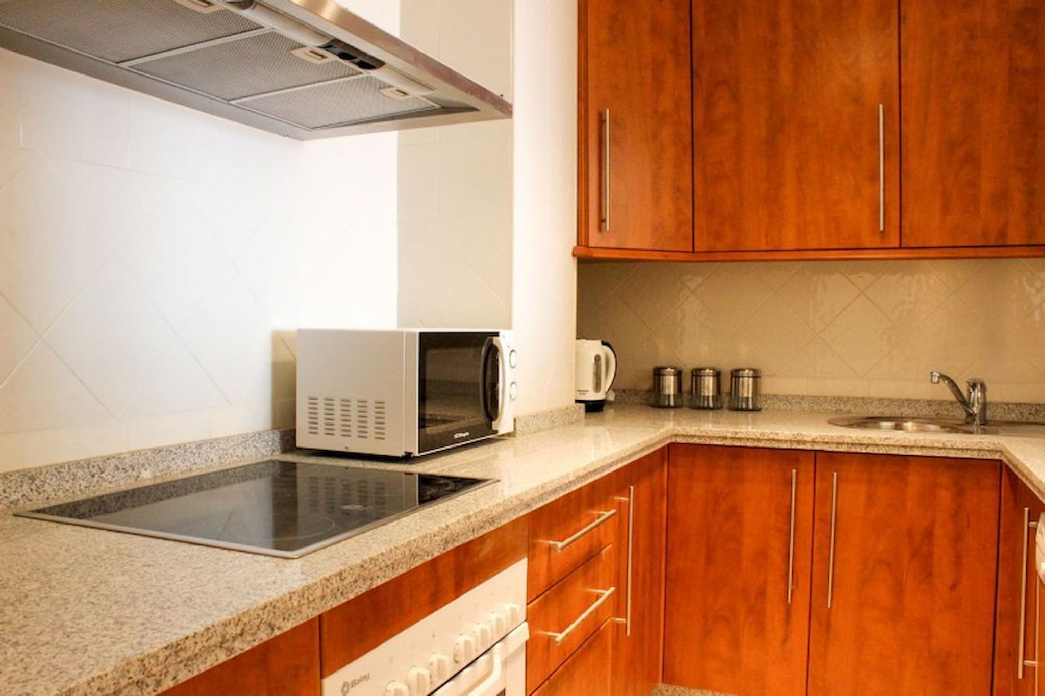 La cocina independiente, eléctrica, está equipada con nevera, microondas, horno, congelador, lavavajillas y fogones.