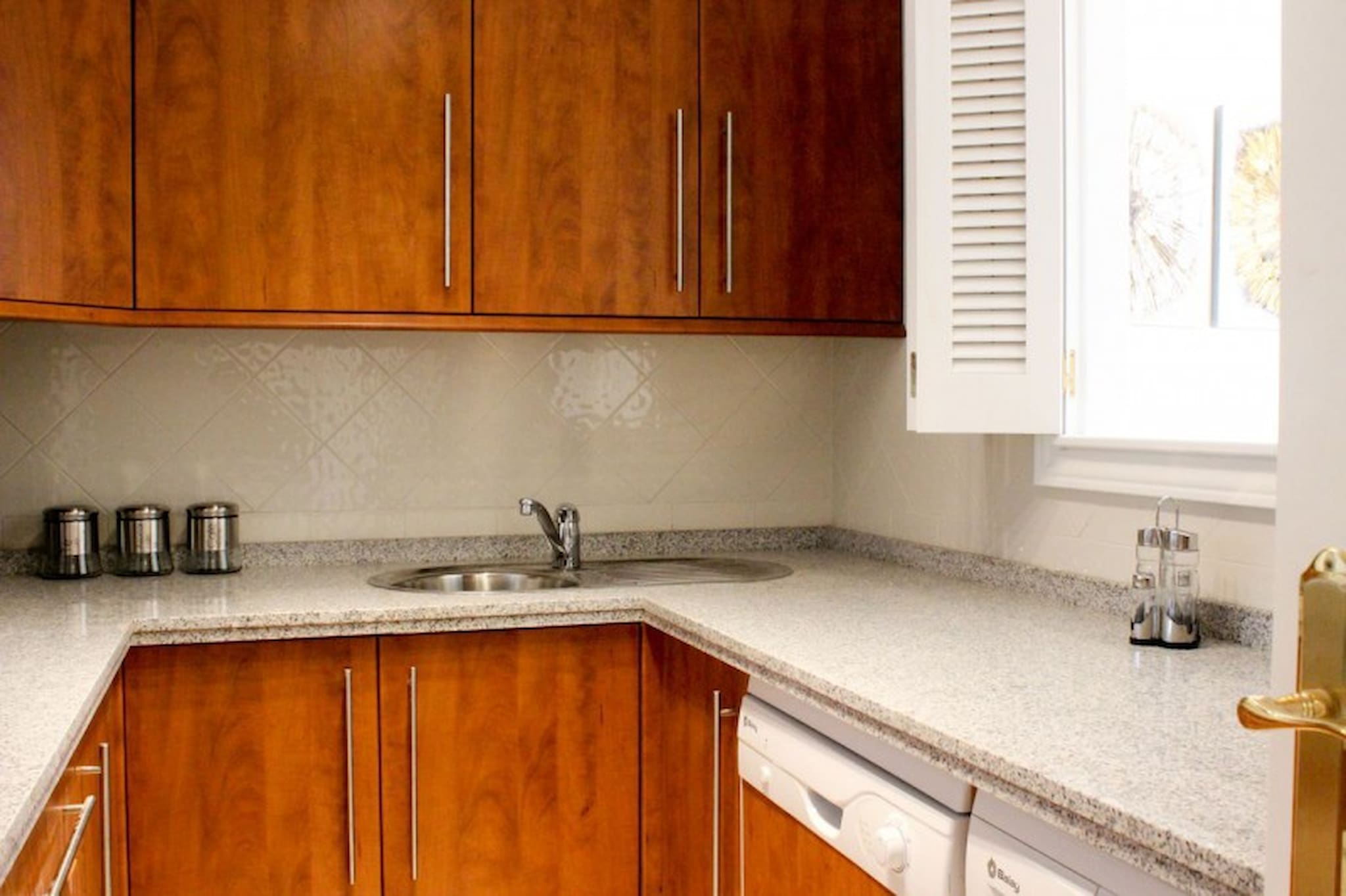 Este apartamento de primera planta entra en un amplio pasillo con la cocina totalmente equipada a la derecha. También hay una zona de servicio separada. Al otro lado del pasillo, frente a la cocina, está la zona de estar y comedor amueblada con una mesa de comedor color crema y cuatro sillas, un aparador de madera, mesa de centro, dos sofás grandes de dos plazas y un televisor inteligente que incluye 195 canales internacionales y un reproductor de DVD con una selección de DVD.