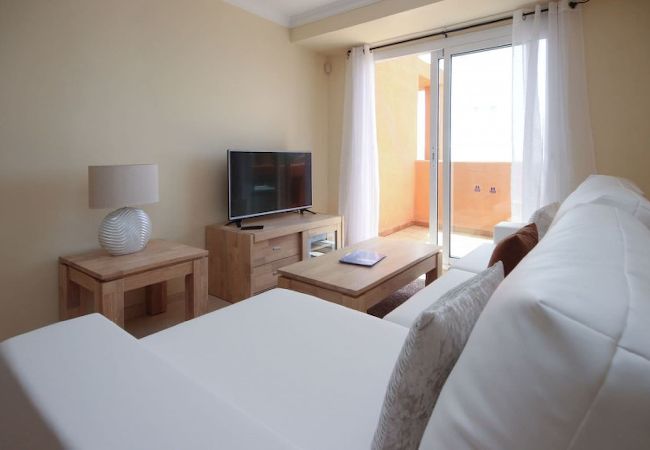 Entras en el apartamento con la cocina americana a tu derecha, que está equipada con una superficie de trabajo y armarios, horno, placa de cocina y extractor, frigorífico congelador y lavavajillas. La zona de cocina americana conduce a un salón y comedor espacioso y luminoso que tiene un gran sofá cama, mesa de centro, televisión, radio Jacobsen y mesa de comedor con sillas. Hay una pequeña terraza cubierta con una mesa de comedor y sillas que da a los jardines del complejo y tiene unas vistas espectaculares del mar.