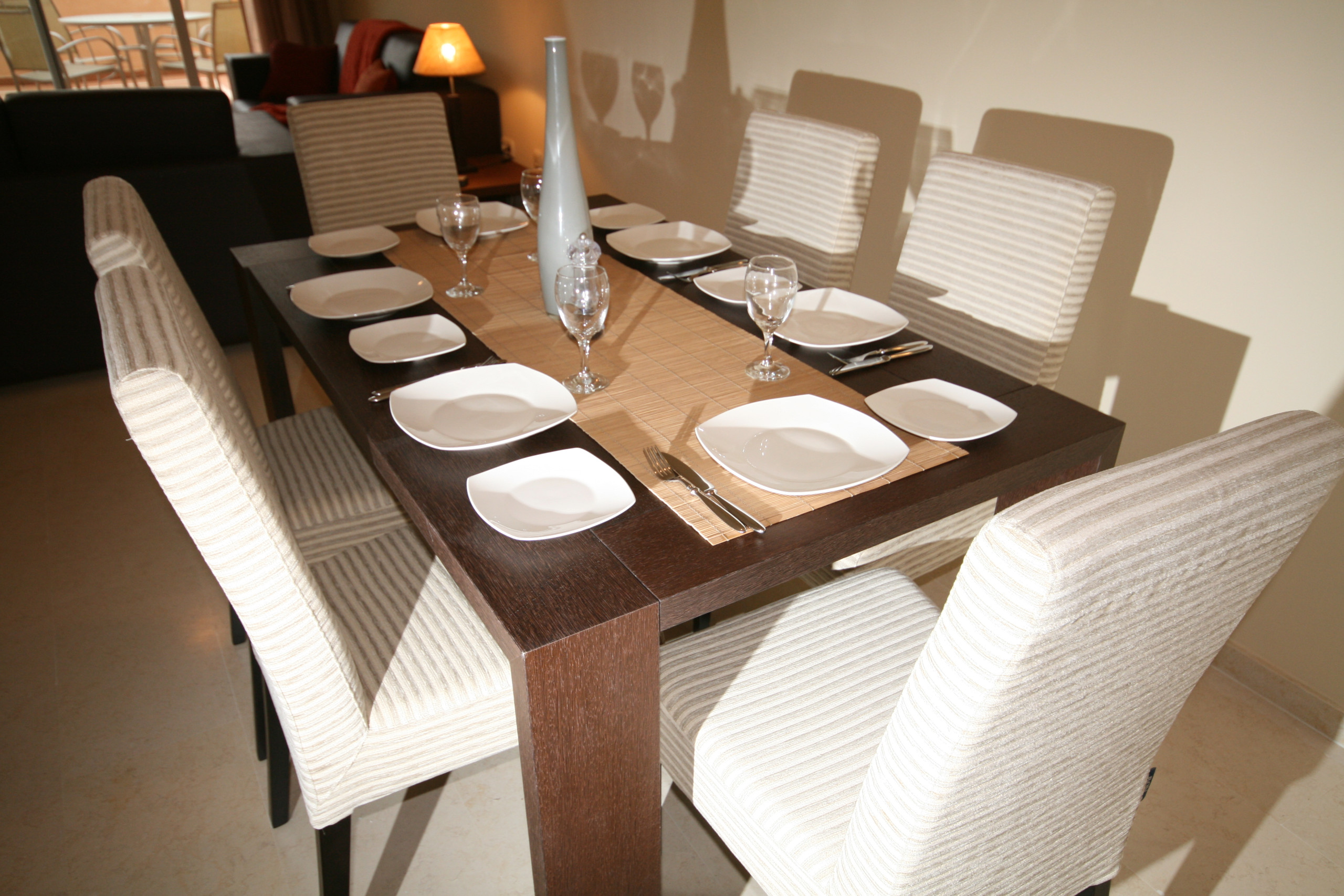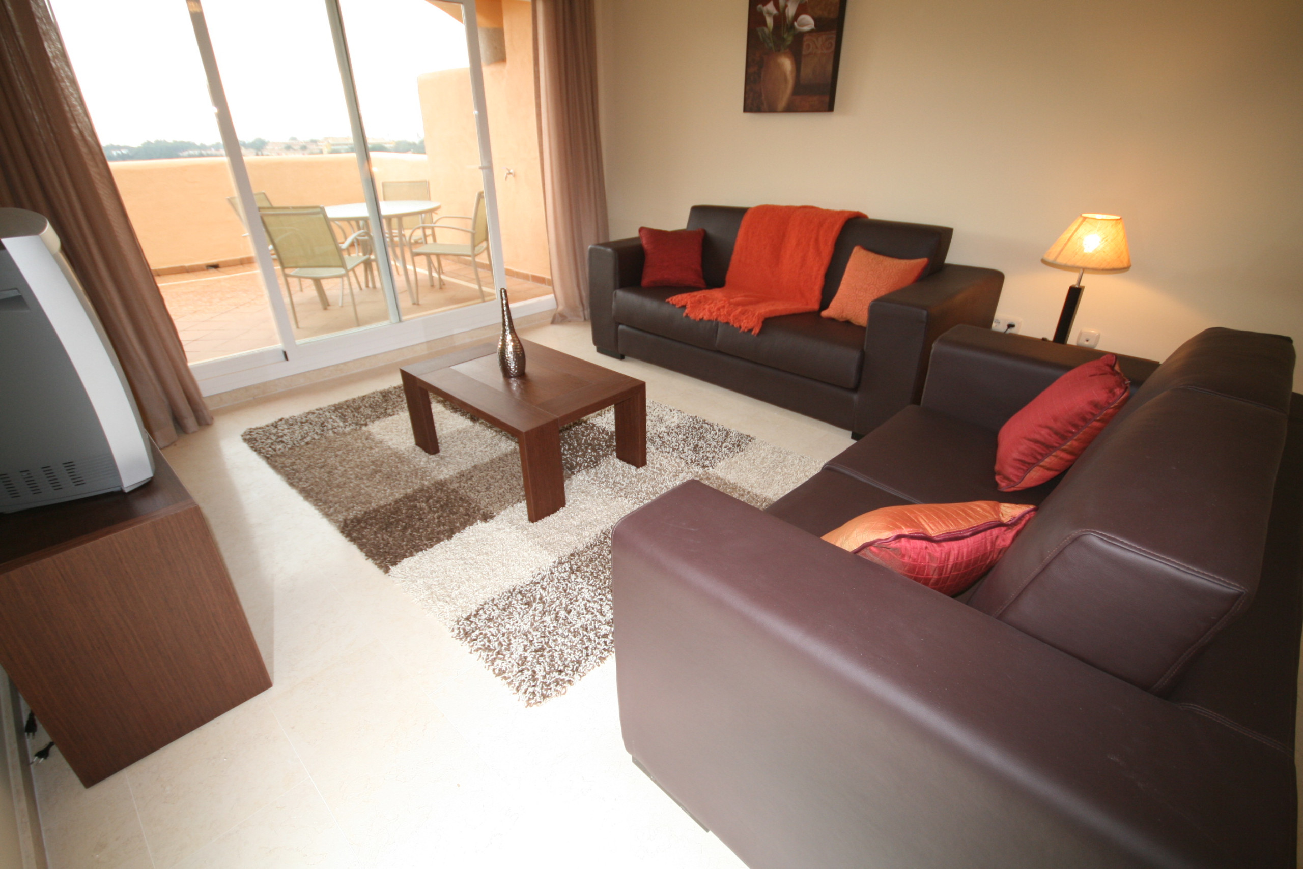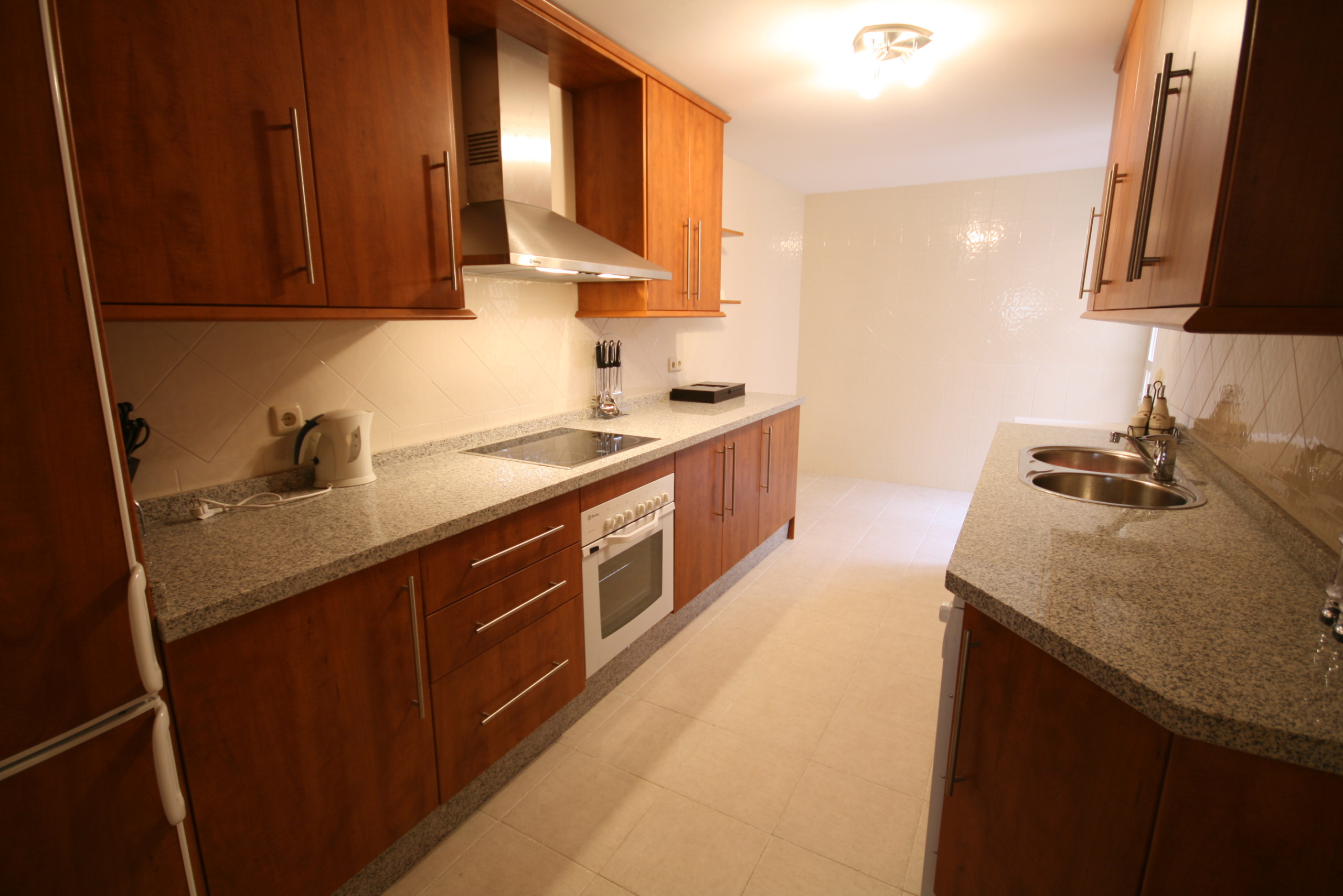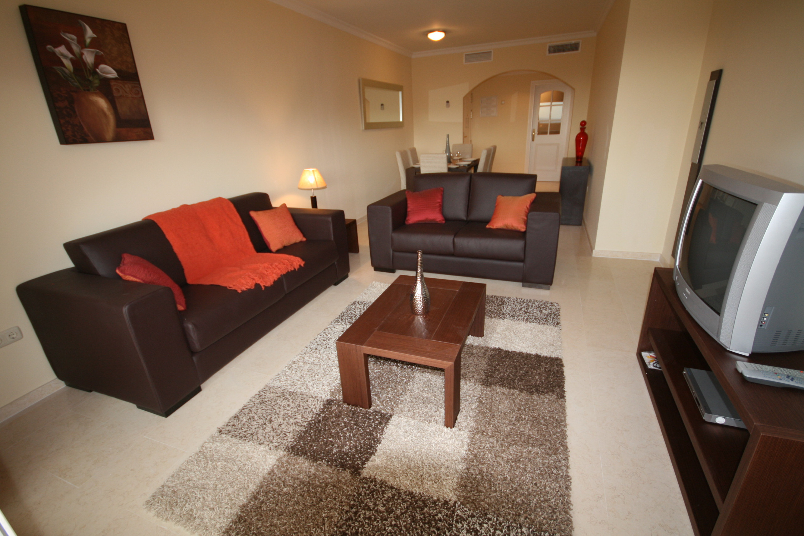 Este apartamento de primera planta entra en un amplio pasillo con la cocina totalmente equipada a la derecha. También hay una zona de servicio separada. Al otro lado del pasillo, frente a la cocina, está la zona de estar y comedor amueblada con una mesa de comedor color crema y cuatro sillas, un aparador de madera, mesa de centro, dos sofás grandes de dos plazas y un televisor inteligente que incluye 195 canales internacionales y un reproductor de DVD con una selección de DVD.