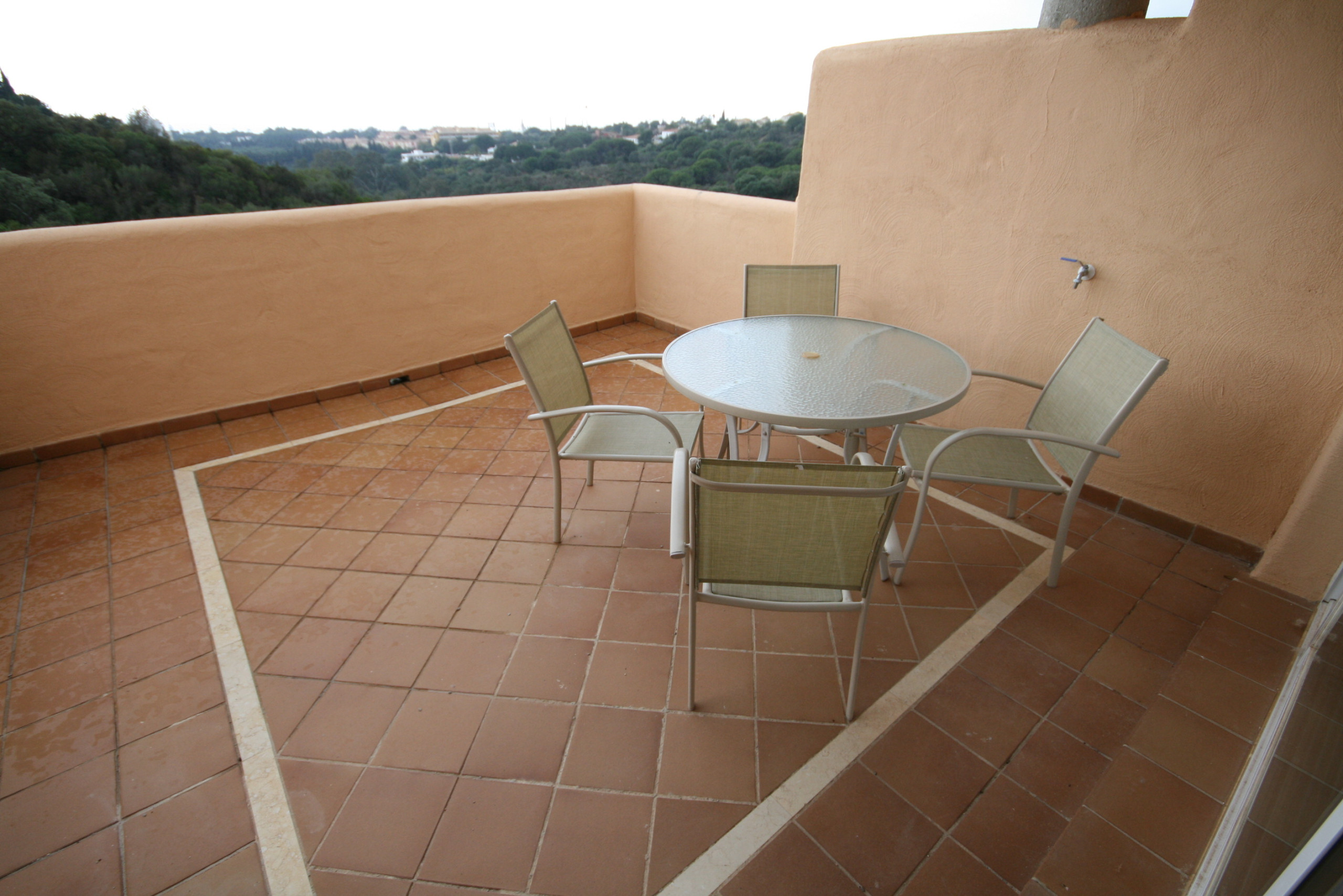 Tanto el dormitorio principal como el salón dan a una terraza cubierta que puede cerrarse completamente en los días más fríos. La terraza está amueblada con una mesa de comedor y sillas, y un sofá y sillones; es un espacio donde se puede disfrutar relajándose y contemplando las maravillosas vistas al mar, independientemente del clima.