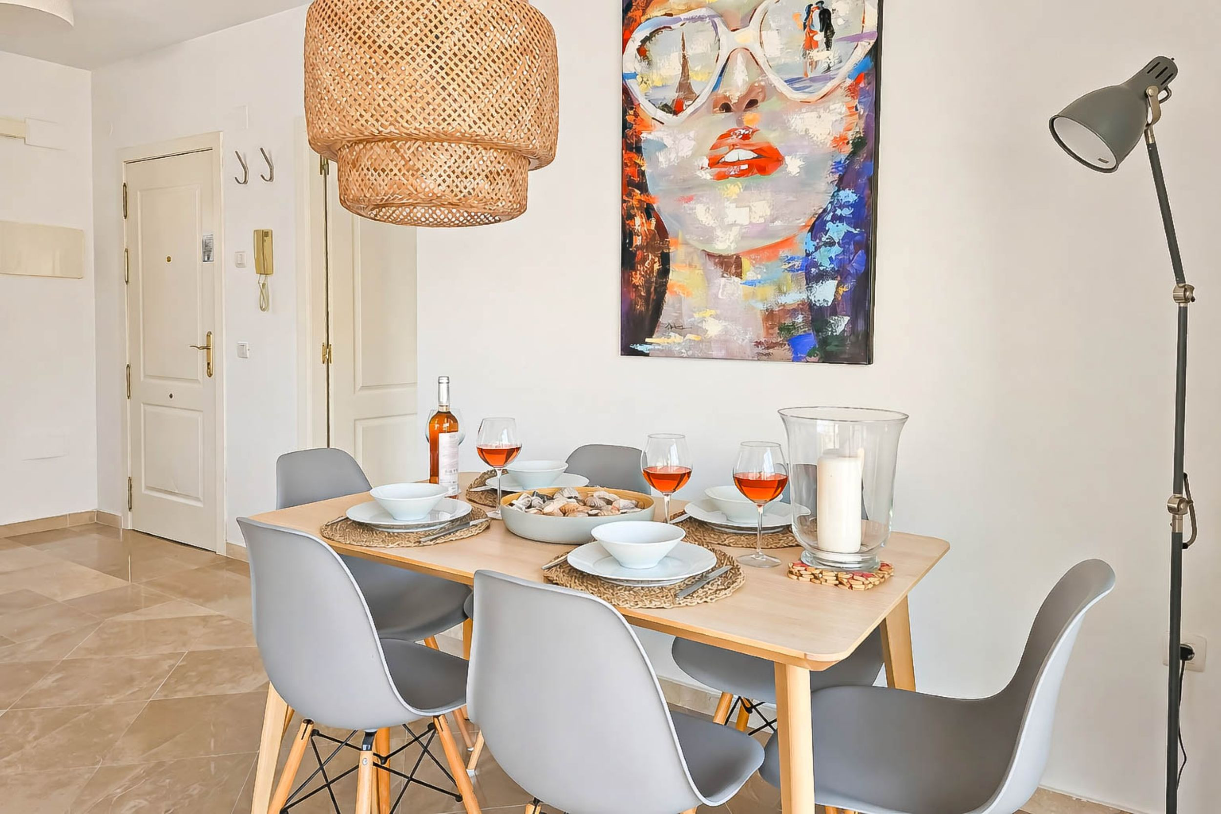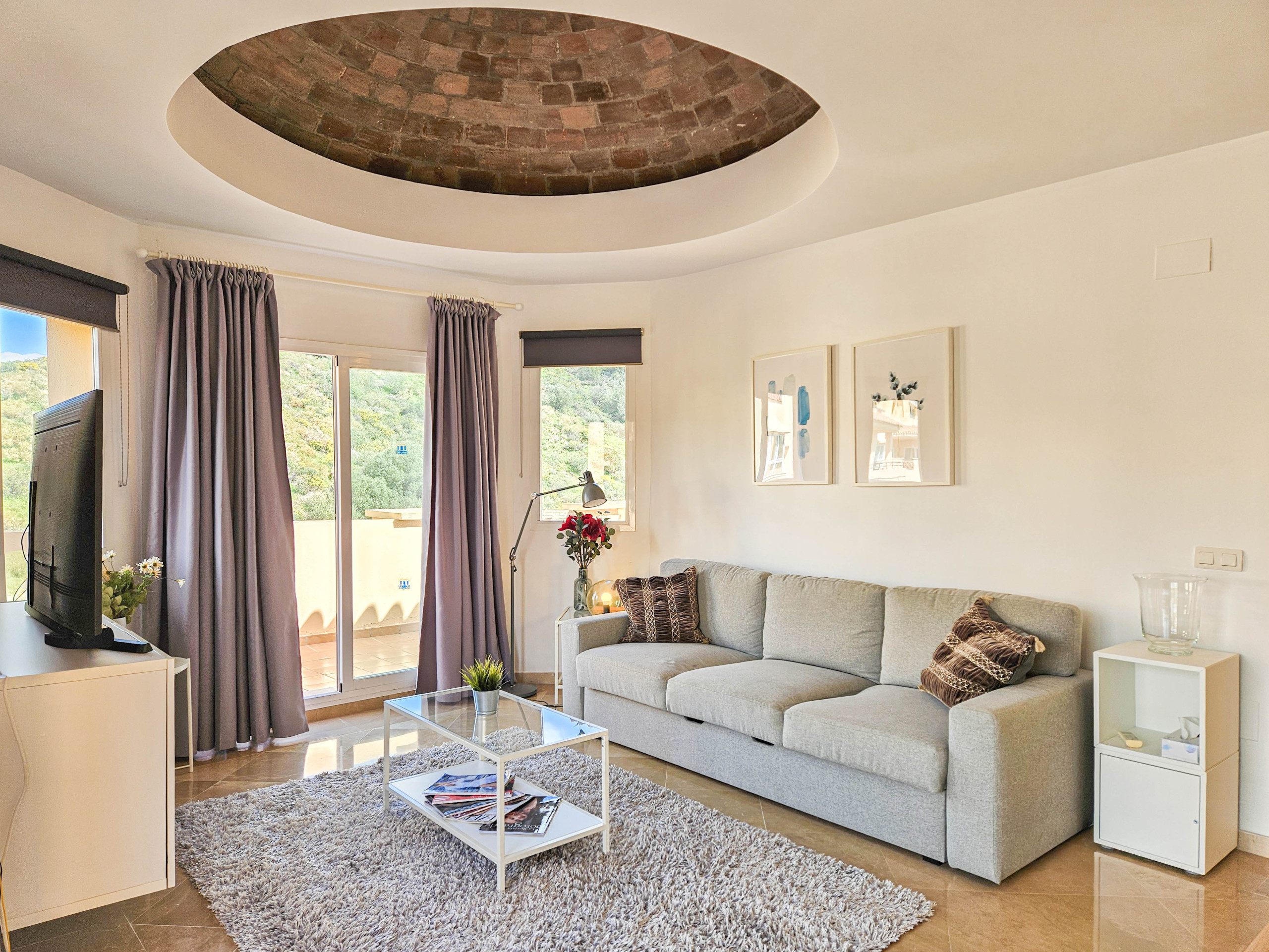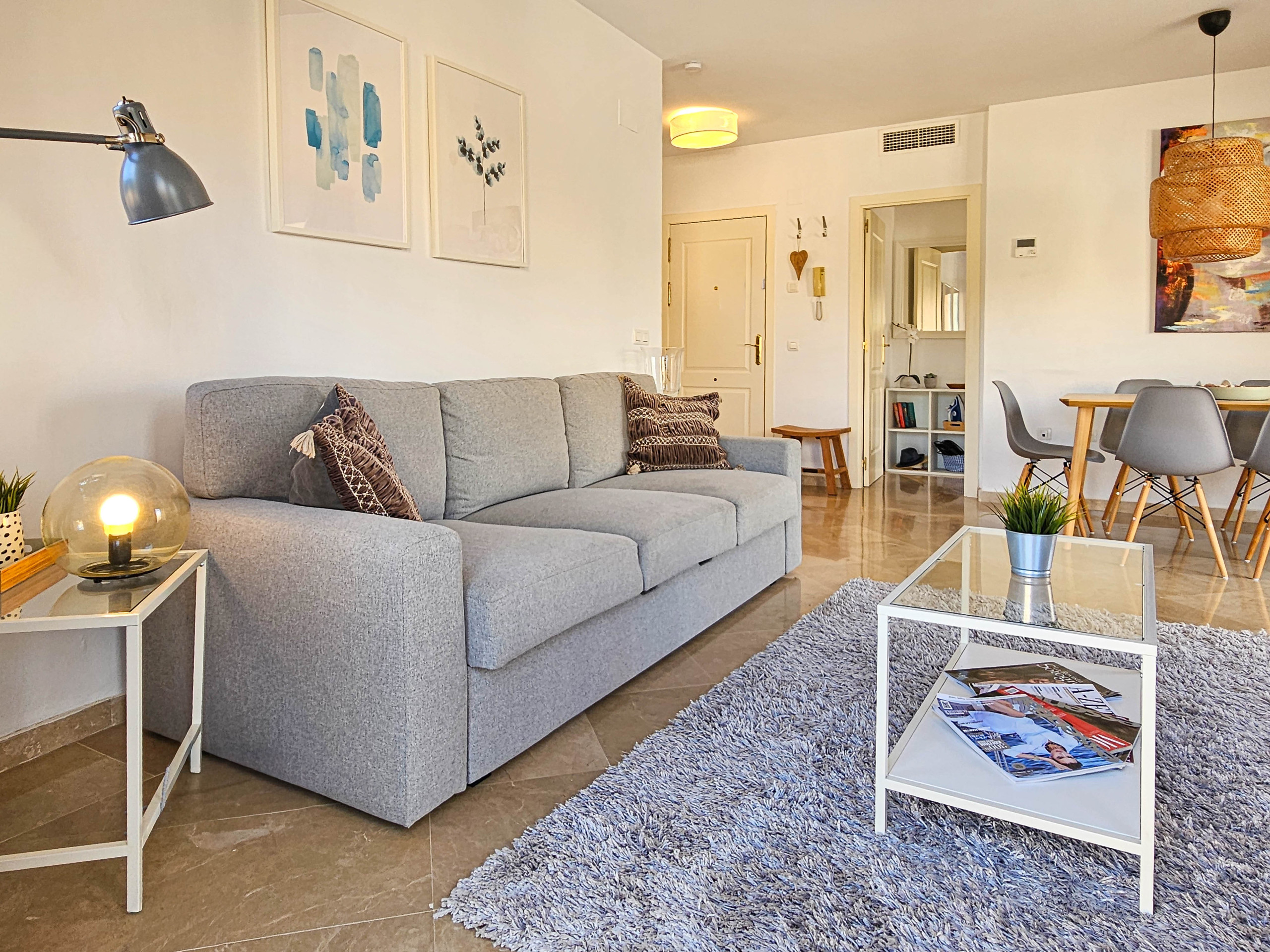 Ubicado en la tercera planta con acceso por ascensor, este espacioso apartamento está distribuido en un solo nivel. La propiedad cuenta con una cocina independiente y bien equipada, mientras que la zona de estar de planta abierta ofrece un espacio para comer y un sofá que se convierte en una cama doble, permitiendo que el apartamento pueda alojar cómodamente hasta cuatro huéspedes. El salón también incluye un televisor inteligente de 50" y una barra de sonido.