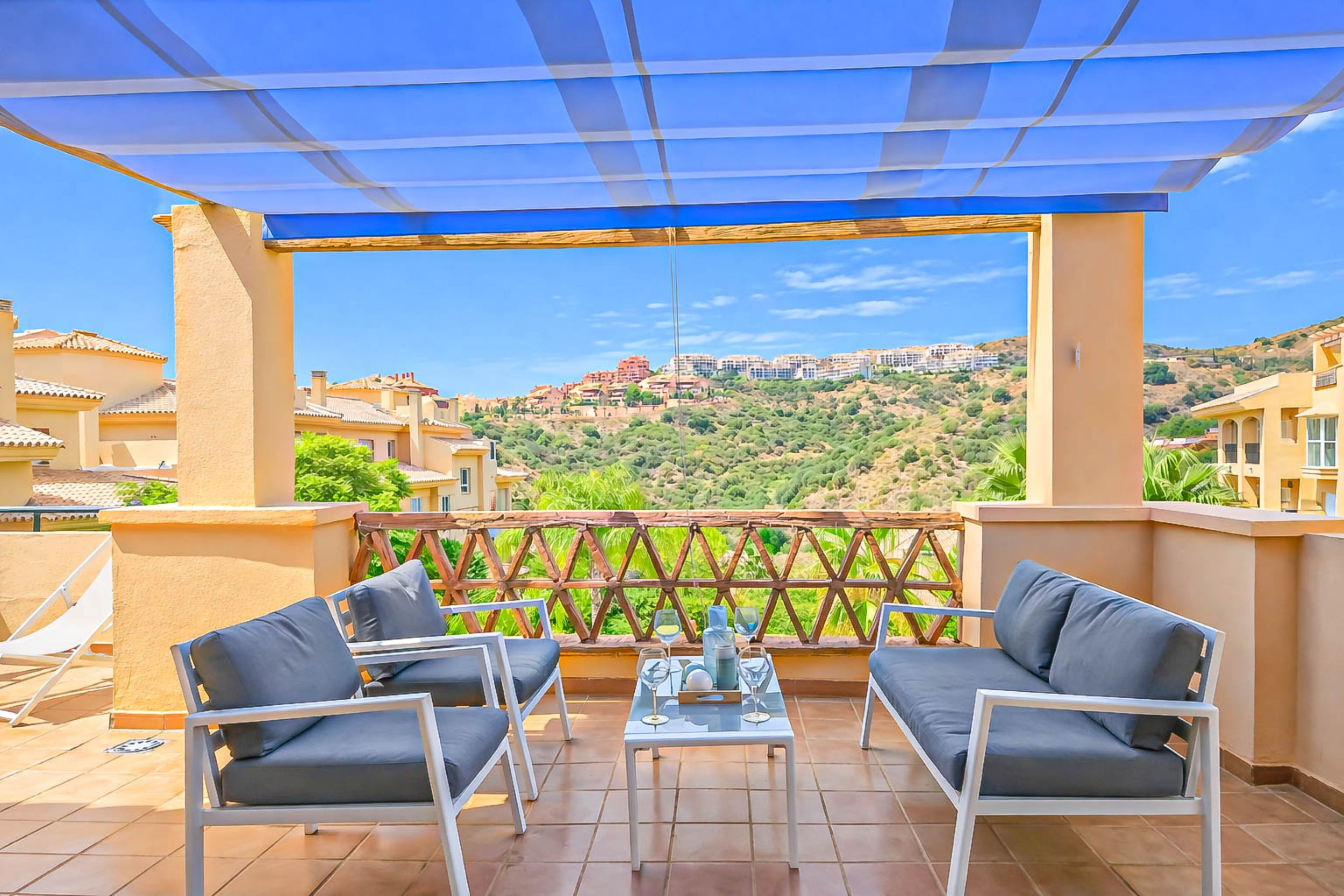 Las áreas de estar y comedor proporcionan acceso directo a una gran terraza envolvente orientada al oeste donde puedes relajarte y disfrutar de las vistas de la piscina. La terraza cuenta con asientos de salón cómodos, un área de comedor, tumbonas, una barbacoa de carbón integrada y una pérgola para dar sombra en los días más cálidos.