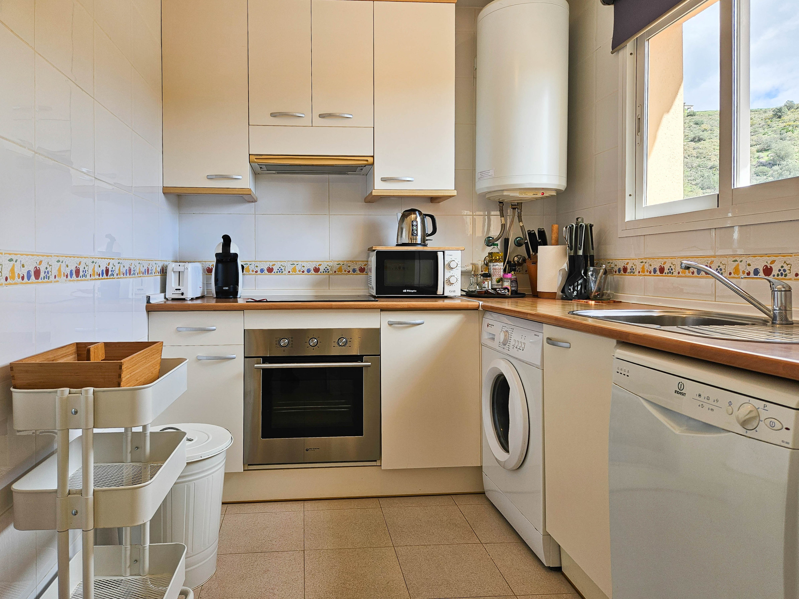Este apartamento de dos dormitorios está convenientemente ubicado en el complejo de Las Farolas, Mijas Costa. El complejo ofrece hermosos jardines comunitarios bien mantenidos y una zona de piscina, y está a solo 700 m de la playa. El campo de golf El Chaparral está a solo 1 km del complejo y hay un restaurante convenientemente ubicado a 200 m. La Cala está a solo unos minutos de distancia (3 km) y está llena de cultura, bares, restaurantes, tiendas, bancos, grandes playas, etc. Fuengirola está a solo 3 km en la otra dirección, con muchas tiendas, vida nocturna, castillo y largas extensiones de playas. El apartamento está equipado con ventiladores de techo y unidades de aire acondicionado en el salón y los dormitorios, y WIFI gratuito.