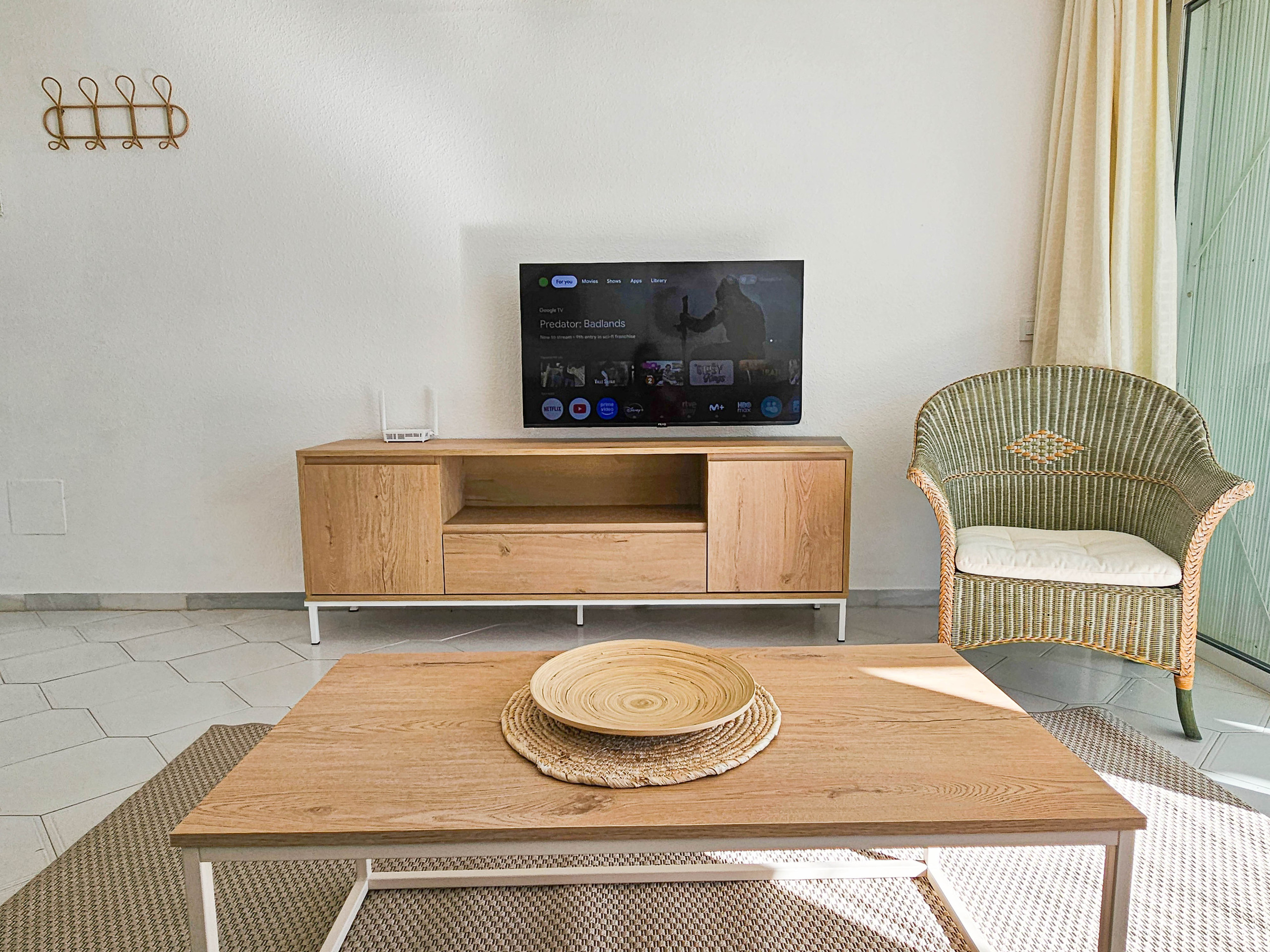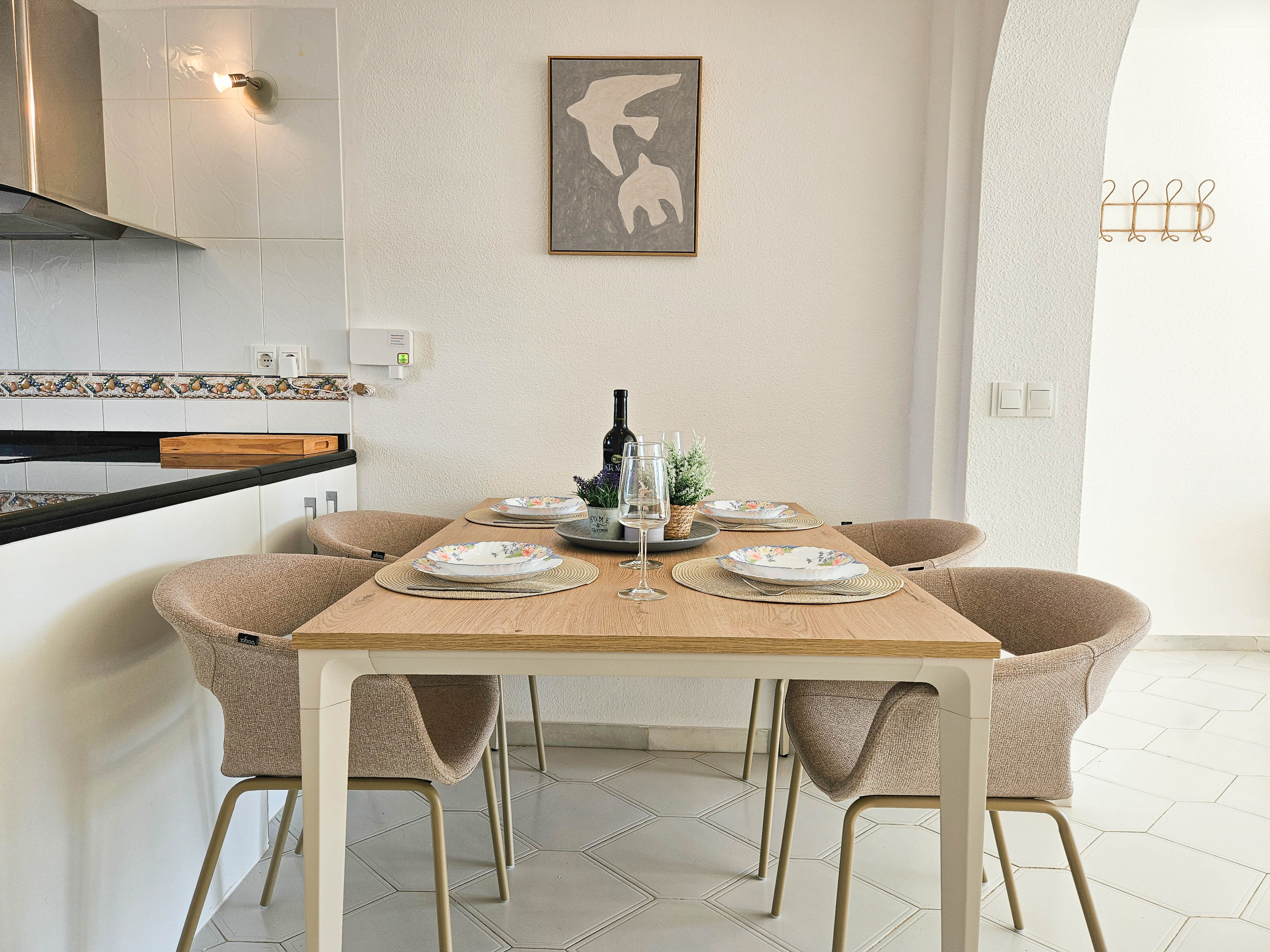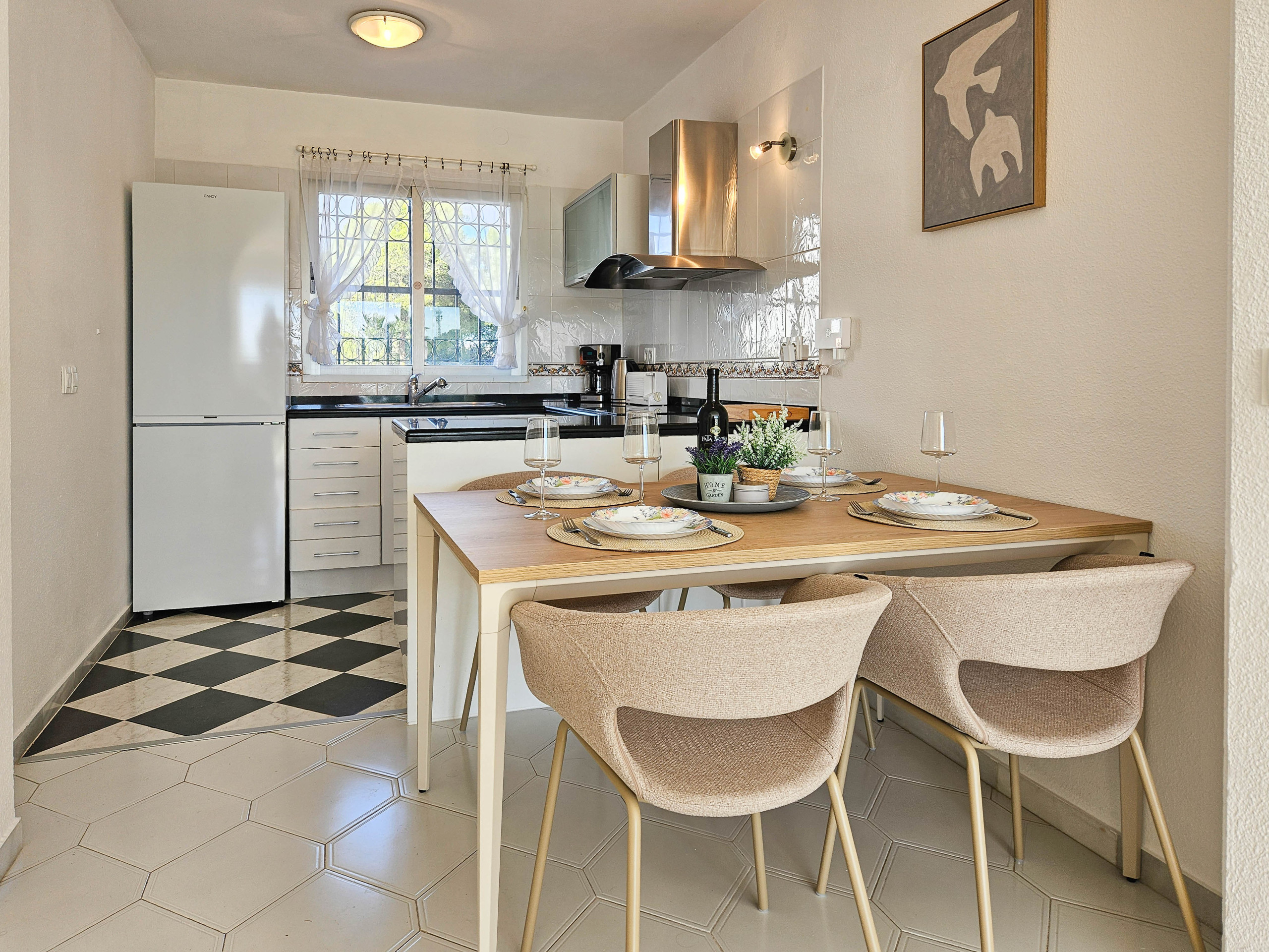 El apartamento amueblado con gusto está situado en la planta baja, al que se accede a través de una pequeña escalera, y está distribuido en un solo nivel. El luminoso salón de planta abierta incluye un sofá y un sillón, un televisor inteligente de 43 pulgadas, una zona de comedor y una cocina bien equipada.