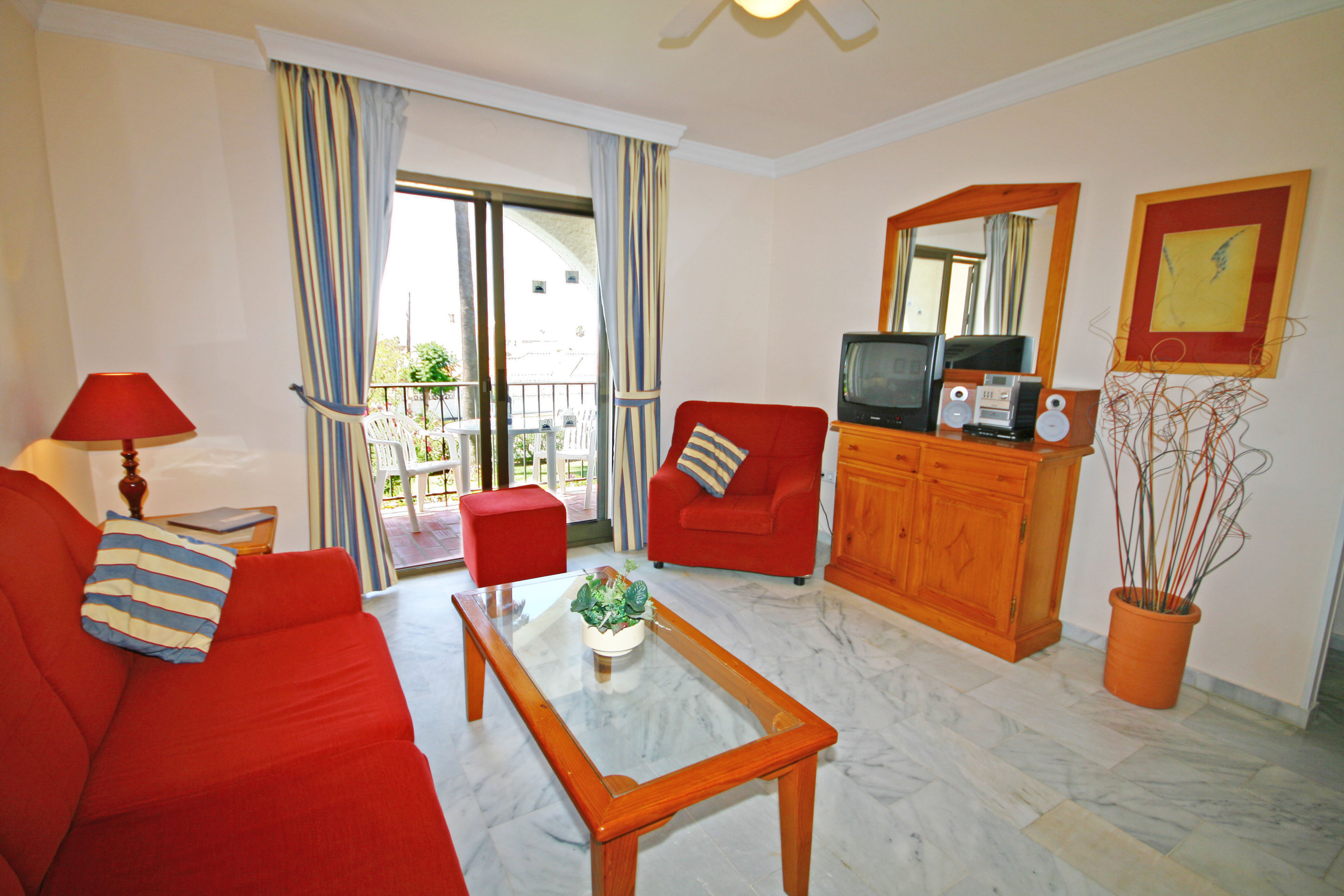 Este espacioso apartamento está ubicado en la tercera planta, con acceso por ascensor y distribuido en una sola planta. Hay una cocina independiente y totalmente equipada, y el espacio de estar diáfano ofrece una zona de comedor y un sofá en forma de L que se abre para convertirse en una cama doble, para dormir dos personas. También hay un televisor inteligente de 50 pulgadas y una barra de sonido. Se puede acceder a la terraza envolvente desde las zonas de estar y comedor. Aquí se pueden disfrutar vistas a la piscina mientras se relaja en las zonas de estar o comedor. Hay tumbonas, una barbacoa de carbón integrada y un toldo para los días más calurosos.