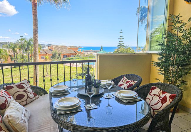 Este apartamento de primera planta está distribuido en un solo nivel, con acceso por ascensor. La cocina independiente está bien equipada y cuenta con un cuarto de servicio, equipado con una lavadora. El espacio de estar ofrece un área de comedor, dos sofás, ambos con asientos reclinables y un televisor inteligente de 42 pulgadas. Desde el salón, se accede a la terraza cubierta desde donde se pueden disfrutar vistas sobre la piscina, hasta el mar. La terraza ofrece un área de asientos para comer.