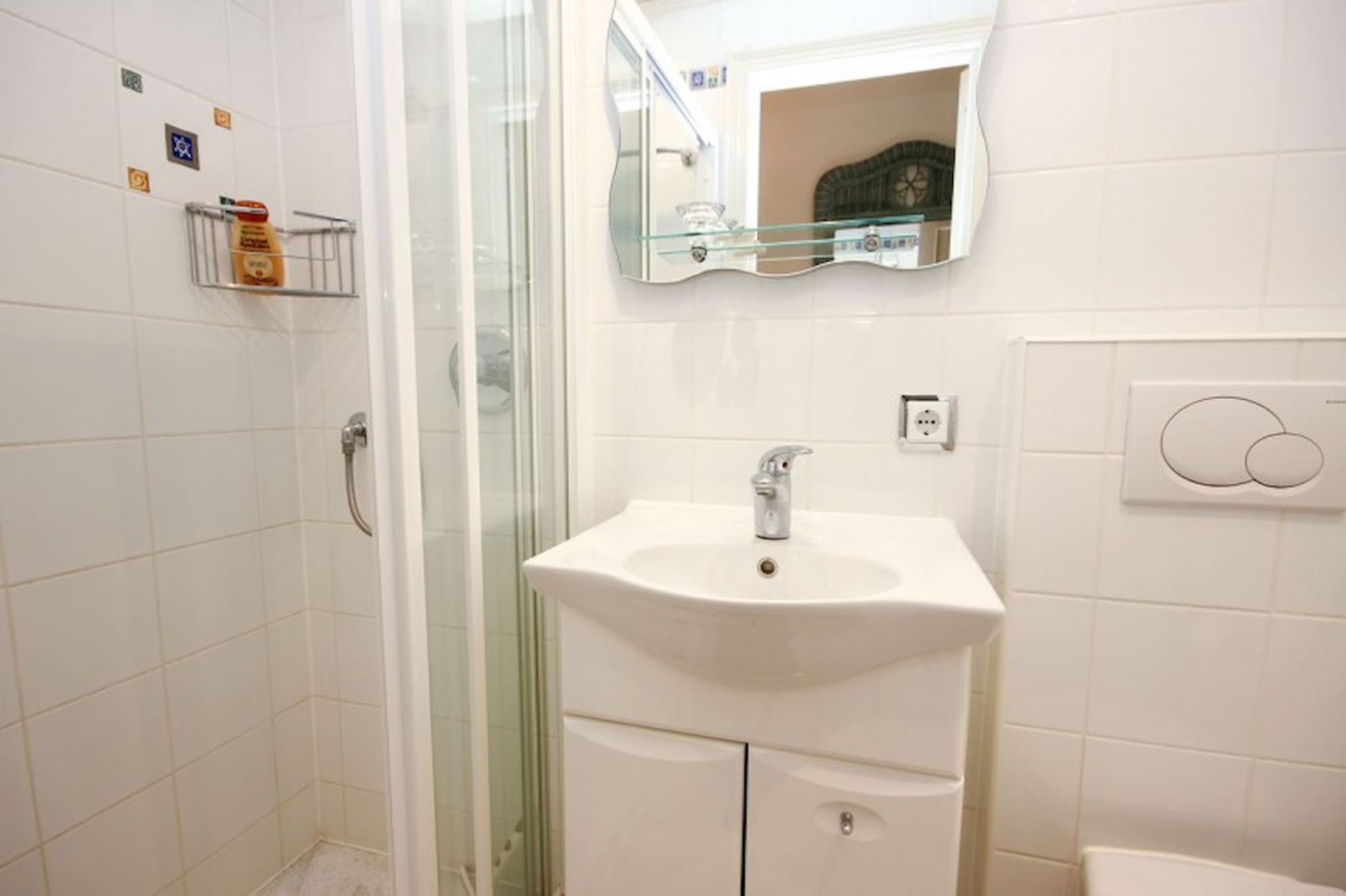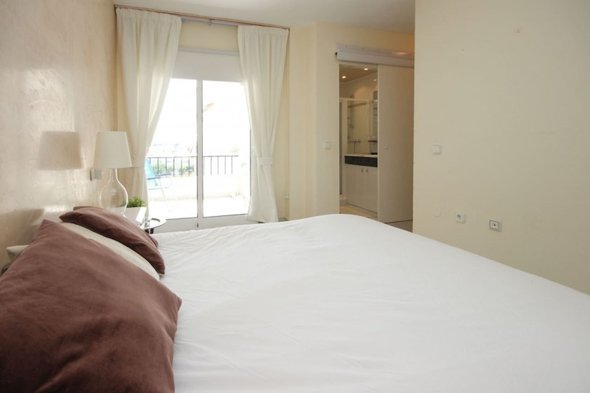 El dormitorio principal está amueblado con una cama de matrimonio grande y se beneficia de armarios empotrados. Este dormitorio cuenta con su propio cuarto de baño en suite con ducha sobre la bañera y acceso directo a la terraza. El segundo dormitorio está amueblado con dos camas individuales y también cuenta con armarios empotrados. Si solo una persona utiliza la habitación, las camas pueden guardarse una debajo de la otra para ganar más espacio. También hay un sofá cama, por lo que en total la propiedad puede alojar a 5 personas. El apartamento está equipado con aire acondicionado en toda la vivienda.