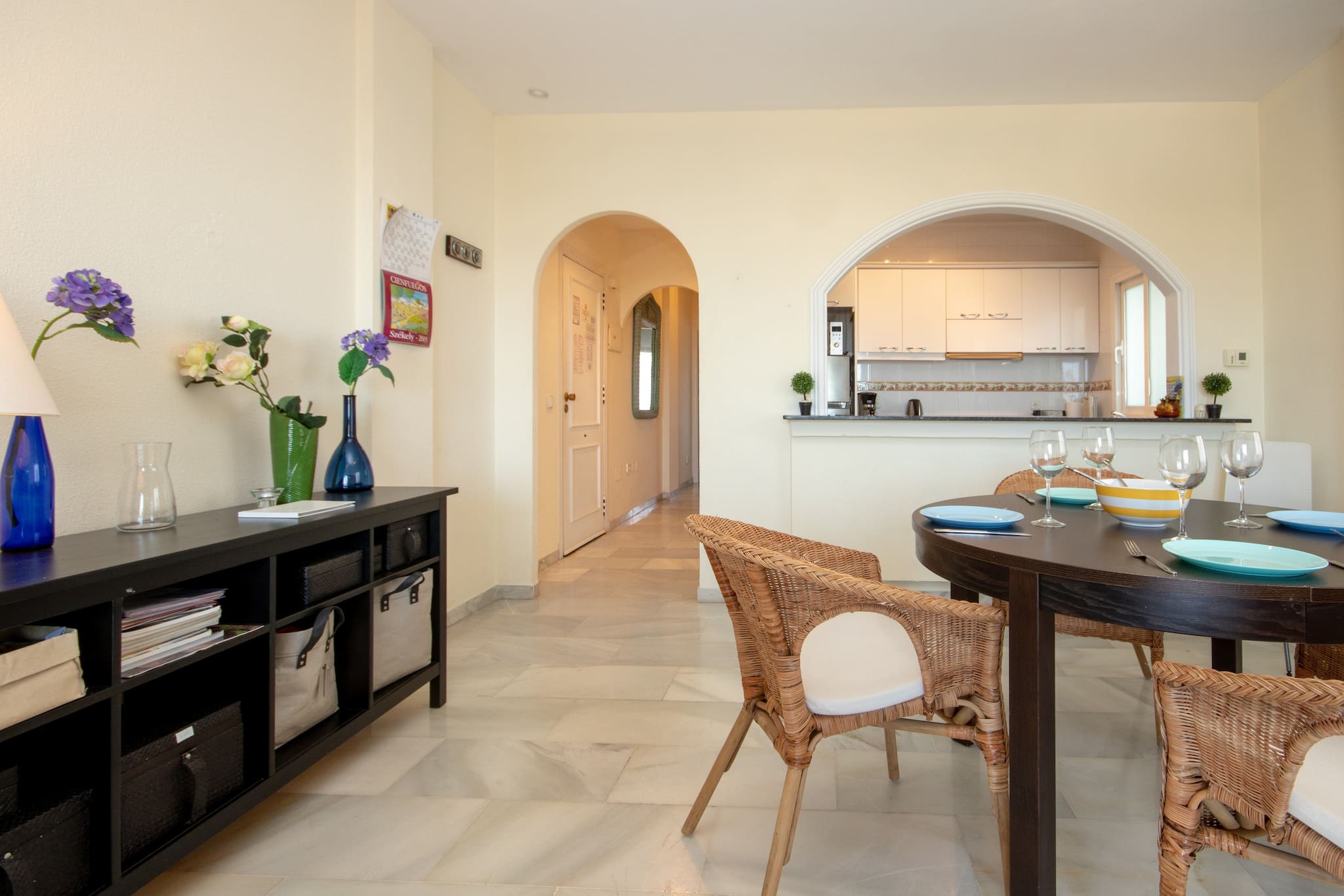 Esta propiedad se accede bajando unos escalones donde se entra a un pasillo. A su derecha hay una cocina equipada que conduce a una terraza cubierta y cerrada. Junto a la cocina se encuentran el aseo de invitados y el dormitorio de invitados amueblado con camas gemelas, mesita de noche y cajones y un armario empotrado.