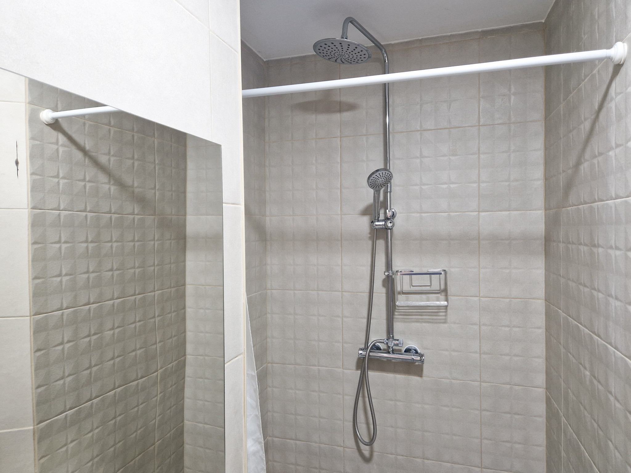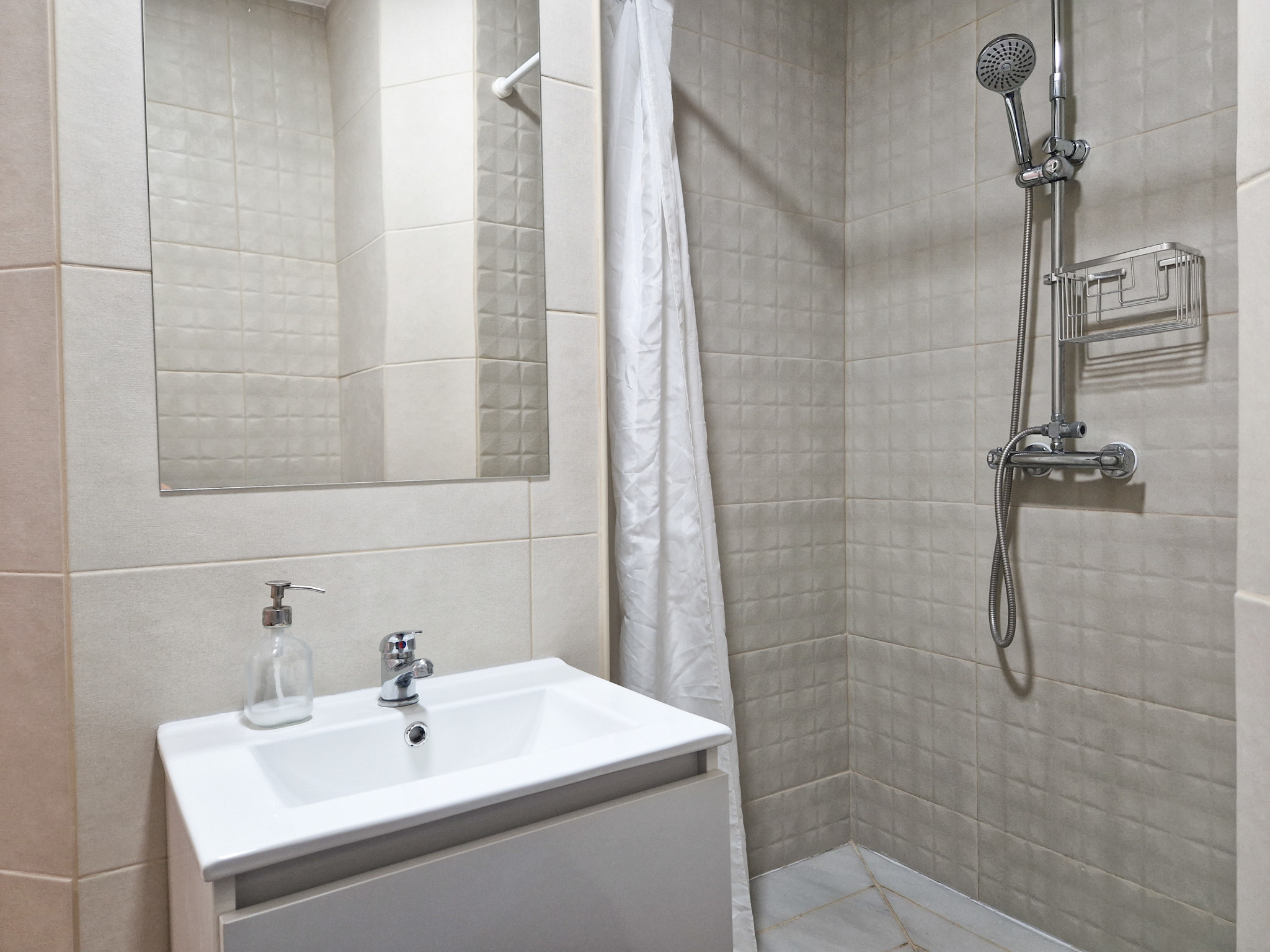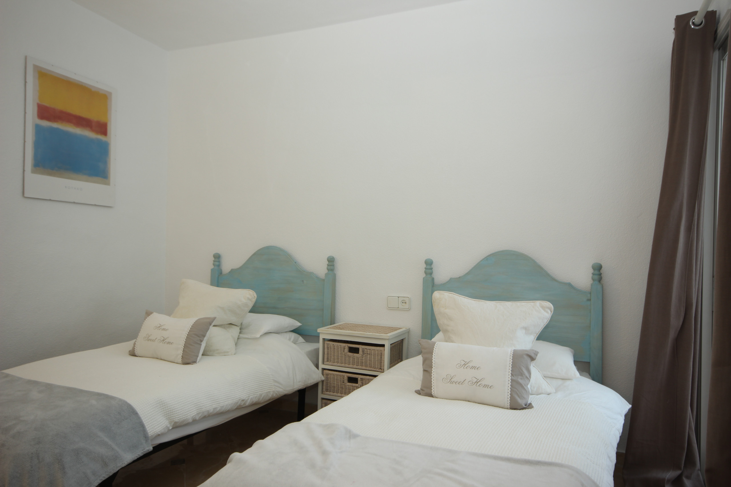 El dormitorio principal está amueblado con una cama de matrimonio grande y se beneficia de armarios empotrados. Este dormitorio cuenta con su propio cuarto de baño en suite con ducha sobre la bañera y acceso directo a la terraza. El segundo dormitorio está amueblado con dos camas individuales y también cuenta con armarios empotrados. Si solo una persona utiliza la habitación, las camas pueden guardarse una debajo de la otra para ganar más espacio. También hay un sofá cama, por lo que en total la propiedad puede alojar a 5 personas. El apartamento está equipado con aire acondicionado en toda la vivienda.