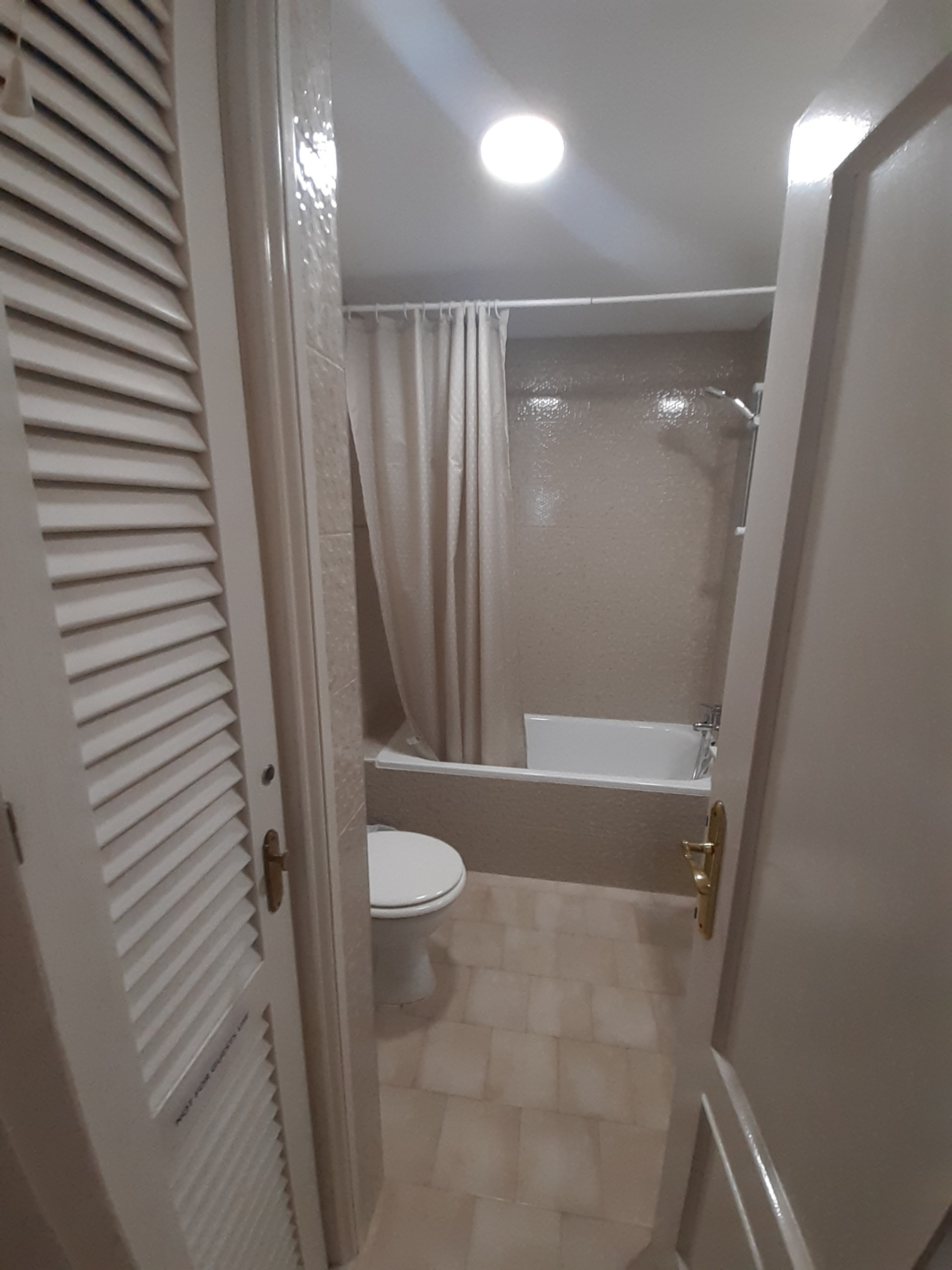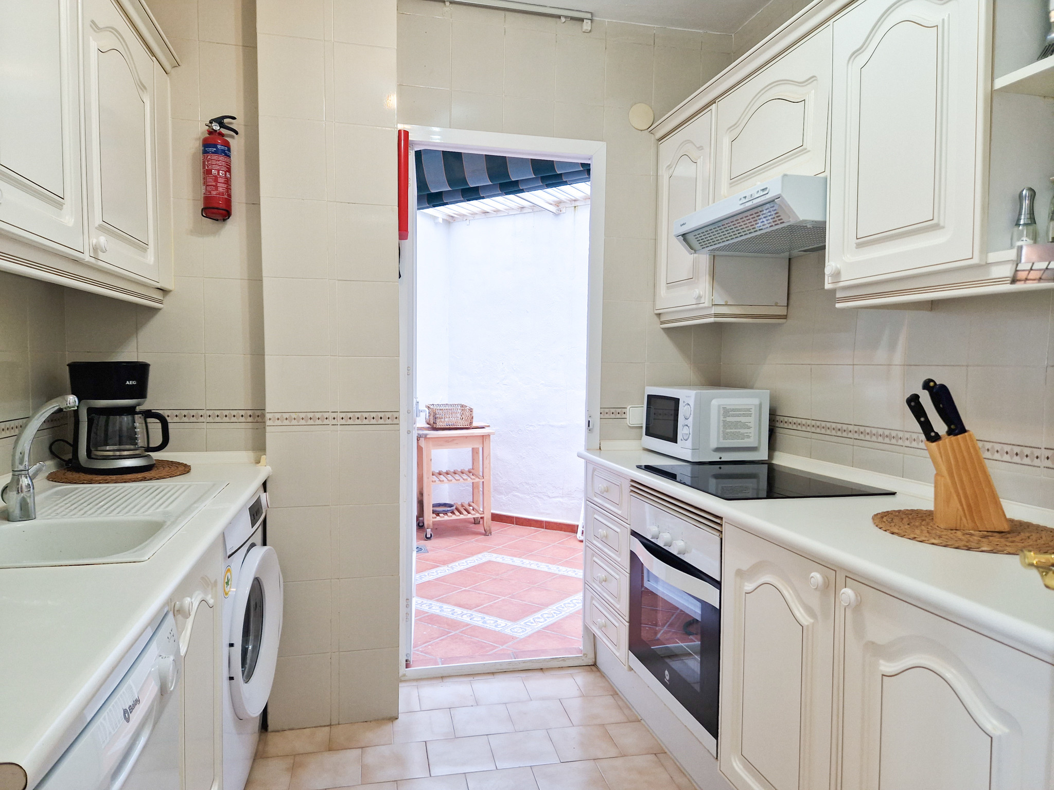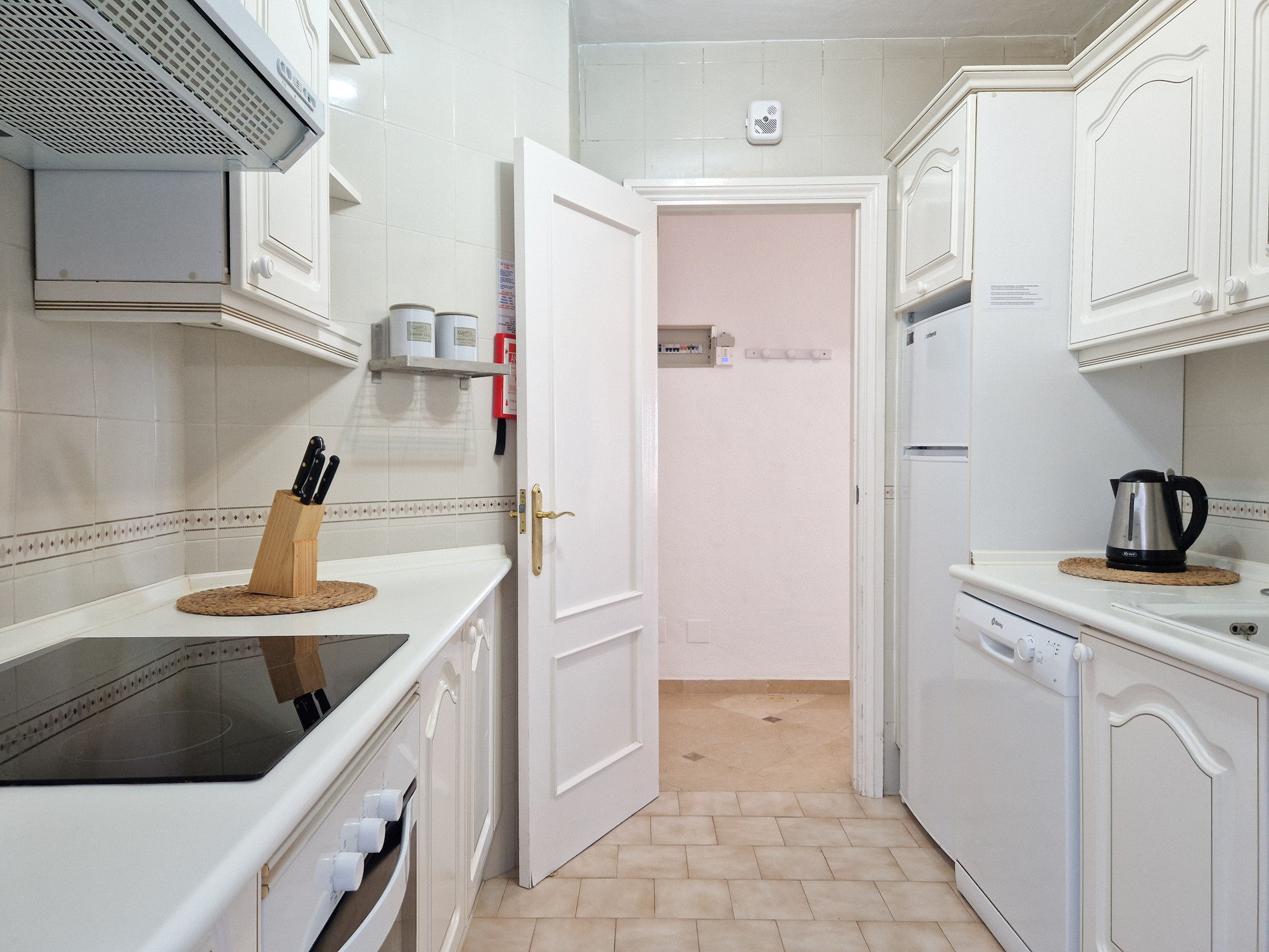 Esta propiedad se accede bajando unos escalones donde se entra a un pasillo. A su derecha hay una cocina equipada que conduce a una terraza cubierta y cerrada. Junto a la cocina se encuentran el aseo de invitados y el dormitorio de invitados amueblado con camas gemelas, mesita de noche y cajones y un armario empotrado.