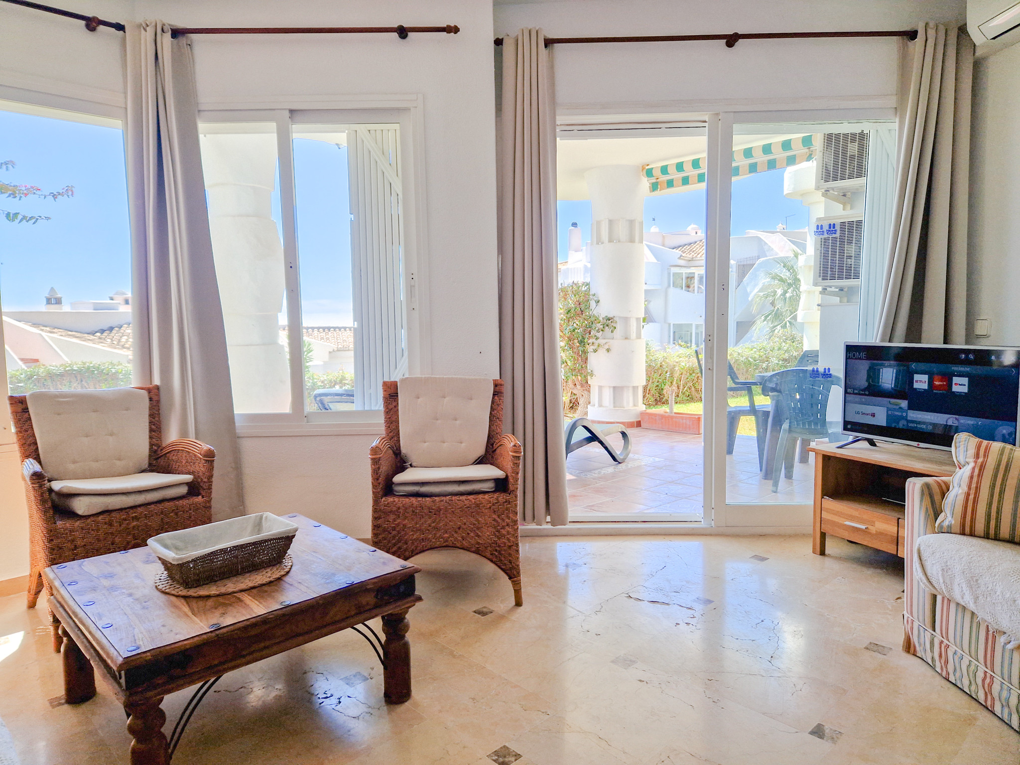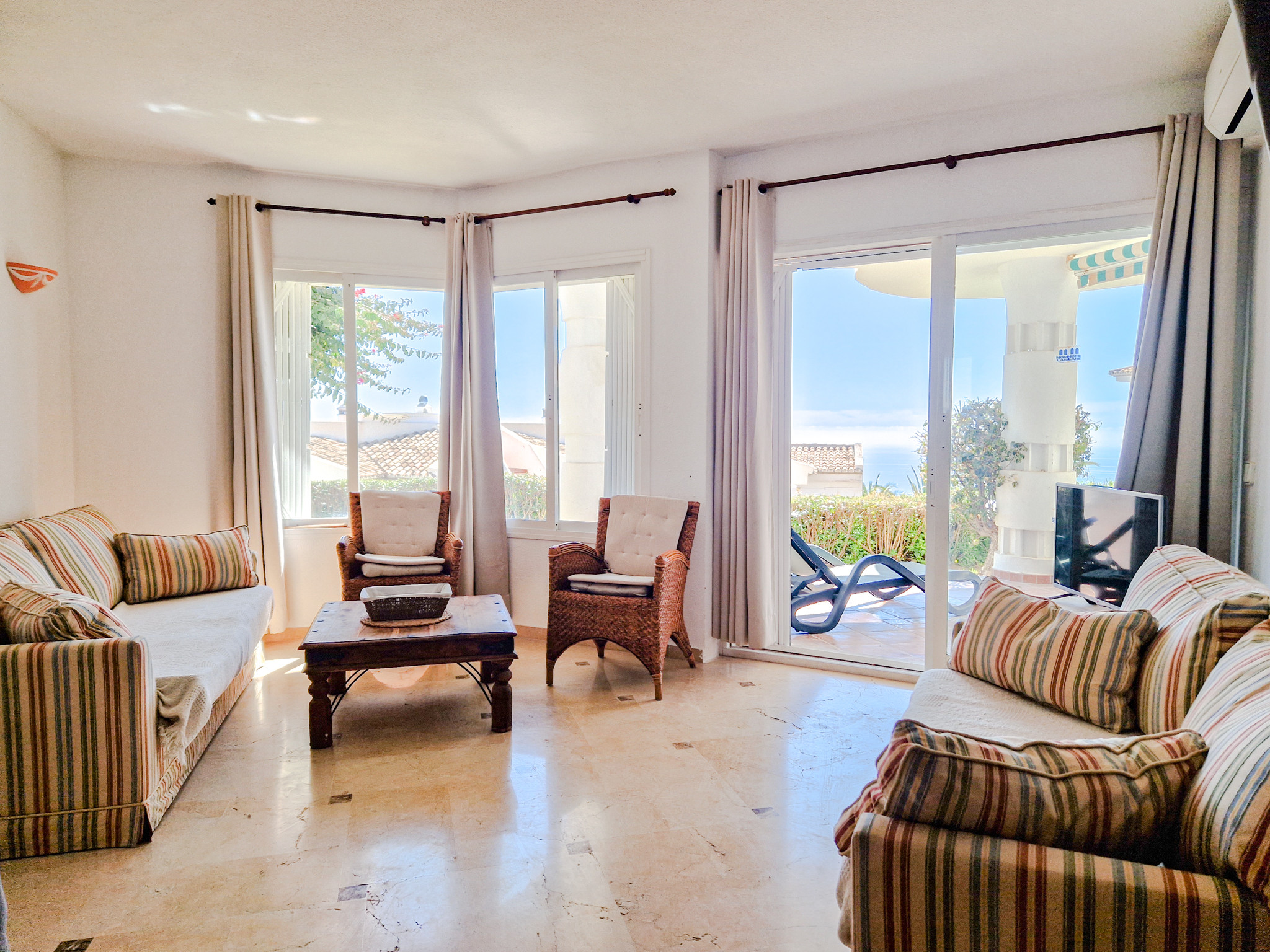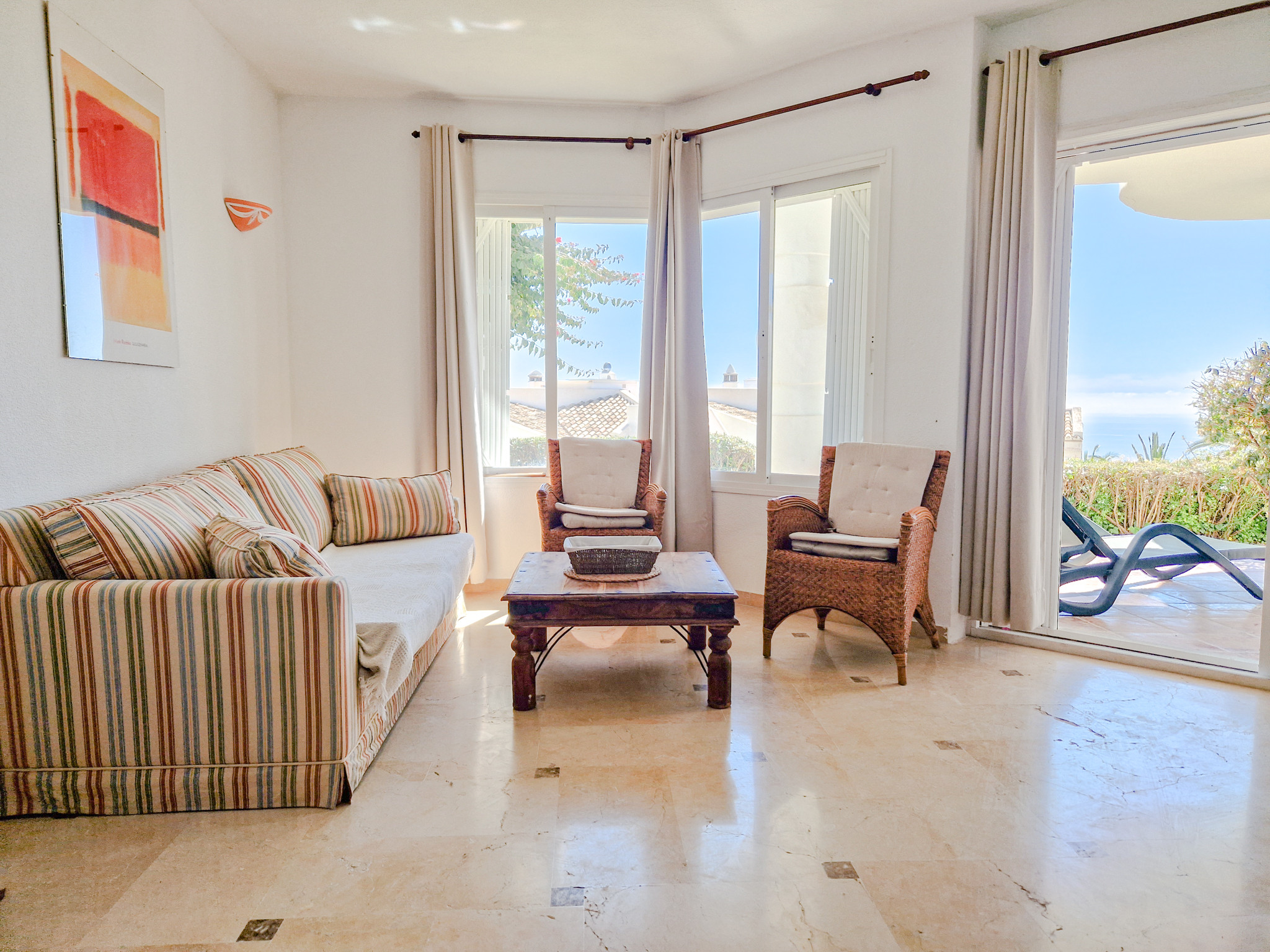 Hay una espaciosa sala de estar y comedor que discurre a lo largo de la izquierda del apartamento y que está amueblada con dos sofás, uno de los cuales es un sofá cama, un televisor y una mesa de centro. La zona de comedor cuenta con una mesa de comedor, cuatro sillas y un gran armario de exhibición. La sala de estar se abre a una terraza cubierta que ofrece vistas espectaculares al mar y a la piscina.