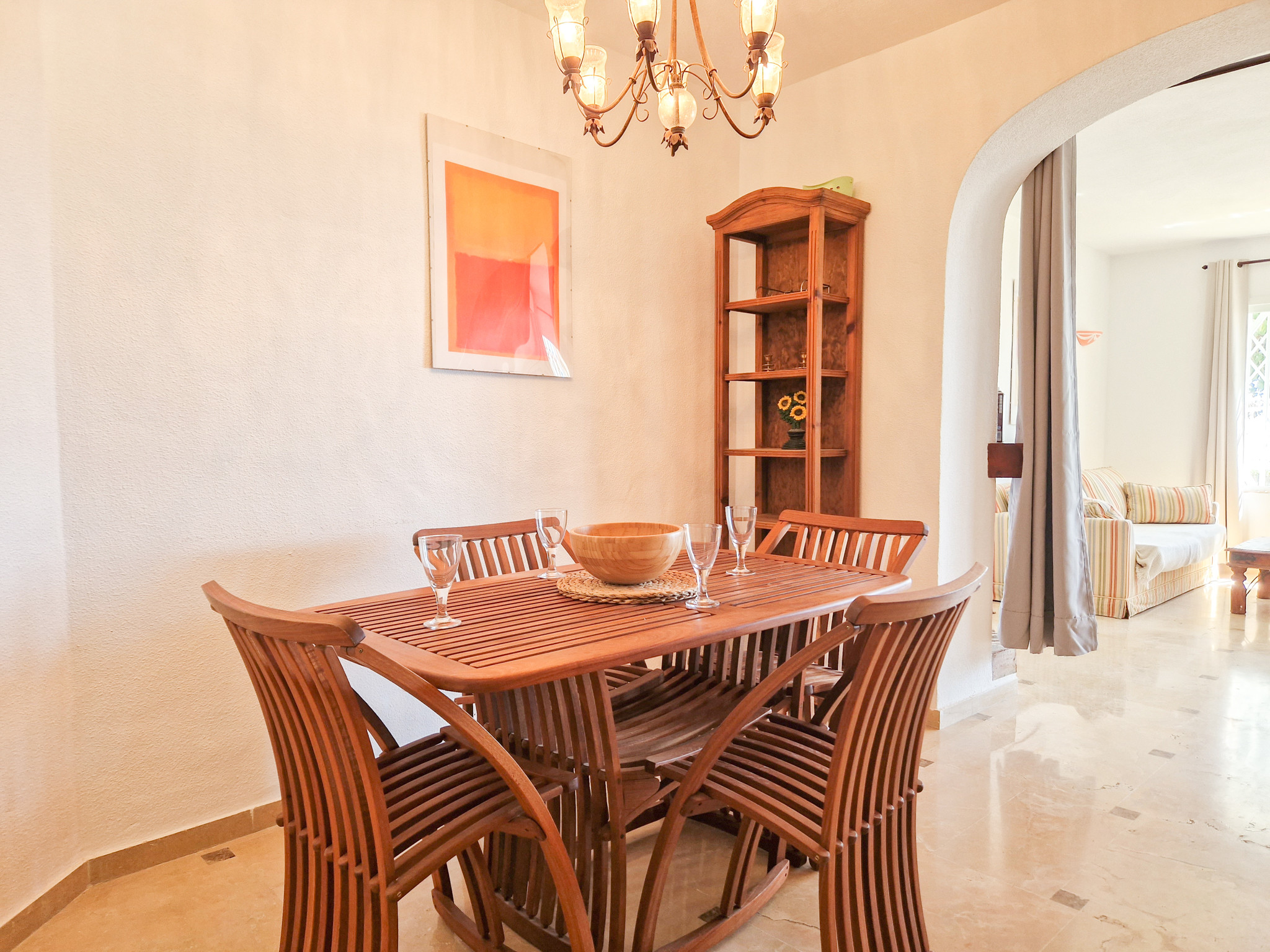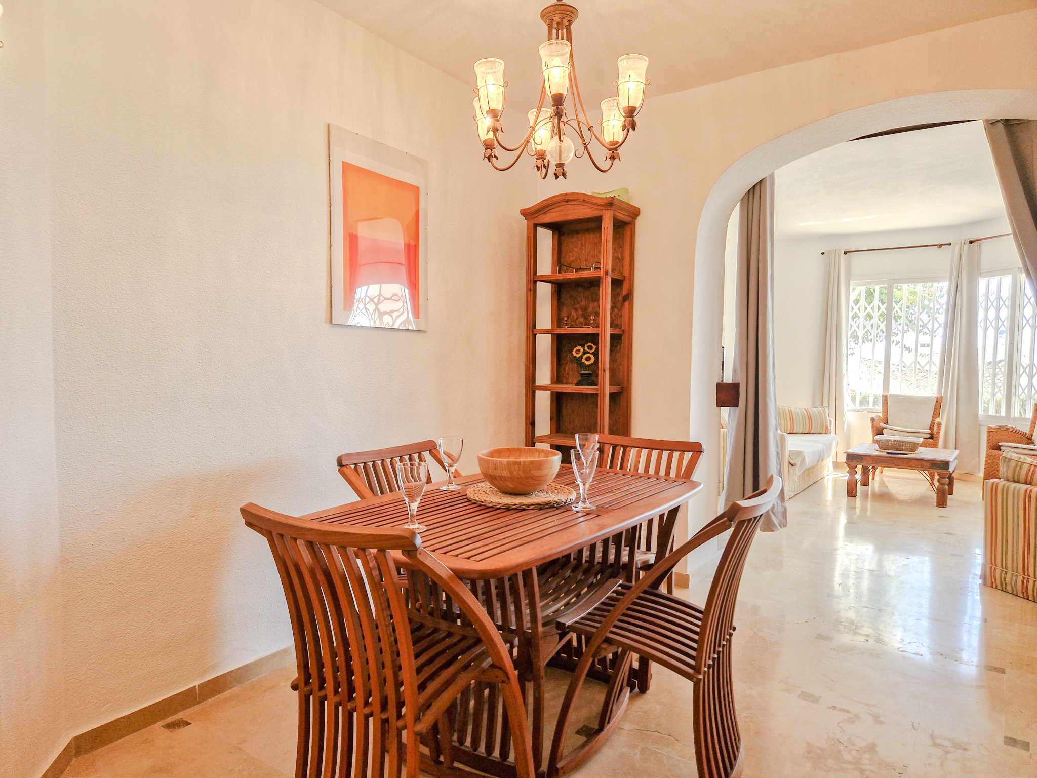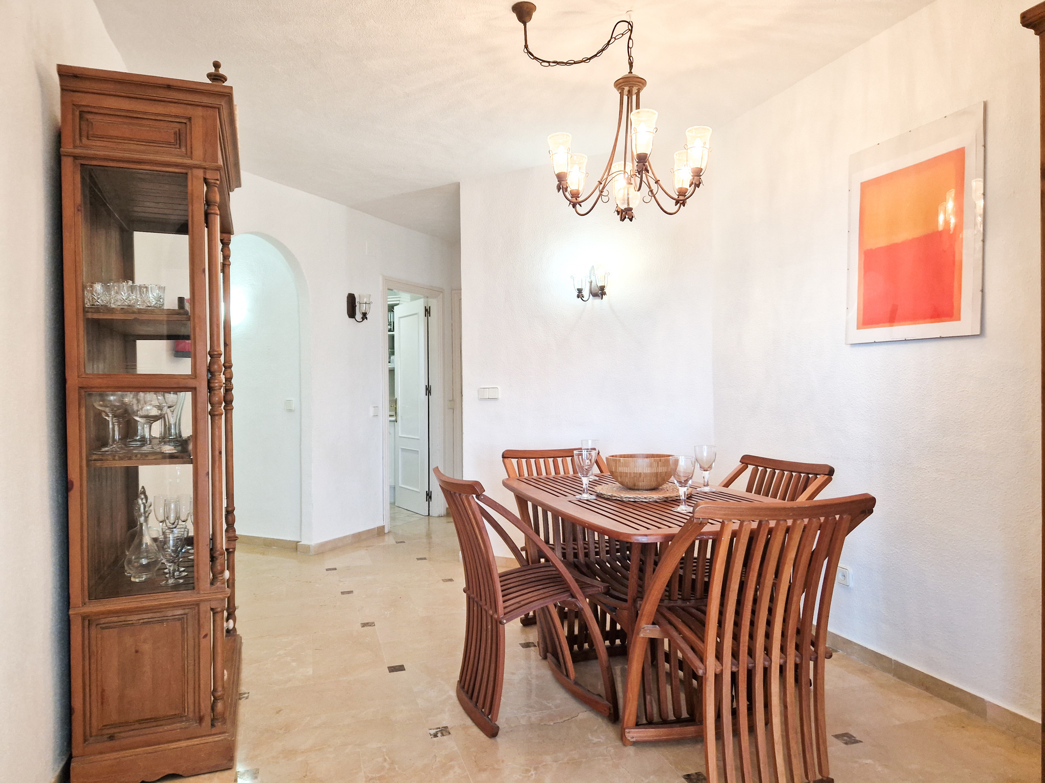 Hay una espaciosa sala de estar y comedor que discurre a lo largo de la izquierda del apartamento y que está amueblada con dos sofás, uno de los cuales es un sofá cama, un televisor y una mesa de centro. La zona de comedor cuenta con una mesa de comedor, cuatro sillas y un gran armario de exhibición. La sala de estar se abre a una terraza cubierta que ofrece vistas espectaculares al mar y a la piscina.