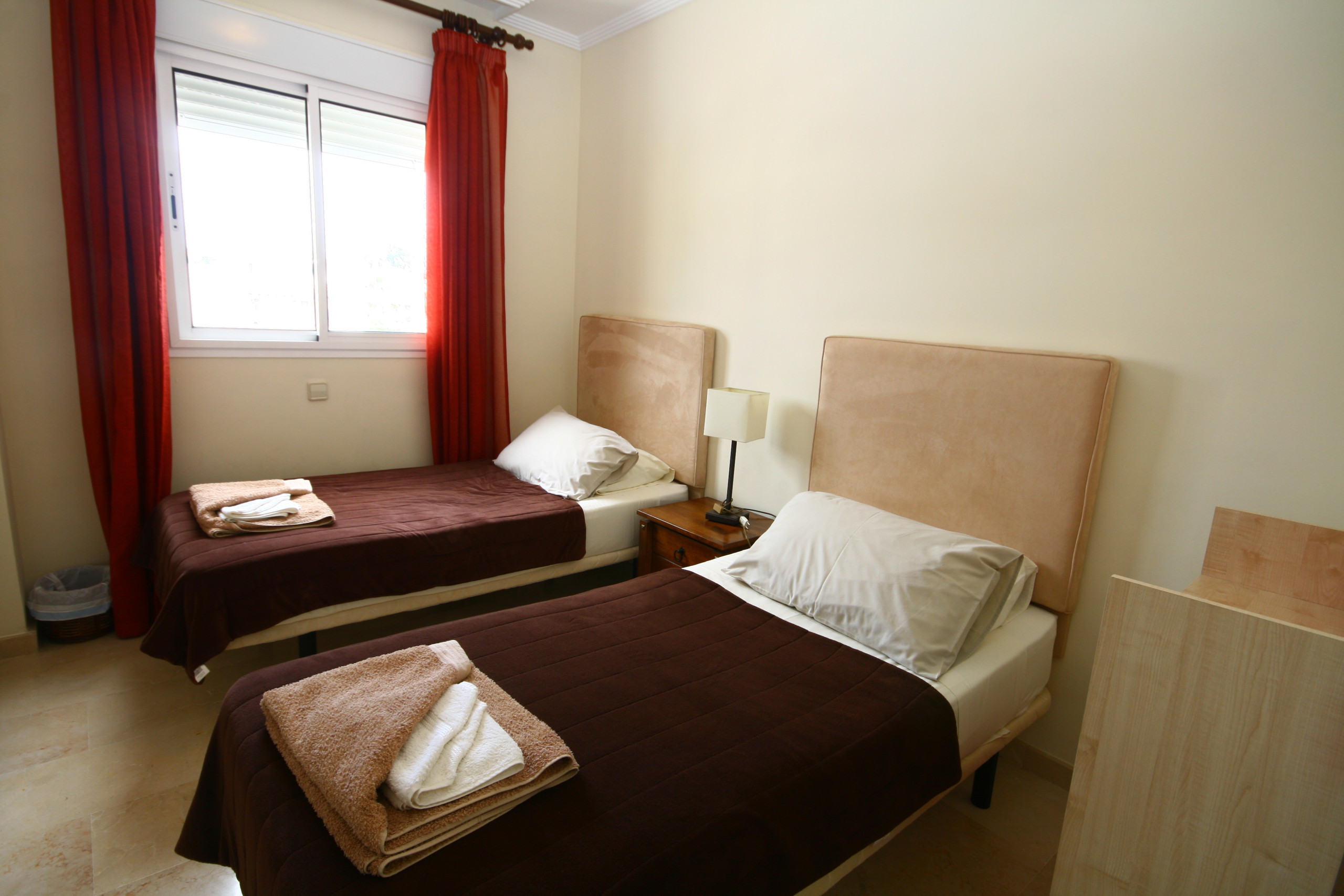 El dormitorio principal está equipado con una cama de matrimonio y cuenta con un gran armario empotrado con puertas correderas. El dormitorio de invitados está equipado con 2 camas individuales y también dispone de un armario empotrado con puertas correderas. Ambos dormitorios están equipados con aire acondicionado frío y caliente y utilizan el elegante y moderno cuarto de baño con una gran ducha de paseo.