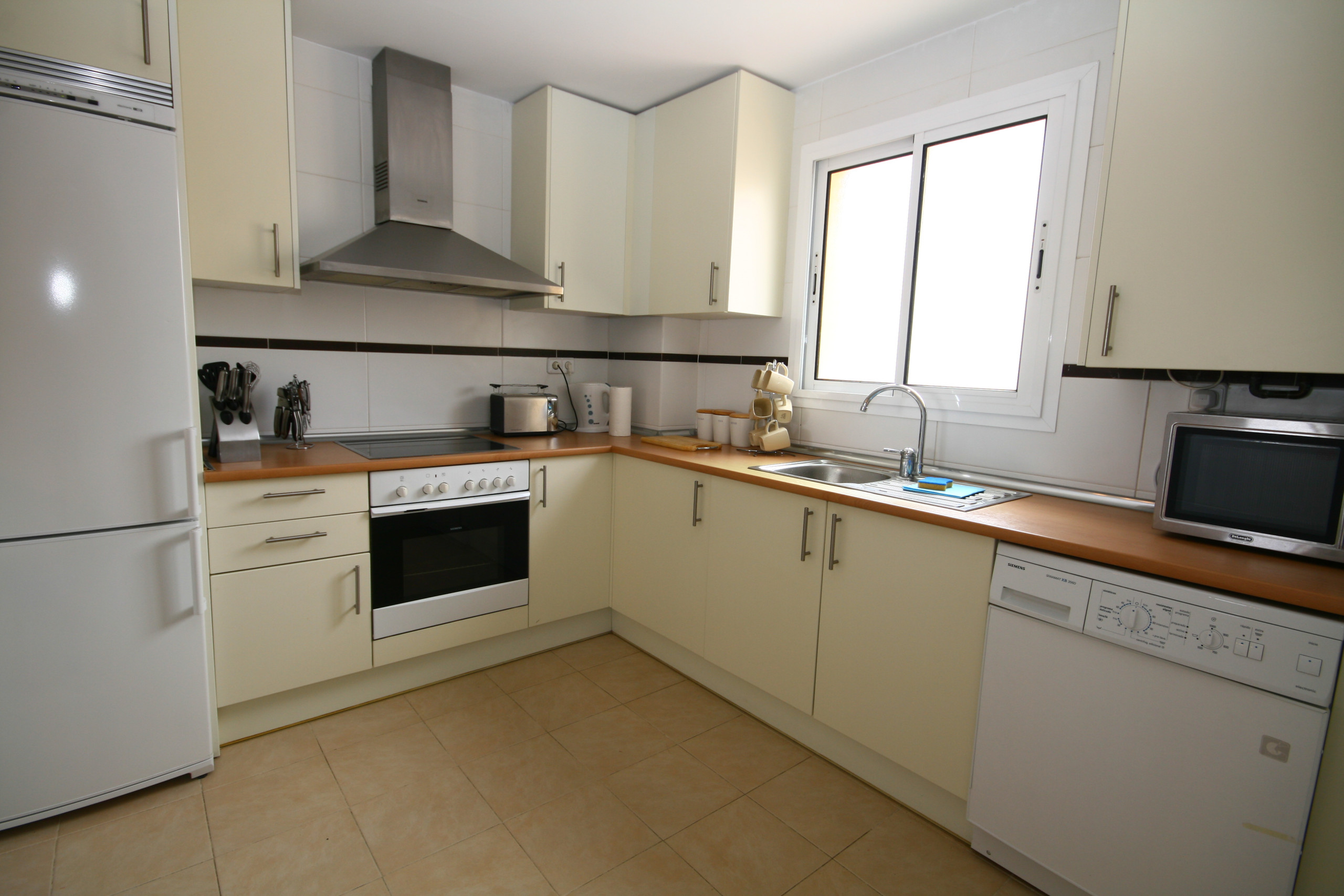 El apartamento ofrece WIFI gratuito y aire acondicionado frío y caliente. Este apartamento de 2 dormitorios está ubicado en la primera planta y está distribuido en un solo nivel, con fácil acceso por escaleras. Entras a la propiedad por un pasillo, con un cuarto de ducha a tu izquierda. A la derecha hay una cocina de estilo diner americano, totalmente equipada, incluyendo una máquina de café de cápsulas. El espacio de estar de planta abierta ofrece un área de asientos para comedor y un sofá cama en forma de L, que se despliega en una cama doble. Hay un televisor inteligente de 40 pulgadas con un Amazon Firestick. El salón da acceso a la terraza orientada al sur, que cuenta con un área de asientos para comedor y tumbonas, con hermosas vistas al mar. El dormitorio principal está equipado con una cama de matrimonio, armarios empotrados, un tocador y una silla, y tiene acceso directo a la terraza. El dormitorio de invitados ofrece 2 camas individuales, armarios empotrados y un tocador con silla. Hay un segundo baño compartido, que cuenta con una bañera con ducha.