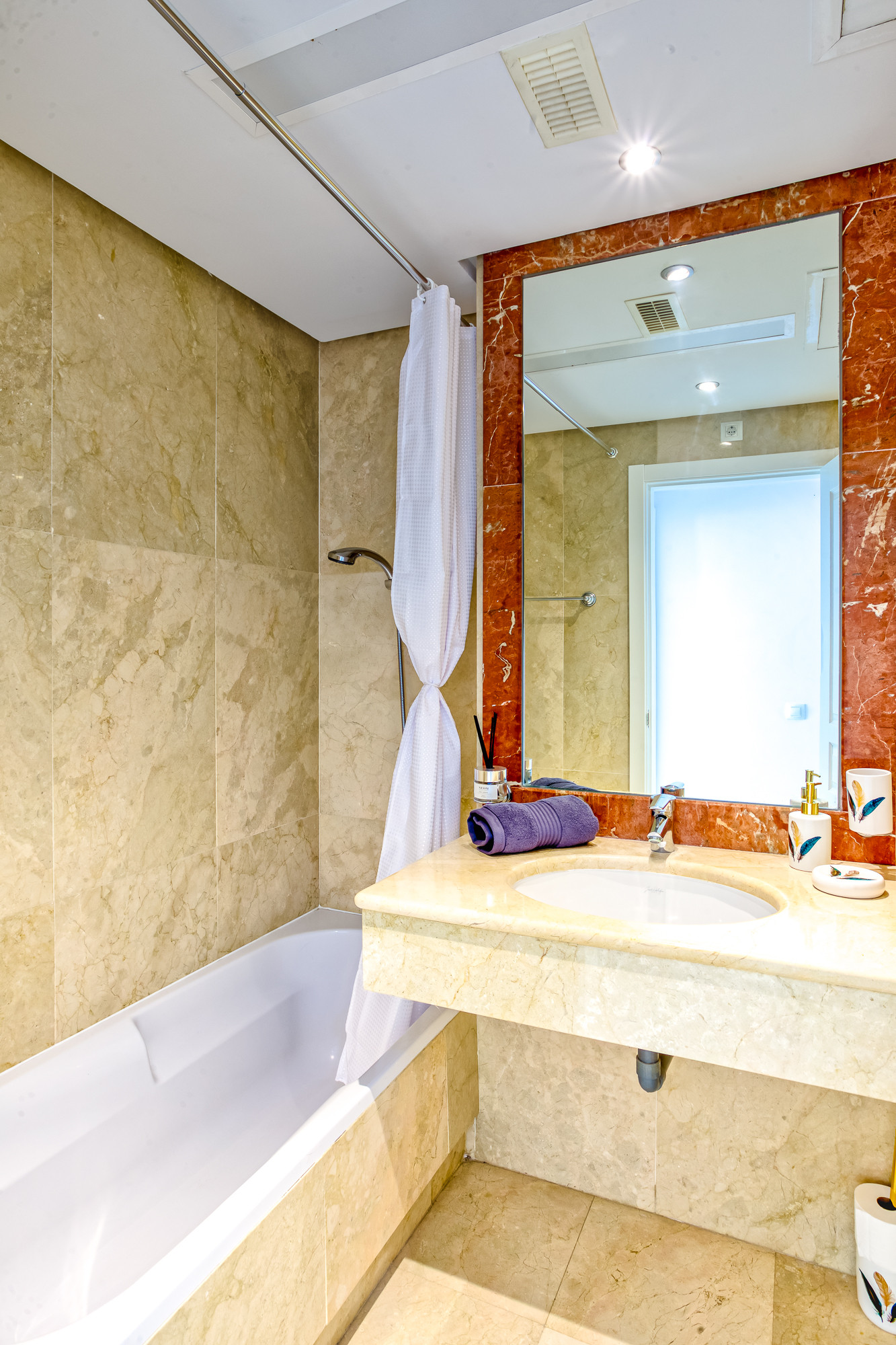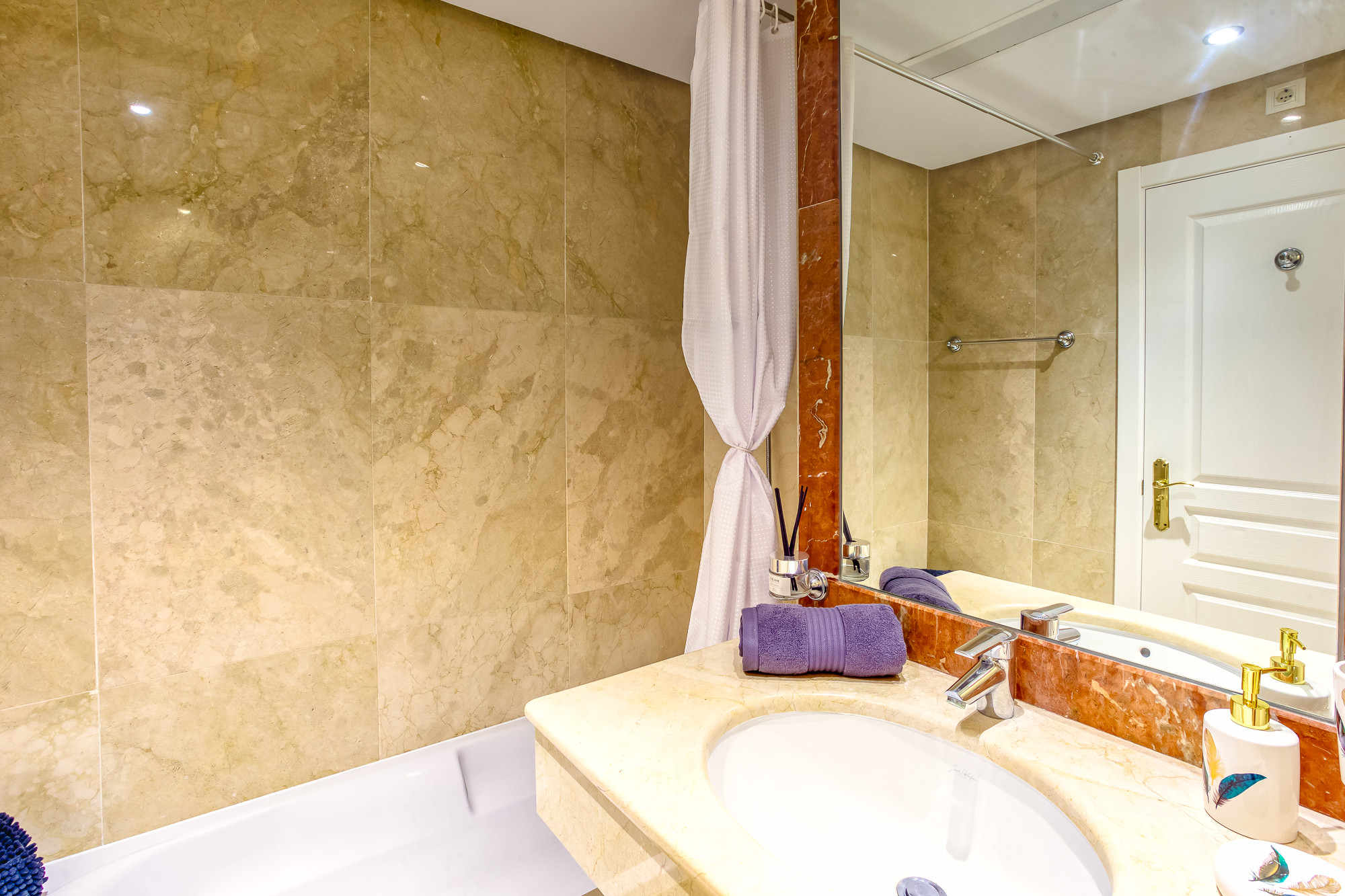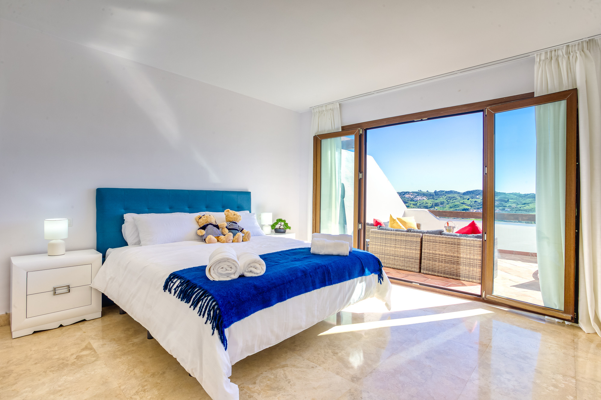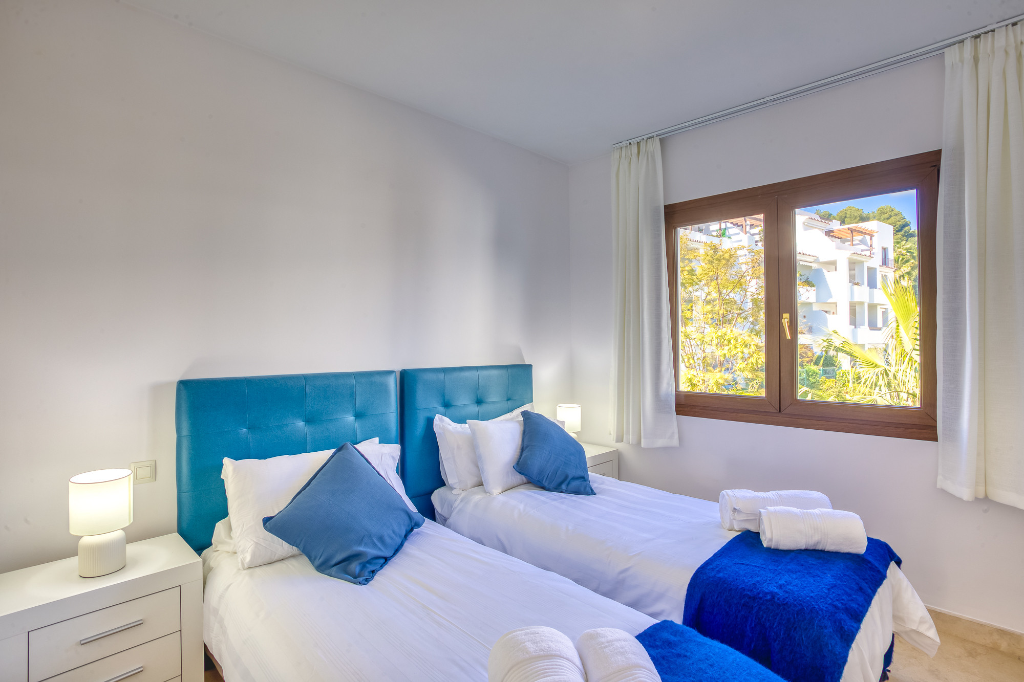El dormitorio principal está equipado con una cama de matrimonio y cuenta con un gran armario empotrado con puertas correderas. El dormitorio de invitados está equipado con 2 camas individuales y también dispone de un armario empotrado con puertas correderas. Ambos dormitorios están equipados con aire acondicionado frío y caliente y utilizan el elegante y moderno cuarto de baño con una gran ducha de paseo.