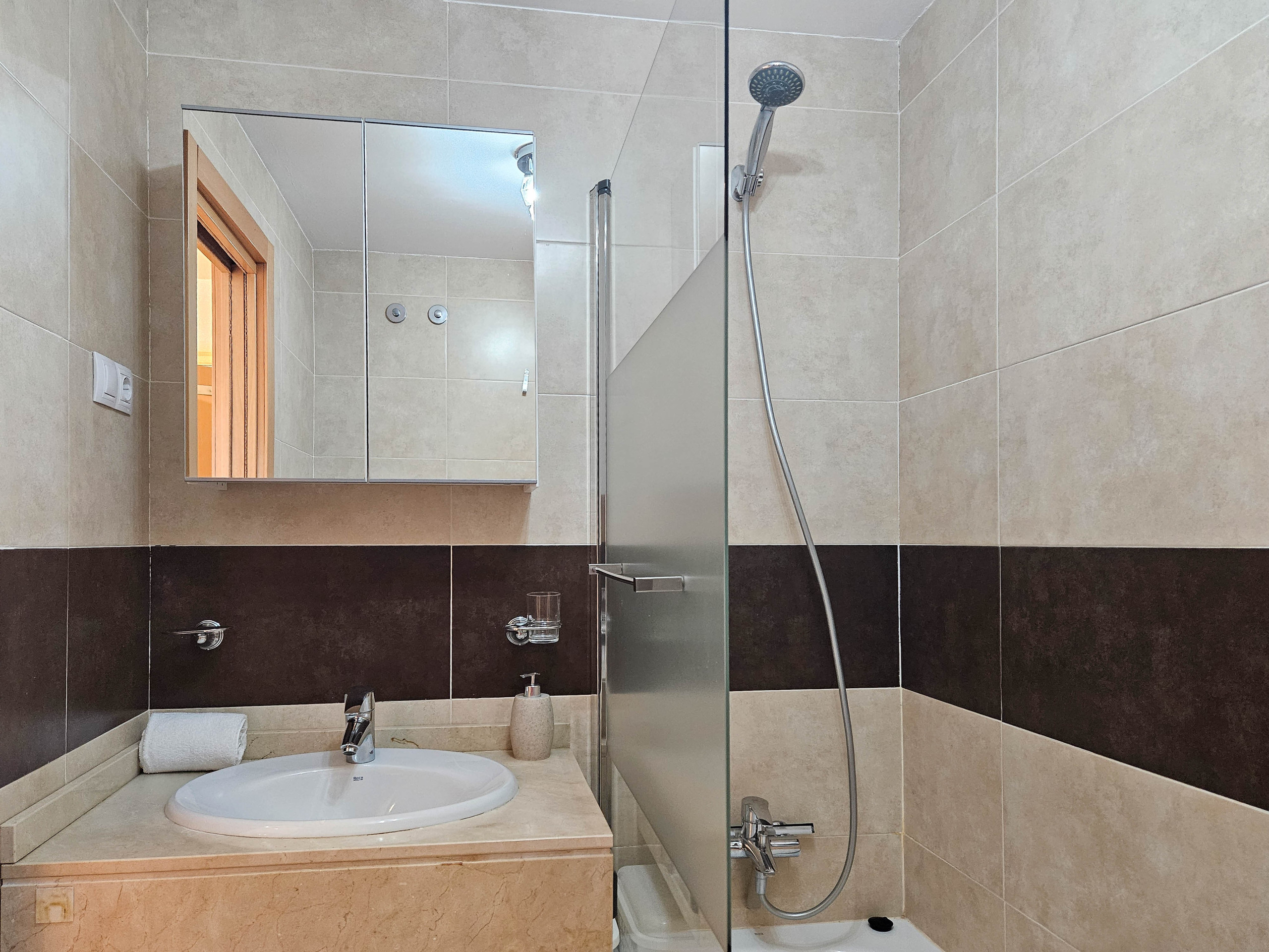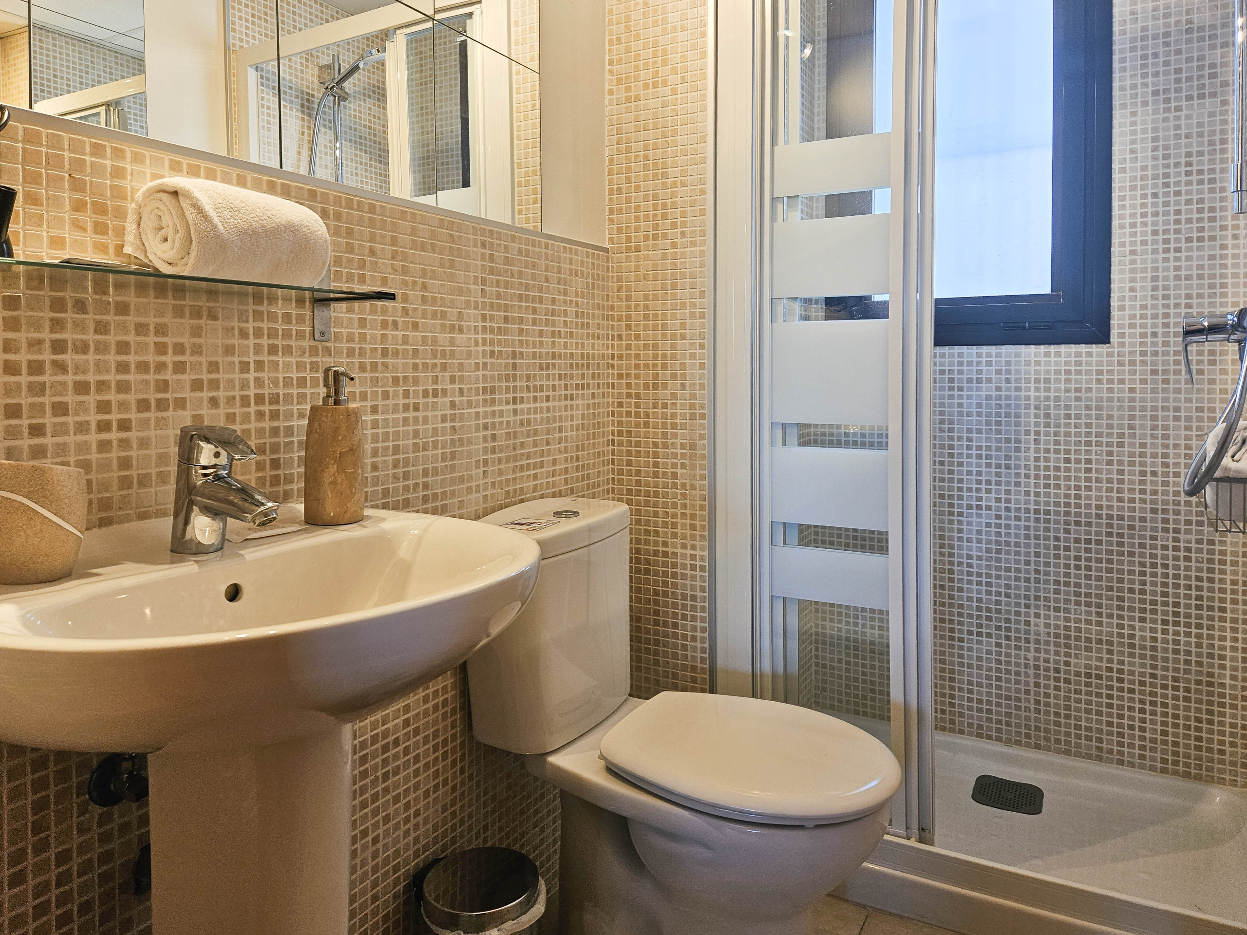 Ubicado en la tercera planta con acceso por ascensor, este espacioso apartamento está distribuido en un solo nivel. La propiedad cuenta con una cocina independiente y bien equipada, mientras que la zona de estar de planta abierta ofrece un espacio para comer y un sofá que se convierte en una cama doble, permitiendo que el apartamento pueda alojar cómodamente hasta cuatro huéspedes. El salón también incluye un televisor inteligente de 50" y una barra de sonido.