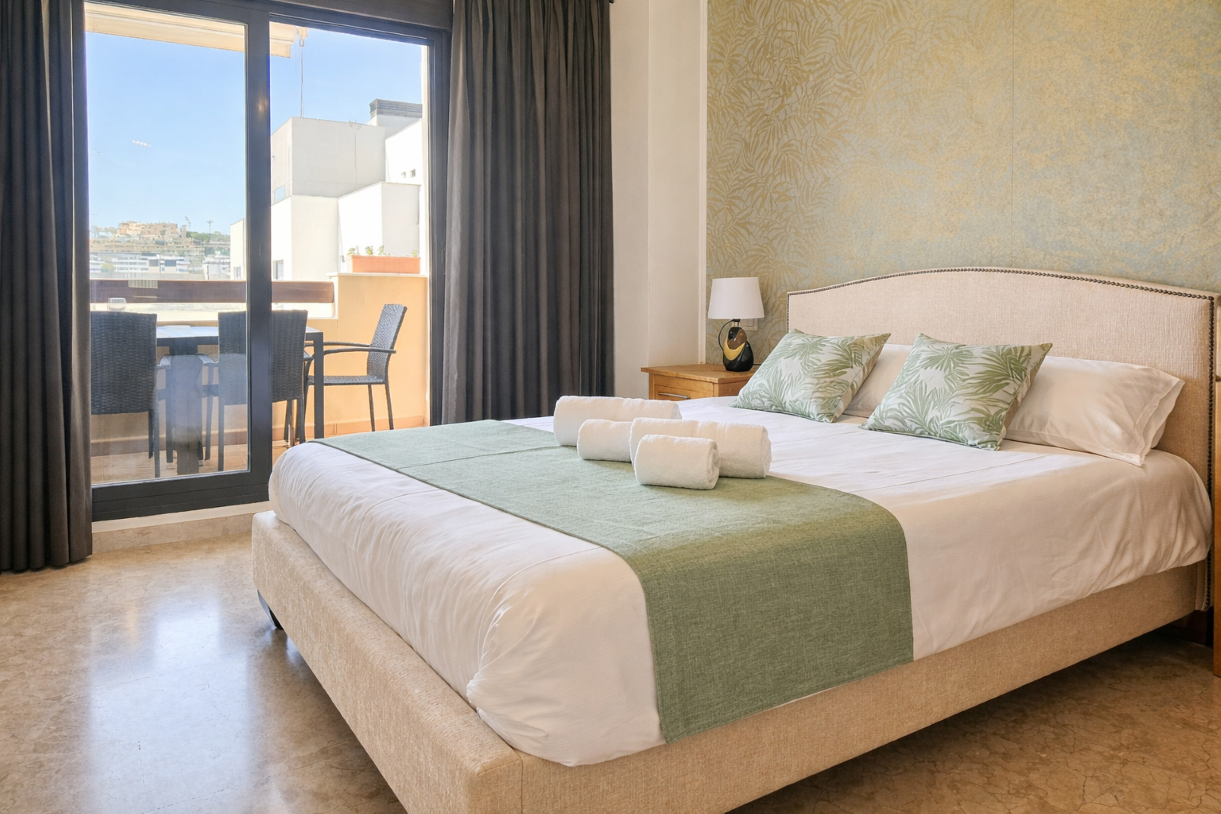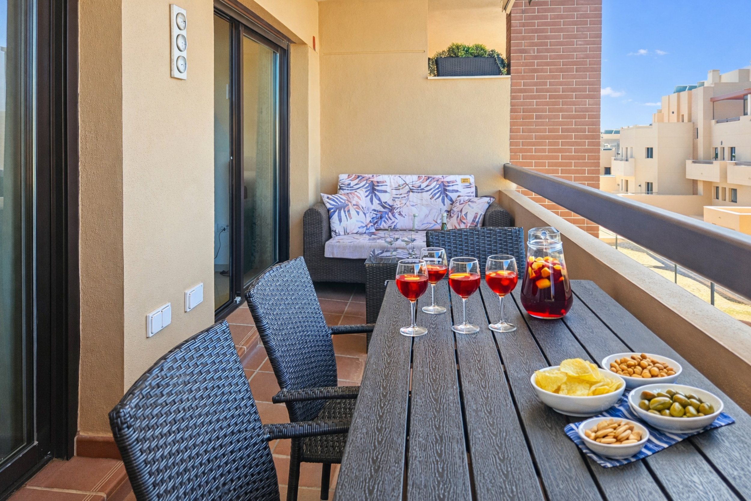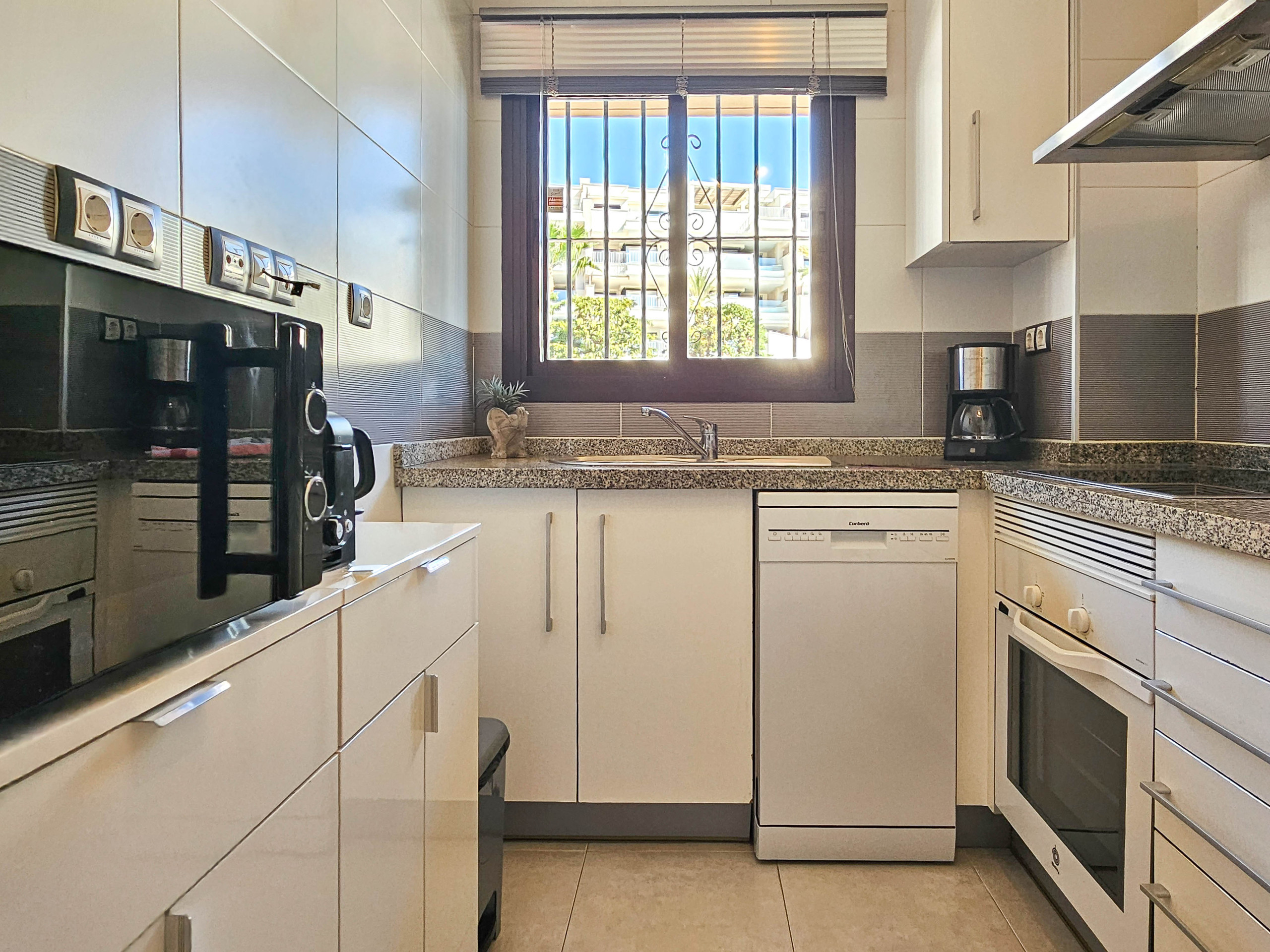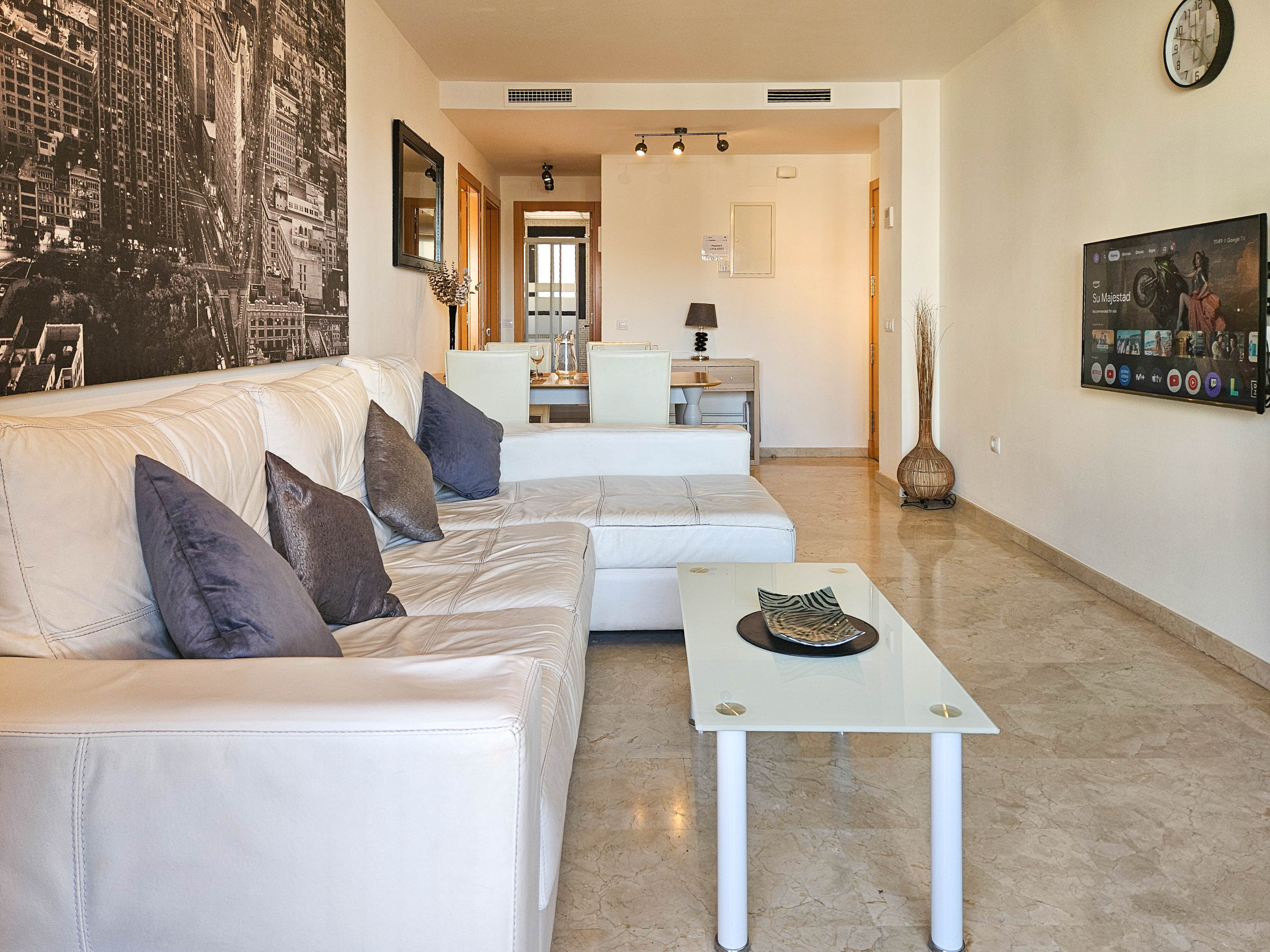 El apartamento está ubicado en la primera planta y está distribuido en un solo nivel. Se accede al apartamento mediante ascensor. El espacio de estar diáfano está amueblado con una mesa de comedor y sillas, y un área de estar con un gran sofá en forma de L y un TV de 42¨, con uso de Google TV. El área de estar conduce a la terraza donde se puede disfrutar de otra área de estar. La cocina separada está completamente equipada.
