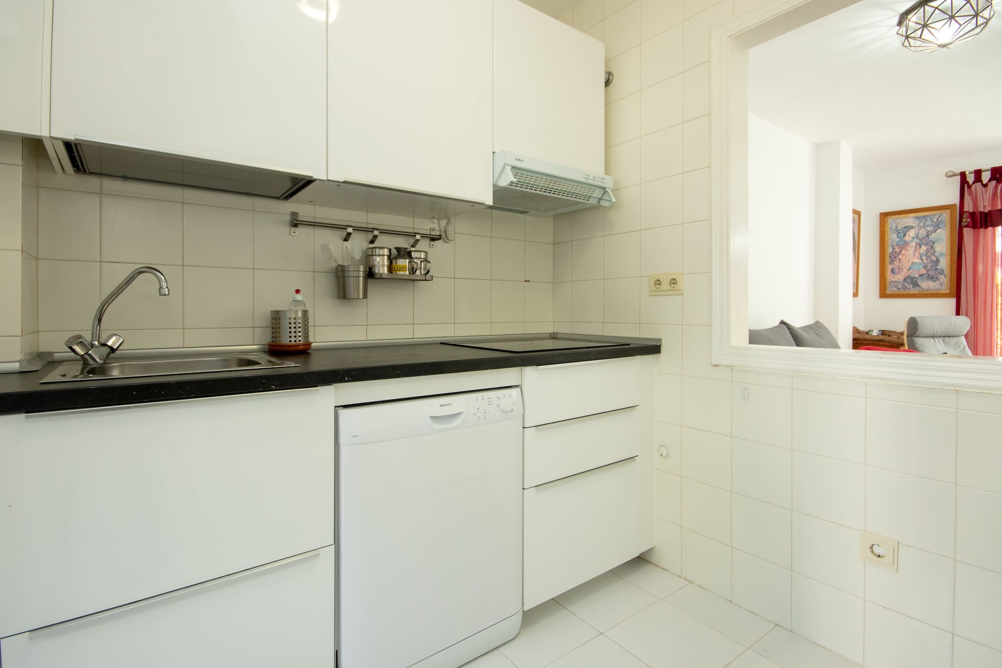 La cocina americana, de vitrocerámica, está equipada con nevera, microondas, horno, lavavajillas, vajilla/cubertería, utensilios/cocina, cafetera, tostadora, hervidor de agua y fogones.