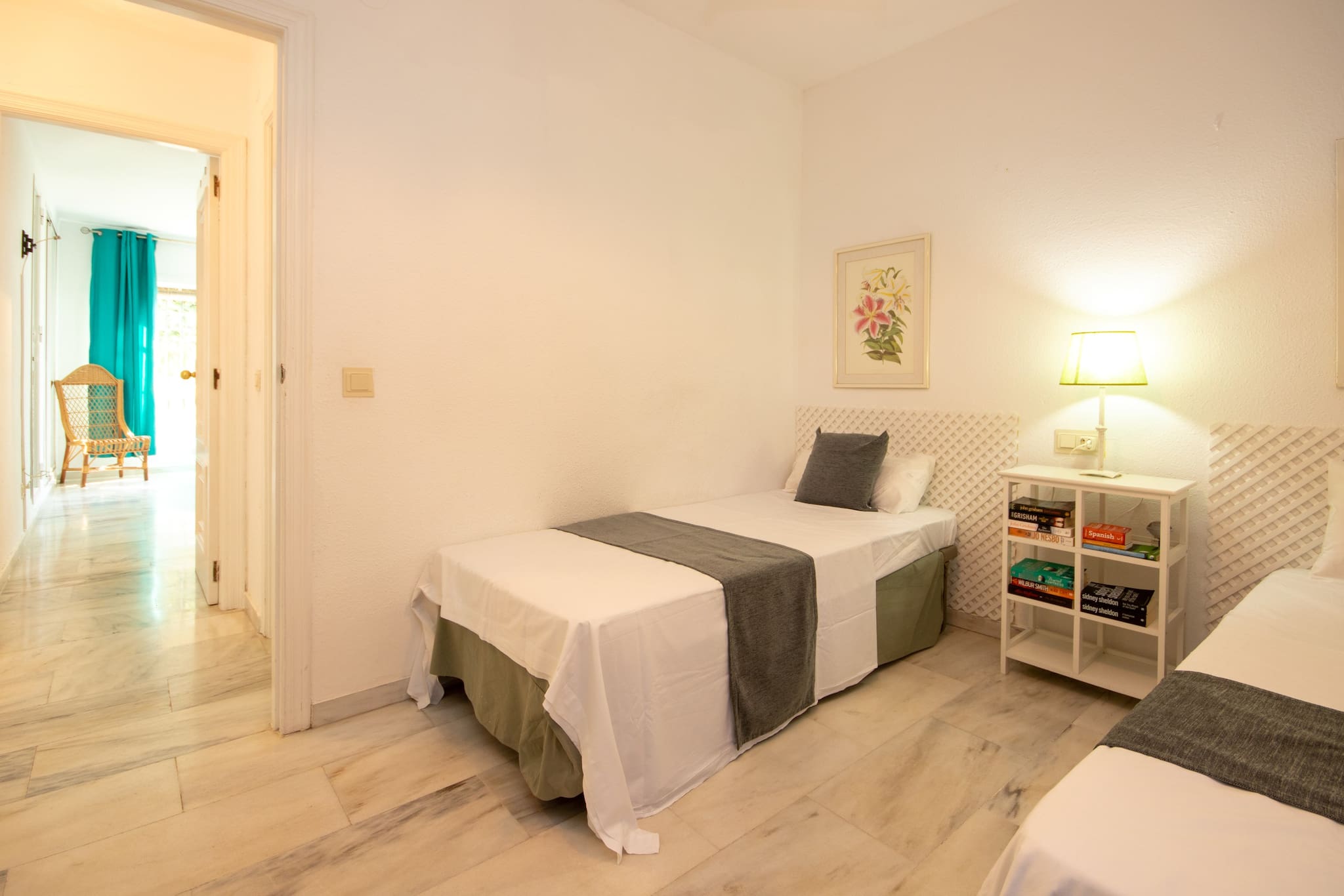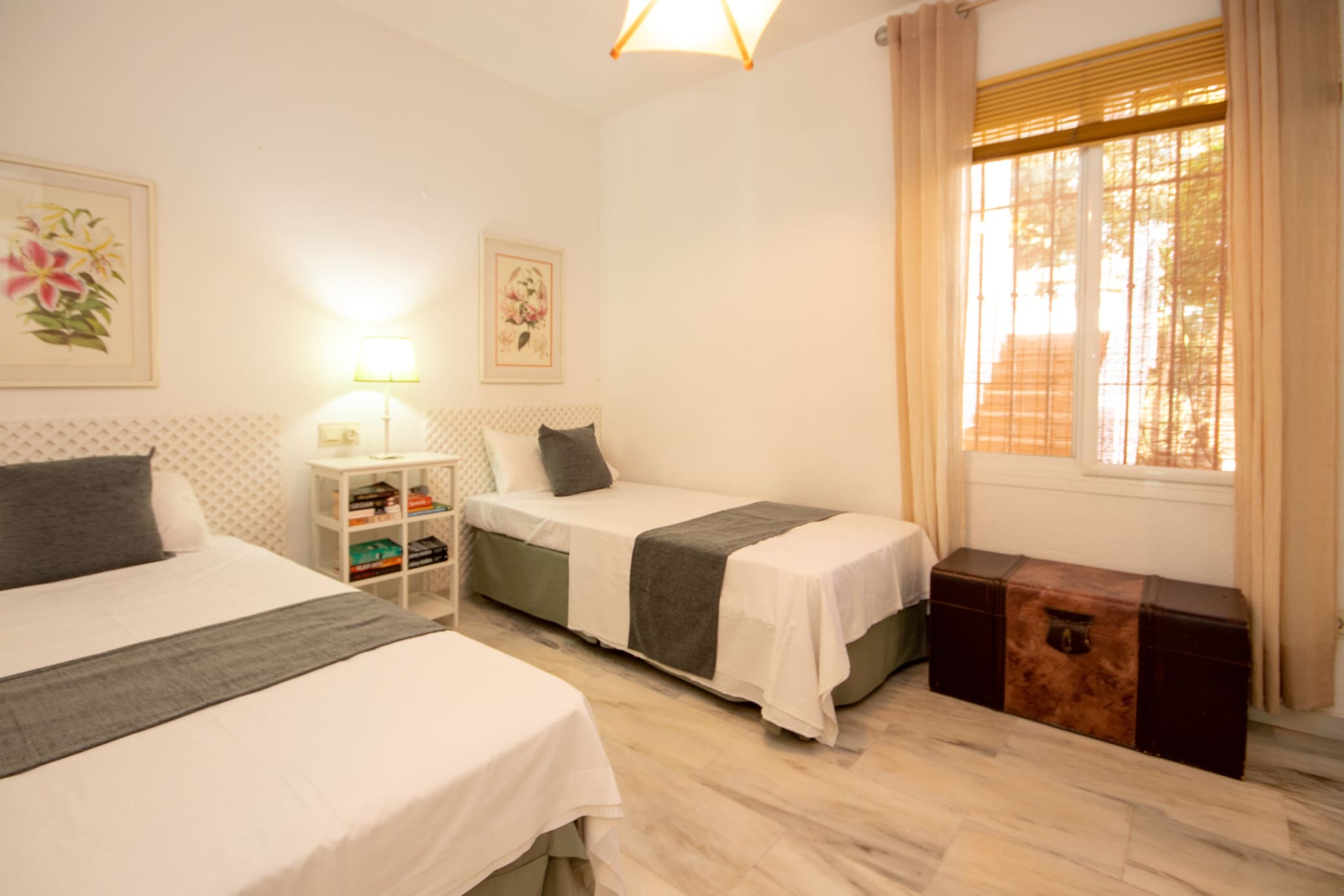 El dormitorio principal está amueblado con una cama de matrimonio y el dormitorio de invitados ofrece camas individuales. Ambos dormitorios tienen armarios empotrados y contraventanas. El apartamento cuenta con un cuarto de baño familiar, equipado con una bañera con ducha y también una lavadora.