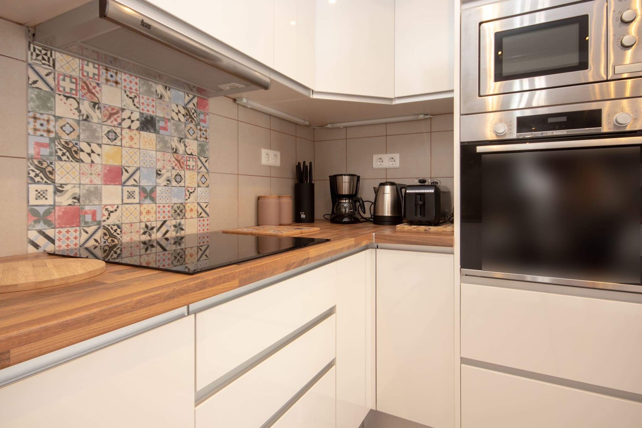 La cocina, está equipada con nevera, microondas, horno, vajilla/cubertería, cafetera y fogones.