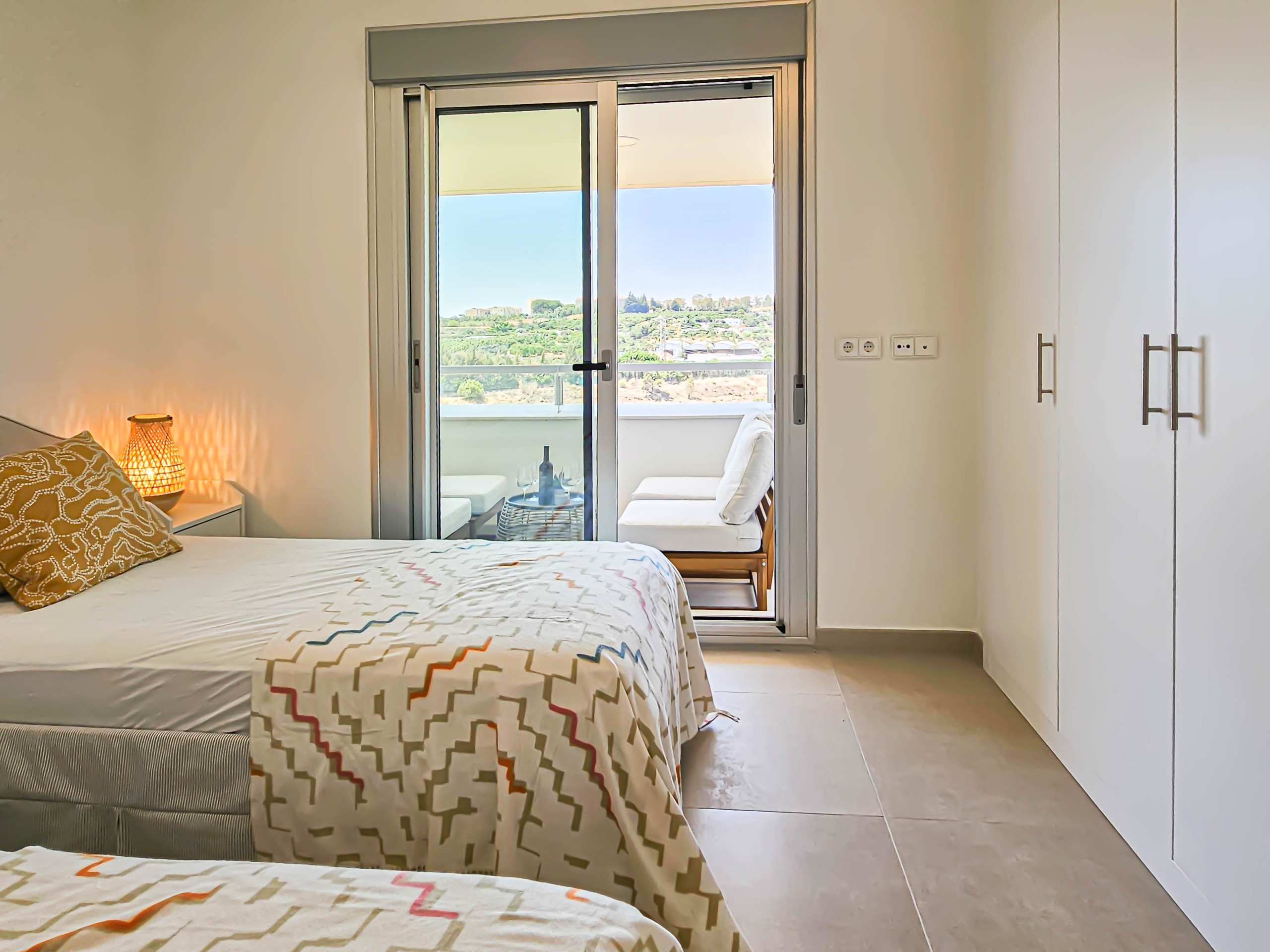 Baje por la escalera de madera donde encontrará dos dormitorios adicionales, incluido el dormitorio principal. El dormitorio principal está amueblado con una cama de matrimonio, un área de armarios empotrados y un cuarto de baño en suite. El cuarto de baño está equipado con una bañera, una cabina de ducha independiente y lavabos dobles. El dormitorio de invitados cuenta con camas gemelas, armarios empotrados y un televisor inteligente de 42 pulgadas. Este dormitorio disfruta de un cuarto de baño en suite con ducha. Ambos dormitorios tienen acceso a una terraza compartida espaciosa, que ofrece impresionantes vistas al campo de golf y al mar. La terraza está equipada con dos tumbonas y una zona de asientos de estar cómoda. Desde el pasillo de los dormitorios, baje las escaleras para encontrar el garaje privado.