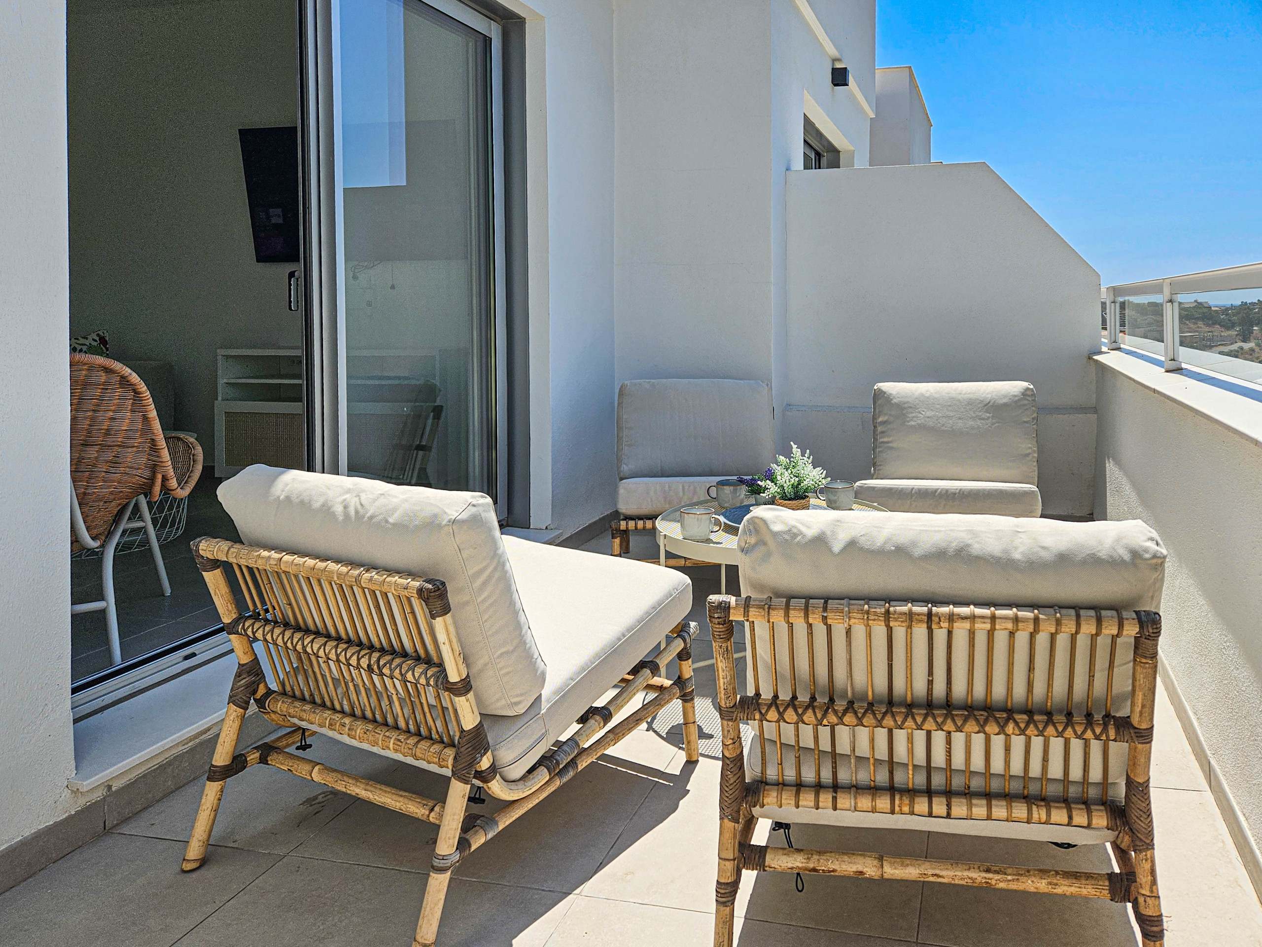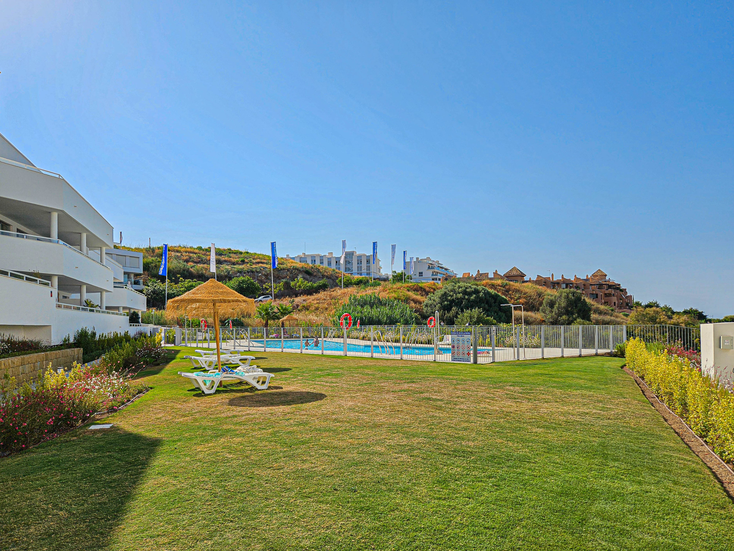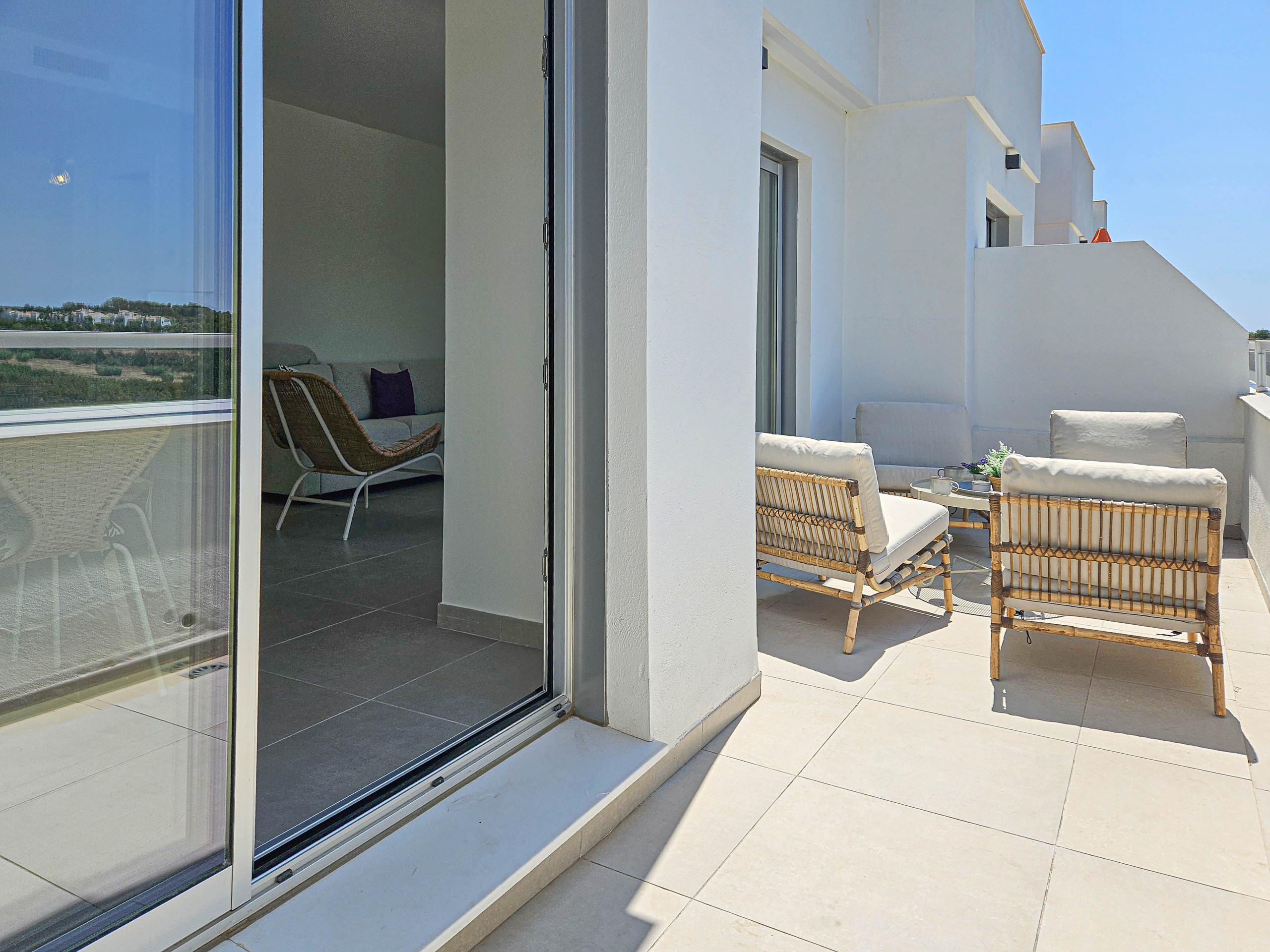 Justo al lado del recibidor se encuentra la escalera que le lleva a la espaciosa terraza en la azotea, donde podrá disfrutar de hermosas vistas panorámicas del mar, Gibraltar, la piscina y el complejo. La terraza en la azotea ofrece una zona de estar y una zona de comedor.