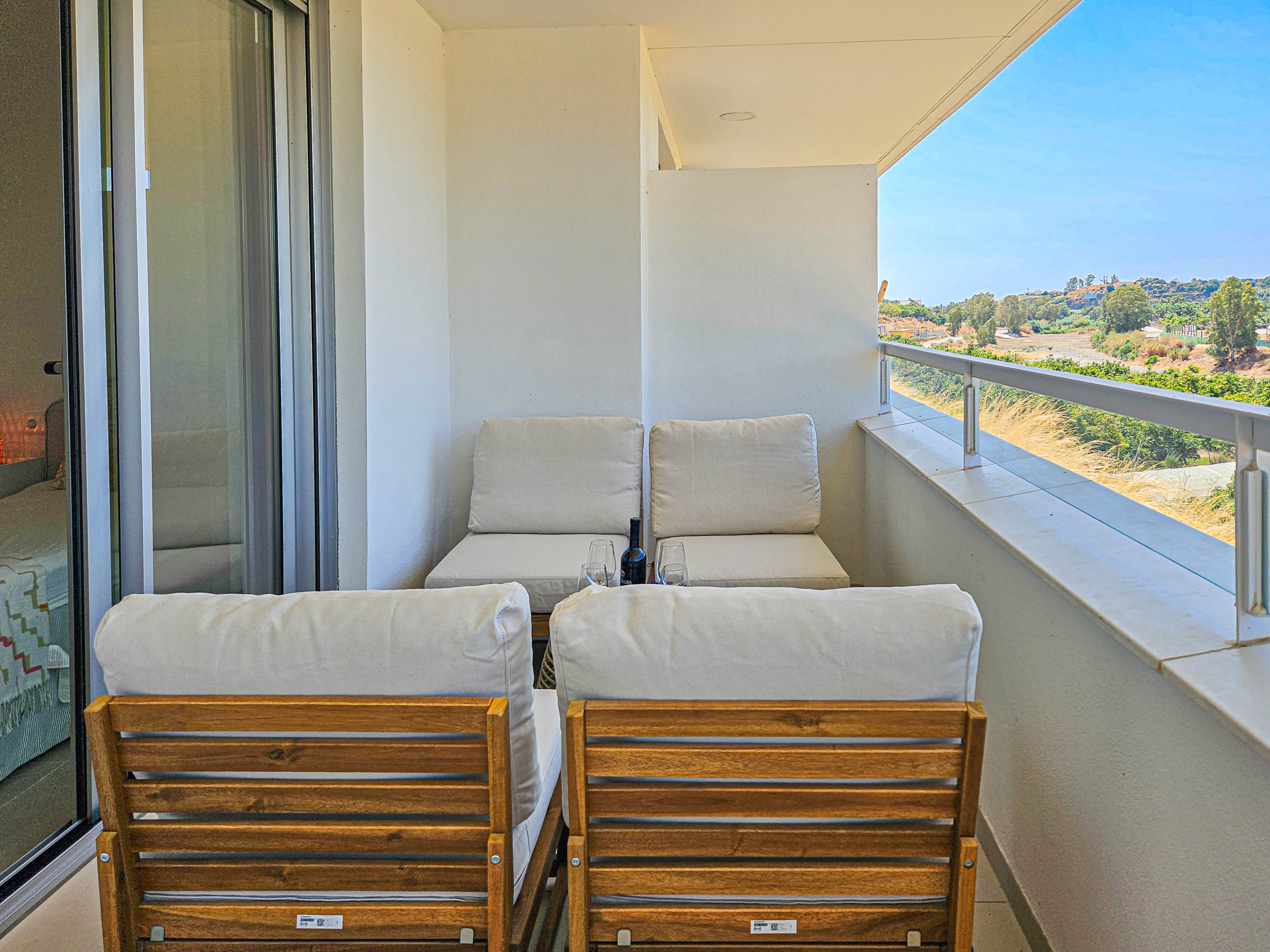 La casa adosada está distribuida en cuatro niveles con acceso mediante escaleras desde el garaje. (También acceso por rampa o escaleras desde la calle) Acceda a la casa en la zona de estar de planta abierta. La zona de estar está amueblada con un sofá, dos sillones y un televisor inteligente de 49 pulgadas. Hay una zona de comedor para acomodar a seis personas. La sala de estar conduce a la terraza orientada al sur, que ofrece maravillosas vistas sobre el campo de golf hasta el mar y Gibraltar. Desde la sala de estar se accede al dormitorio de invitados, que está amueblado con una cama king size y armarios empotrados. Este dormitorio tiene acceso a la terraza. El cuarto de ducha para invitados está ubicado junto al dormitorio de invitados. La cocina separada está bien equipada.