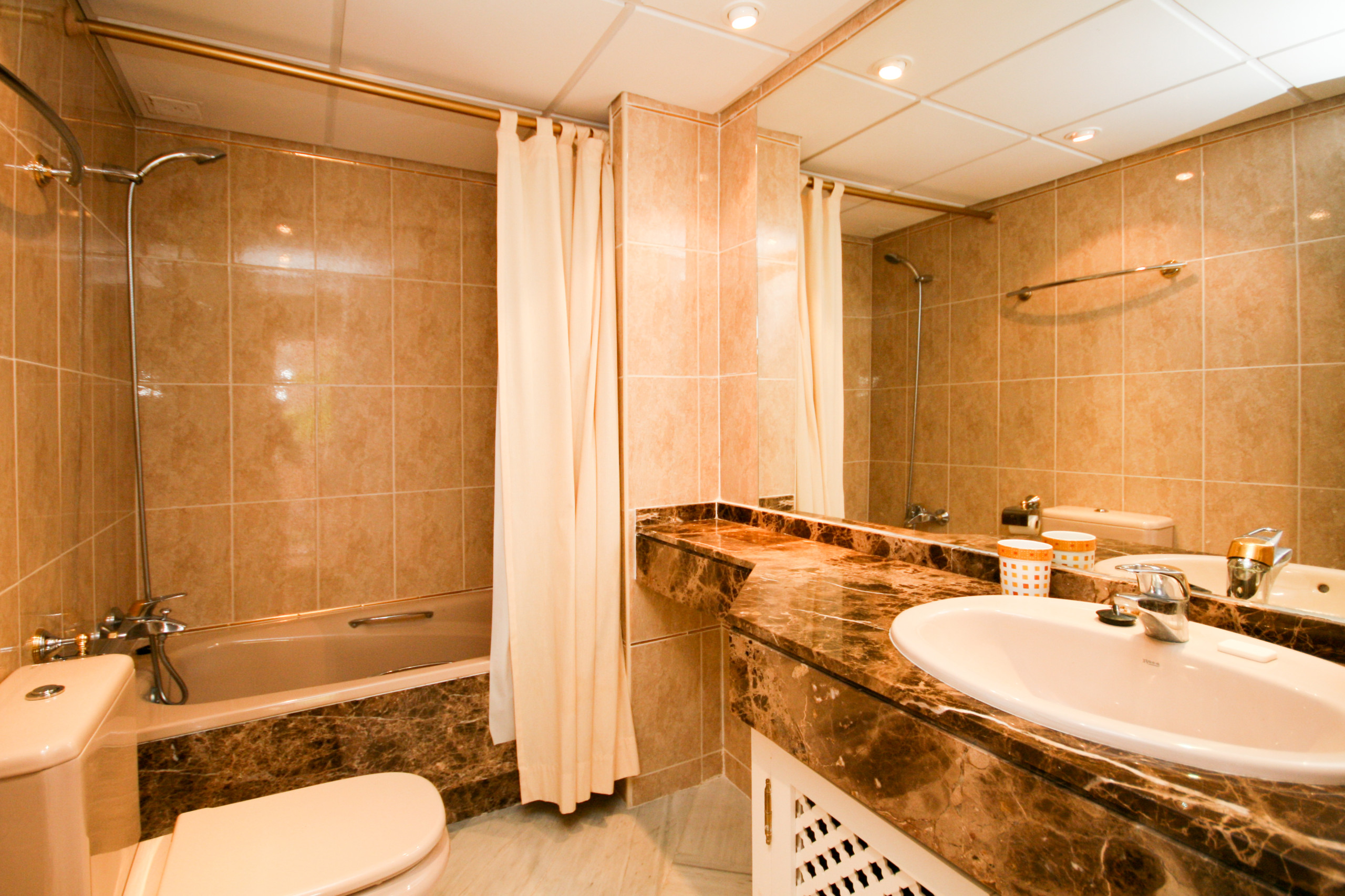 Baje por la escalera de madera donde encontrará dos dormitorios adicionales, incluido el dormitorio principal. El dormitorio principal está amueblado con una cama de matrimonio, un área de armarios empotrados y un cuarto de baño en suite. El cuarto de baño está equipado con una bañera, una cabina de ducha independiente y lavabos dobles. El dormitorio de invitados cuenta con camas gemelas, armarios empotrados y un televisor inteligente de 42 pulgadas. Este dormitorio disfruta de un cuarto de baño en suite con ducha. Ambos dormitorios tienen acceso a una terraza compartida espaciosa, que ofrece impresionantes vistas al campo de golf y al mar. La terraza está equipada con dos tumbonas y una zona de asientos de estar cómoda. Desde el pasillo de los dormitorios, baje las escaleras para encontrar el garaje privado.