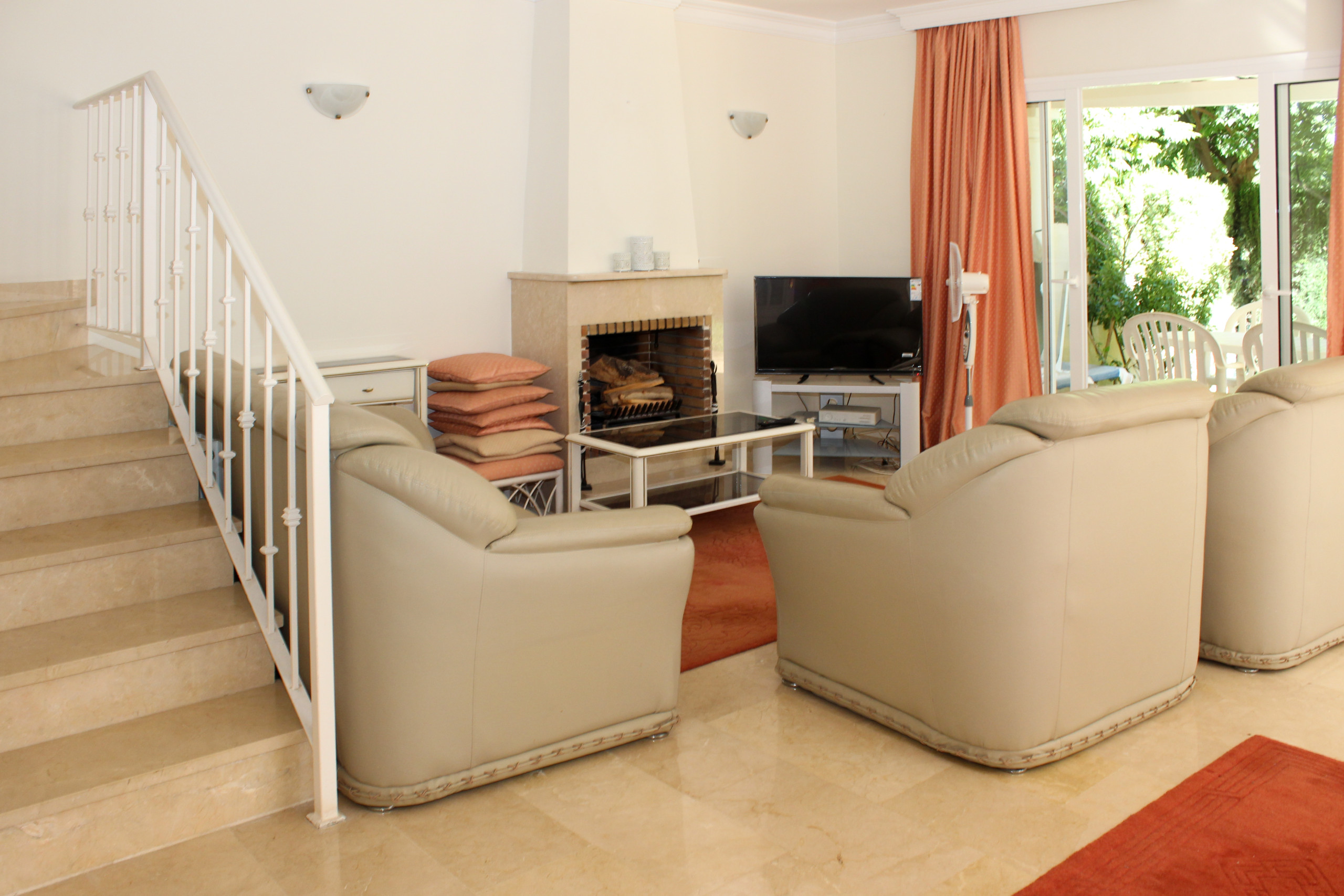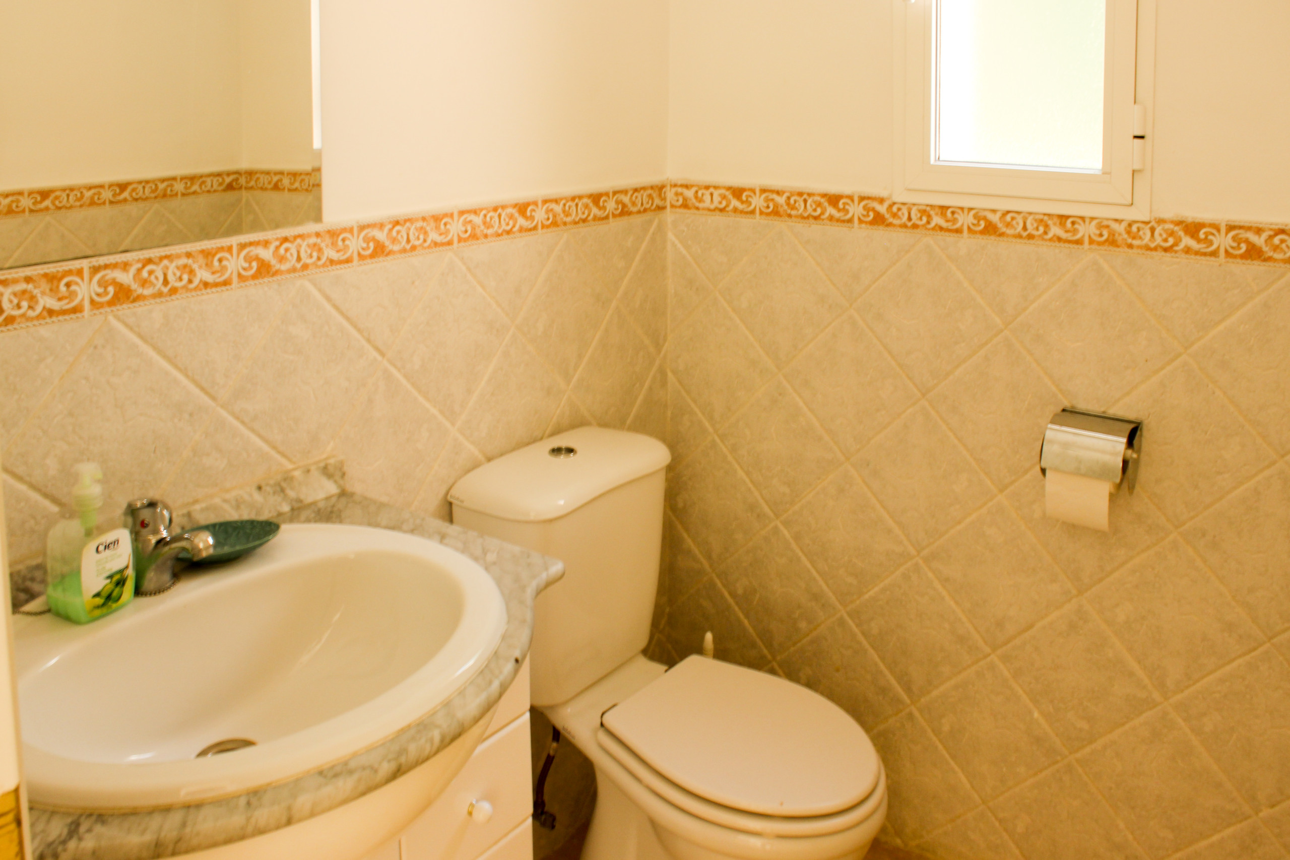 La casa está distribuida en dos plantas, con áreas de terraza en la parte delantera, trasera y junto al dormitorio principal. En la parte trasera de la casa se encuentra el cobertizo para el coche y una pequeña área de terraza con una mesa y sillas. El espacio de estar de planta abierta está amueblado con un área de comedor para seis personas, dos sofás y un TV de 40¨ con canales internacionales. La cocina independiente está completamente equipada y cuenta con una pequeña área de asientos para comer. También hay un aseo en este nivel. Desde el espacio de estar se accede a la terraza trasera, que está amueblada con un área de asientos de salón, un área de asientos para comer, dos tumbonas y una barbacoa de gas. La terraza se puede cubrir con un toldo cuando se necesita sombra en los días más calurosos. La piscina comunitaria está a solo unos pasos de la terraza trasera.