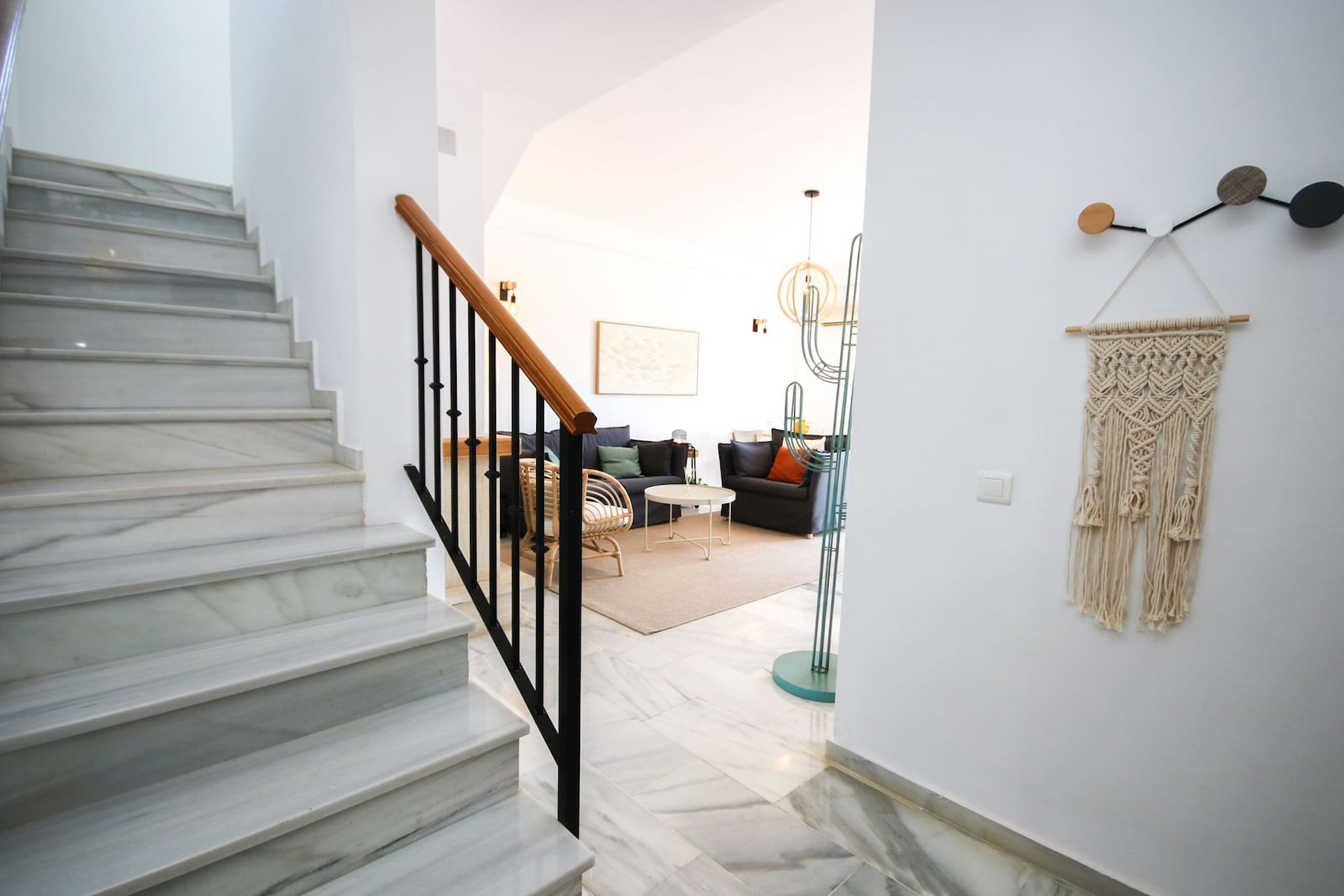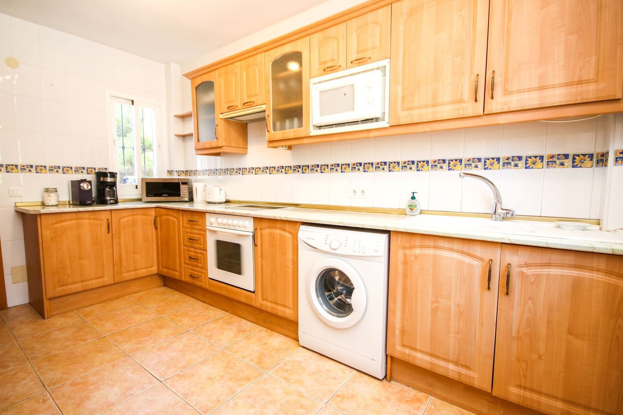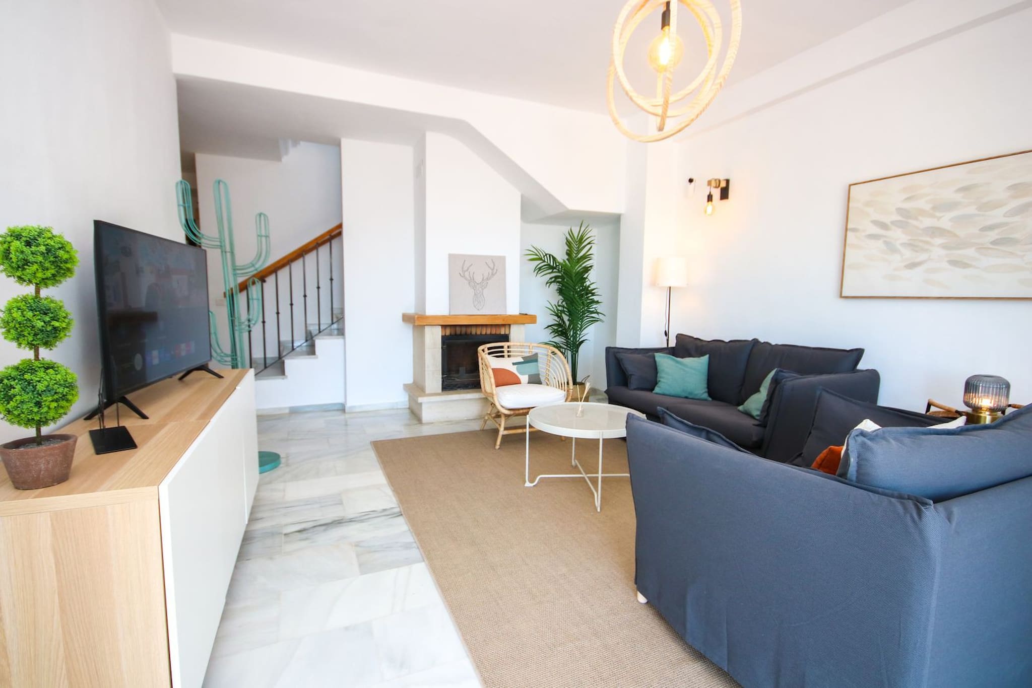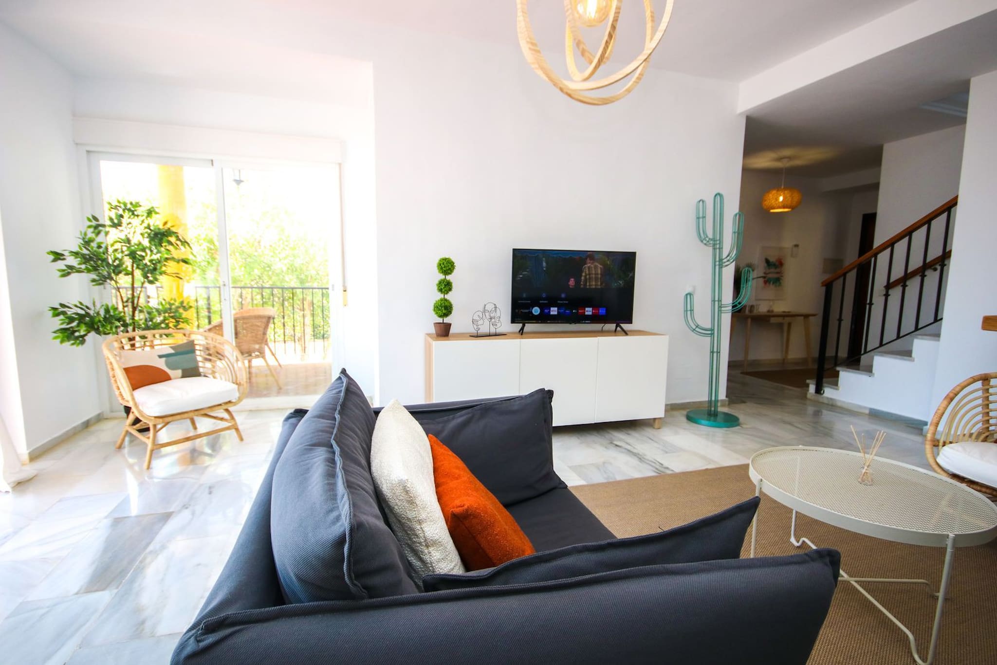 Esta casa amueblada con gusto está distribuida en dos niveles y cuenta con un amplio espacio de estar diáfano en la planta baja. La cocina está bien equipada, incluyendo una isla de cocina con barra de desayuno y taburetes. La zona de comedor puede acomodar hasta ocho personas y la zona de estar está amueblada con un sofá, una silla y un televisor inteligente de 55 pulgadas. Se accede a la terraza cubierta y al jardín desde la sala de estar para encontrar un área de comedor adicional, una barbacoa de gas y un césped de Astroturf. Desde aquí se pueden disfrutar de vistas al mar. Uno de los dormitorios de invitados está ubicado en la planta baja y está amueblado con una cama king size y armarios empotrados. También hay un aseo de invitados ubicado justo al lado de este dormitorio.