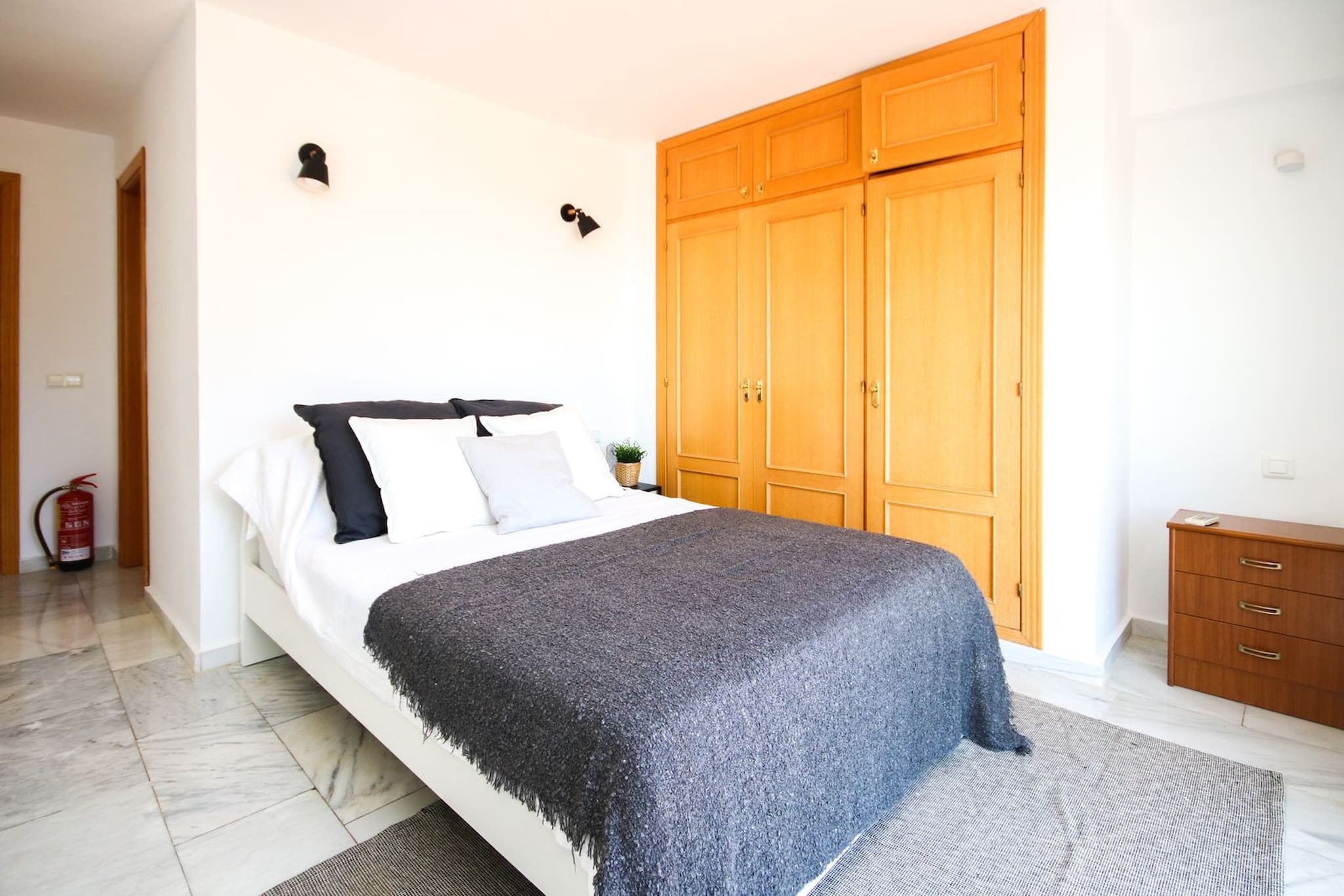 Sube las escaleras para acceder a las tres habitaciones adicionales. La habitación principal está amueblada con una cama superkingsize, armarios empotrados y un cuarto de baño en suite. El cuarto de baño está equipado con una ducha de paseo, con grifería de lluvia y grifería inferior, además de dobles lavabos. La habitación principal también cuenta con una terraza privada. Disfruta de las vistas al mar mientras te relajas en los tumbonas o en la silla colgante. Una de las habitaciones de invitados en este piso está amueblada con una cama king size, mientras que la otra habitación ofrece camas gemelas. Ambas habitaciones tienen armarios empotrados y acceso a un cuarto de baño de invitados.