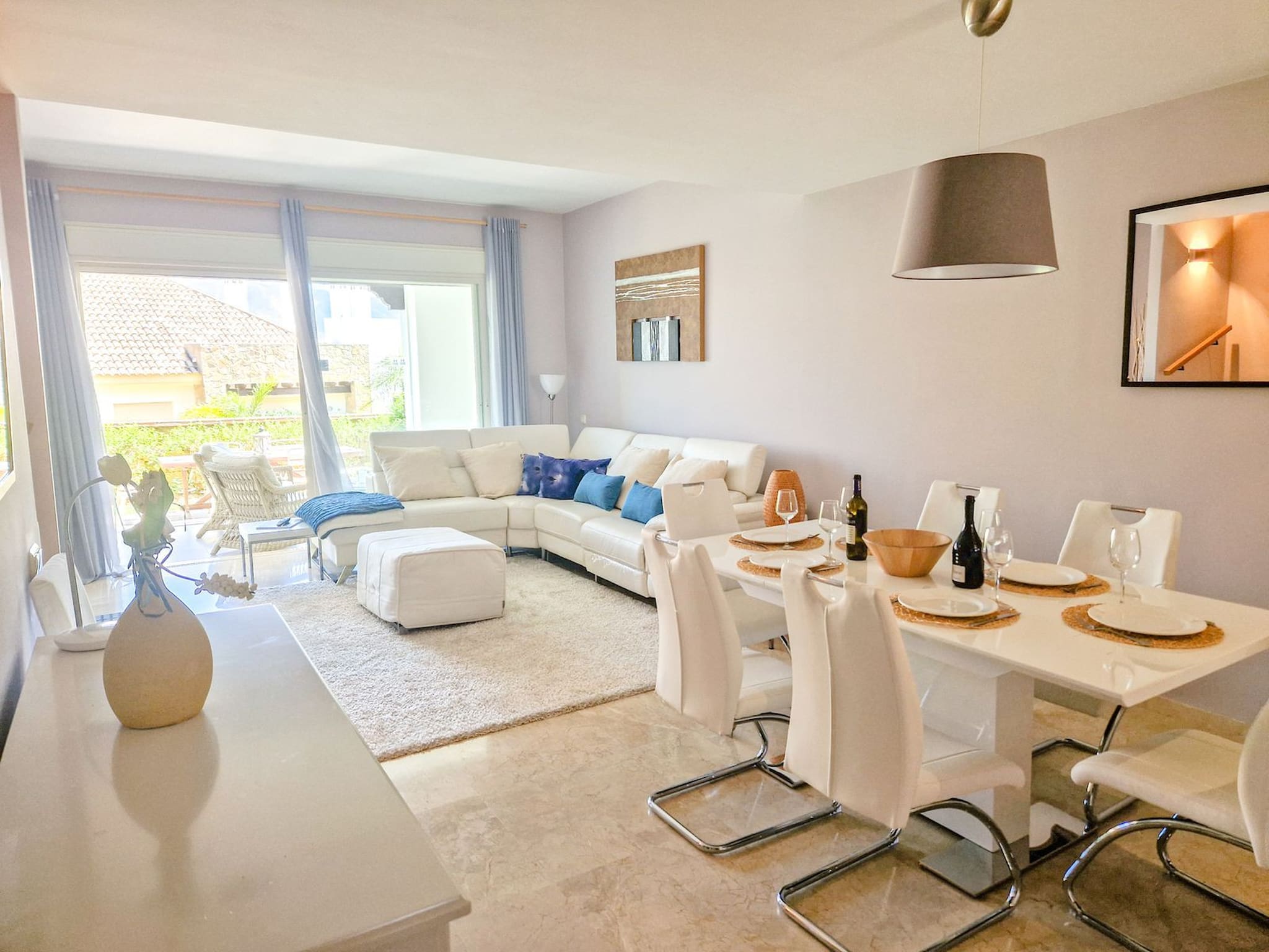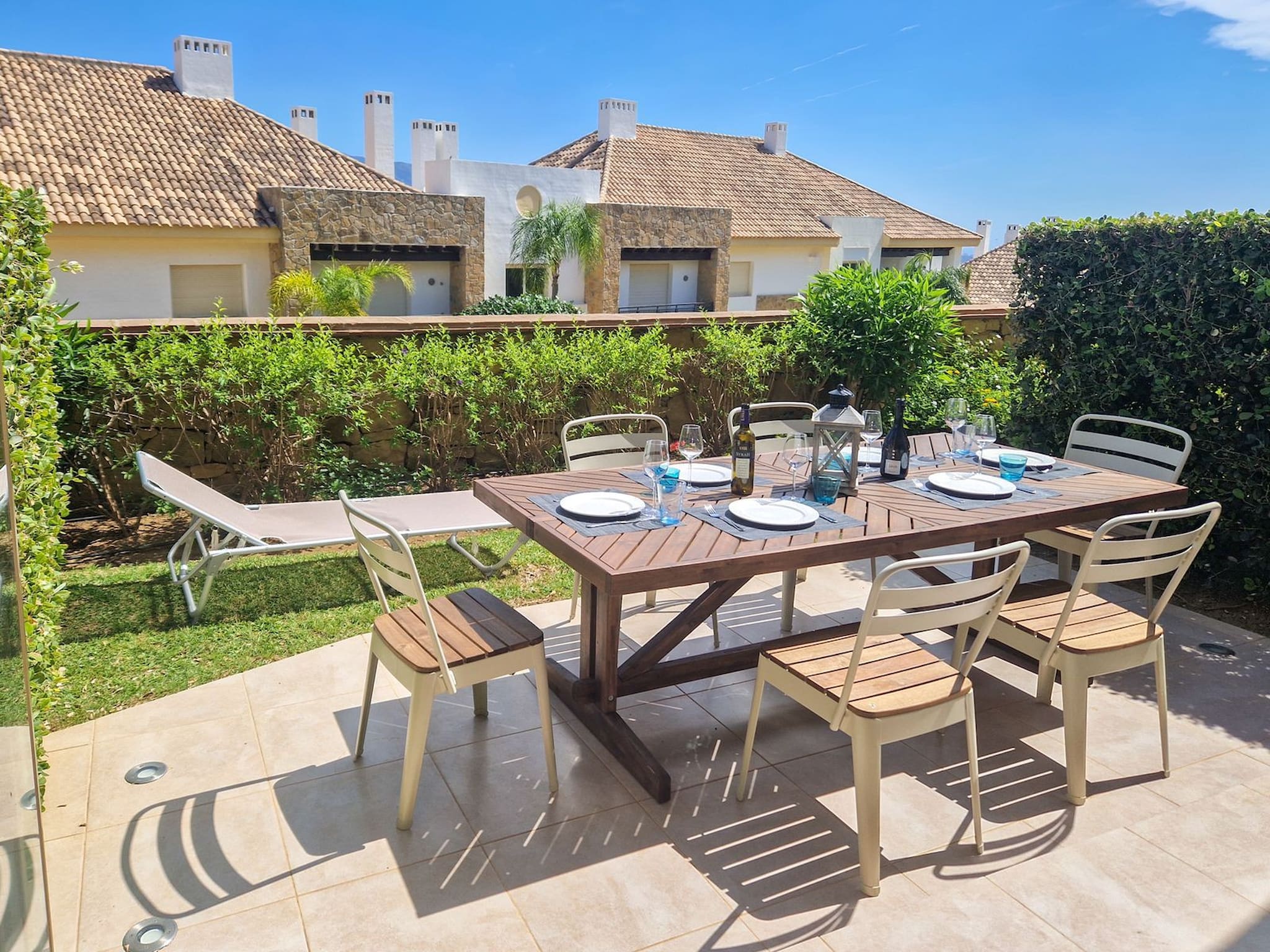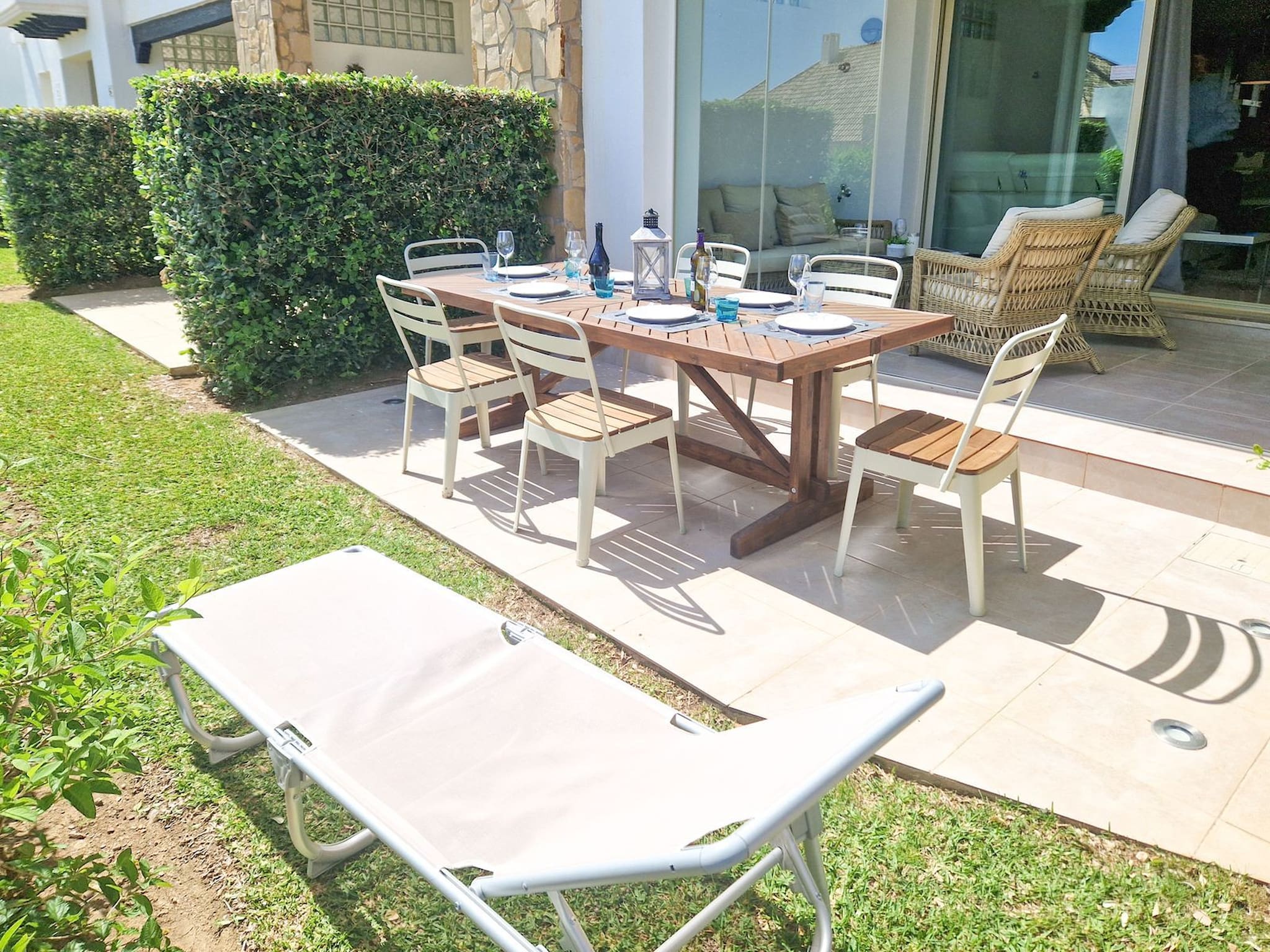 A través del salón/comedor, hay un espacio para comedor disponible para 6 personas, un sofá de cuero en forma de L con reclinable eléctrico, un televisor con canales internacionales y una estufa de leña para los meses más fríos del invierno. Desde el salón se accede a la terraza/jardín. La parte cubierta de la terraza tiene una zona de estar con mesa de centro y cortinas de cristal que dan la opción de tener una terraza abierta o cerrada. Hay una zona adicional de terraza que está abierta y parcialmente cubierta de césped, con una tumbona. Hay un aseo en esta planta.